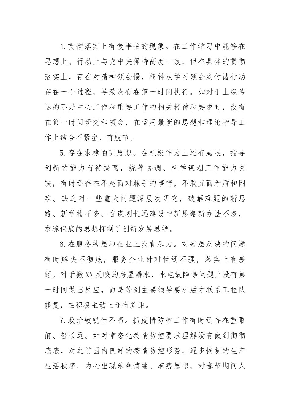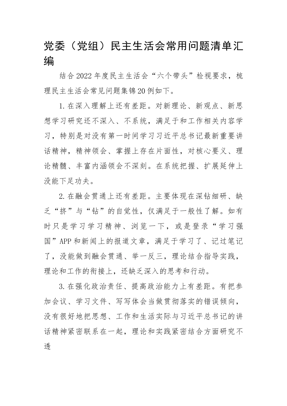 党委(党组)民主生活会常用问题清单汇编结合2022年度民主生活会“六个带头”检视要求,梳理民主生活会常见问题集锦20例如下。1.在深入理解上还有差距。对新理论、新观点、新思想学习研究还不深入、不系统,满足于和工作相关内容学习,特别是对没有第一时间学习习近平总书记最新重要讲话精神,精神领会、掌握上存在片面性,对核心要义、理论精髓、丰富内涵领会不深刻。在系统把握、扩展延伸上没能下足功夫。2.在融会贯通上还有差距。主要体现在深钻细研、缺乏“挤”与“钻”的自觉性,仅满足于一般性了解。如有时只是学习学习精神、浏览一下,或是登录“学习强国”APP和新闻上的报道文章,满足于学习了、记过笔记了,没能做到融会贯通、举一反三,理论结合指导实践,理论和工作的衔接上,还缺乏深入的思考和行动。3.在强化政治责任、提高政治能力上有差距。有把参加会议、学习文件、写写体会当做贯彻落实的错误倾向,没有很好地把思想、工作和生活实际与习近平总书记的讲话精神紧密联系在一起,理论和实践紧密结合方面研究不透4.贯彻落实上有慢半拍的现象。在工作学习中能够在思想上、行动上与党中央保持高度一致,但在具体的贯彻落实上,存在对精神领会慢,精神从学习领会到付诸行动存在一个过程,导致没有在第一时间执行。如对于上级传达的不是中心工作和重要工作的相关精神和要求时,没有在第一时间研究和领会,在运用最新的思想和理论指导工作上结合不紧密,有脱节。5.存在求稳怕乱思想。在积极作为上还有局限,指导创新的能力有待提高,统筹协调、科学谋划工作能力欠缺,有时还存在不愿面对棘手的事情,不敢直面矛盾和困难。缺乏对一些重大问题深层次研究,破解难题的新思路、新举措不多。在谋划长远建设中新思路新办法不多,求稳保底的思想抑制了创新发展思维。6.在服务基层和企业上没有尽力。对基层反映的问题有时解决不彻底,服务企业针对性还不强,落实上有差距。对于搬XX反映的房屋漏水、水电故障等问题上没有第一时间做出反应,而是等到主要领导要求后才联系工程队修复,在积极主动上还有差距。7.政治敏锐性不高。抓疫情防控工作有时还存在重眼前、轻长远。如对常态化疫情防控要求理解没有做到彻彻底底,对之前国内良好的疫情防控形势,逐步恢复的生产生活秩序,内心出现乐观情绪、麻痹思想,对春节期间人员流动可能带来的隐患认识不足,出现了松懈麻痹思想。8.主动担当作为有差距。工作中怕出乱子,遇到难题还存在等靠思想,经常依赖上级指示帮助,特别是对一些历史遗留问题参与过少,主动担当意愿不足,有时会回避矛盾问题,该担的责任没有主动担起来,认为“船到桥头自然直”,不是自己主动寻找对策,而是等待上级指示要求,缺少攻坚克难的精神,没有从根本上解决问题。9.工作标准有没有一以贯之。有时候在遇到工作时间紧、任务重时,只想尽快完成,会放松要求,降低标准,没有把工作做实、做深、做细,在开展XX集体经济制度改革工作时,面对县局的催促和工作完成情况通报,有先完成工作任务的想法,没有严格压实工作责任和严格把关资料。10.精神领会上还有差距。在精神领会和成果转化上做得不实。主要表现在,在落实工作上,措施还不精准,工作中欠缺大局意识。如在落实工作要求上,更多的是完成上级要求的“规定动作”,对工作措施也是照搬上级要求,缺少深入研究思考破解问题的创新举措,思路不宽。11.调研不持续不深入。深入调研数量和质量不高,对XX的情况没有切实掌握,大多下XX入组也只是走一走,听一听,看一看,真正坐下来充分交流时间不多,沟通深度不足,对XX的资源禀赋了解不细致12.主动谋划创新意识不强。贯彻新发展理念“开慢车”,在创新举措方面胆子不大、站位不高、思路不宽,还没有跳出一时一事的圈子,对全局的长远的缺少关注、思考不深、把握不准,作用发挥不强,为主要领导科学决策、出谋划策、提供依据做的还不到位。对一些新情况新问题,没有时时刻刻扑下身子去抓落实。13.党性修养锤炼没有“严格过硬”。在政治敏锐性和鉴别力还有待进一步提高,没有过硬的党性锤炼。有时在对社会上一些消极议论或者调侃所产生的负面影响认识不足,抵制不力...