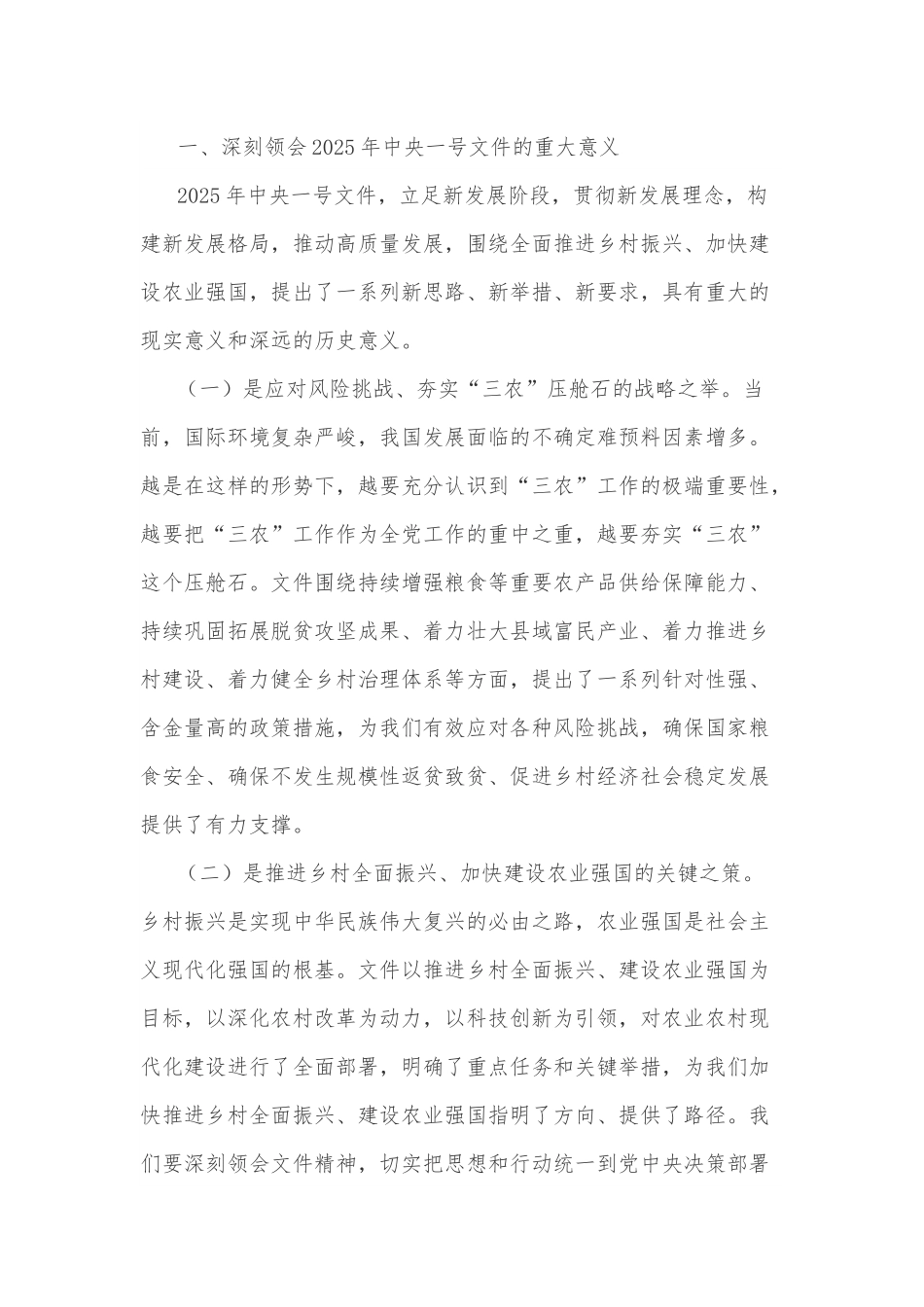 2025年市委书记在学习中央一号文件精神专题会上的研讨发言材料2篇同志们:在全国上下深入学习贯彻党的二十大和二十届二中、三中全会精神,全面推进中国式现代化建设的关键时期,2025年中央一号文件《中共中央国务院关于进一步深化农村改革扎实推进乡村全面振兴的意见》正式发布。这是党的十八大以来第13个指导“三农”工作的中央一号文件,充分体现了以习近平同志为核心的党中央对“三农”工作的高度重视和战略考量。文件深入贯彻落实习近平总书记关于“三农”工作的重要论述和重要指示精神,坚持和加强党对“三农”工作的全面领导,完整准确全面贯彻新发展理念,坚持稳中求进工作总基调,坚持农业农村优先发展,坚持城乡融合发展,坚持守正创新,锚定推进乡村全面振兴、建设农业强国目标,以改革开放和科技创新为动力,巩固和完善农村基本经营制度,深入学习运用“千万工程”经验,对2025年及今后一个时期“三农”工作作出了全面部署,为我们做好新时代“三农”工作提供了根本遵循和行动指南。下面,我谈几点体会,以供同志们参考。一、深刻领会2025年中央一号文件的重大意义2025年中央一号文件,立足新发展阶段,贯彻新发展理念,构建新发展格局,推动高质量发展,围绕全面推进乡村振兴、加快建设农业强国,提出了一系列新思路、新举措、新要求,具有重大的现实意义和深远的历史意义。(一)是应对风险挑战、夯实“三农”压舱石的战略之举。当前,国际环境复杂严峻,我国发展面临的不确定难预料因素增多。越是在这样的形势下,越要充分认识到“三农”工作的极端重要性,越要把“三农”工作作为全党工作的重中之重,越要夯实“三农”这个压舱石。文件围绕持续增强粮食等重要农产品供给保障能力、持续巩固拓展脱贫攻坚成果、着力壮大县域富民产业、着力推进乡村建设、着力健全乡村治理体系等方面,提出了一系列针对性强、含金量高的政策措施,为我们有效应对各种风险挑战,确保国家粮食安全、确保不发生规模性返贫致贫、促进乡村经济社会稳定发展提供了有力支撑。(二)是推进乡村全面振兴、加快建设农业强国的关键之策。乡村振兴是实现中华民族伟大复兴的必由之路,农业强国是社会主义现代化强国的根基。文件以推进乡村全面振兴、建设农业强国为目标,以深化农村改革为动力,以科技创新为引领,对农业农村现代化建设进行了全面部署,明确了重点任务和关键举措,为我们加快推进乡村全面振兴、建设农业强国指明了方向、提供了路径。我们要深刻领会文件精神,切实把思想和行动统一到党中央决策部署上来,坚定不移走中国特色社会主义乡村振兴道路,努力开创农业农村现代化建设新局面。(三)是增进农民福祉、促进共同富裕的务实之措。实现共同富裕,最艰巨最繁重的任务仍然在农村。文件始终坚持以人民为中心的发展思想,把增加农民收入、改善农民生活作为“三农”工作的出发点和落脚点,从做好“土特产”文章、“共同体”文章等方面入手,着力提升农民增收致富能力;从加强农村基础设施建设、提升农村公共服务水平、推进农村人居环境整治等方面入手,着力改善农村生产生活条件;从加强农村精神文明建设、推进农村移风易俗、加强农村基层党组织建设等方面入手,着力提升乡村治理水平,不断增强农民群众的获得感、幸福感、安全感。二、准确把握2025年中央一号文件的核心要义2025年中央一号文件紧扣“三农”工作新形势新任务新要求,聚焦重点领域和关键环节,提出了一系列具有创新性、突破性的政策举措,我们要准确把握其核心要义,切实把文件精神落到实处。(一)牢牢把握保障粮食安全这个首要任务。粮食安全是“国之大者”,是国家安全的重要基础。文件把持续增强粮食等重要农产品供给保障能力摆在首要位置,提出了一系列具体措施,包括深入推进粮油作物大面积单产提升行动、扶持畜牧业稳定发展、强化耕地保护和质量提升、推进农业科技力量协同攻关、加强农业防灾减灾能力建设、健全粮食生产支持政策体系、完善农产品贸易与生产协调机制、构建多元化食物供给体系、健全粮食和食物节约长效机制等。我们要深刻认识保障粮食安全的极端重要性,坚决扛稳粮食安全政治责任,采取有效措施,...