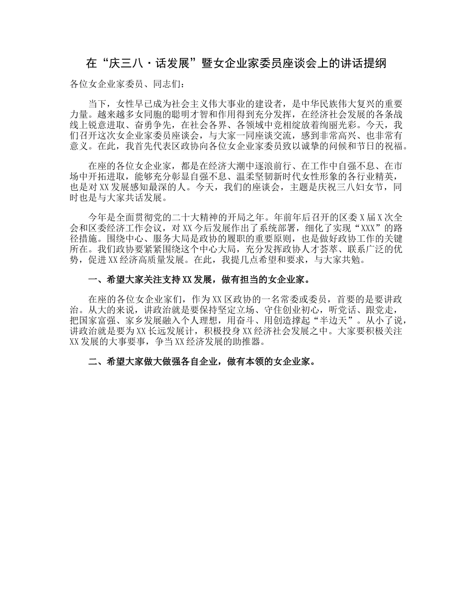 在“庆三八·话发展”暨女企业家委员座谈会上的讲话提纲各位女企业家委员、同志们:当下,女性早已成为社会主义伟大事业的建设者,是中华民族伟大复兴的重要力量。越来越多女同胞的聪明才智和作用得到充分发挥,在经济社会发展的各条战线上锐意进取、奋勇争先,在社会各界、各领域中竞相绽放着绚丽光彩。今天,我们召开这次女企业家委员座谈会,与大家一同座谈交流,感到非常高兴、也非常有意义。在此,我首先代表区政协向各位女企业家委员致以诚挚的问候和节日的祝福。在座的各位女企业家,都是在经济大潮中逐浪前行、在工作中自强不息、在市场中开拓进取,能够充分彰显自强不息、温柔坚韧新时代女性形象的各行业精英,也是对XX发展感知最深的人。今天,我们的座谈会,主题是庆祝三八妇女节,同时也是与大家共话发展。今年是全面贯彻党的二十大精神的开局之年。年前年后召开的区委X届X次全会和区委经济工作会议,对XX今后发展作出了系统部署,细化了实现“XXX”的路径措施。围绕中心、服务大局是政协的履职的重要原则,也是做好政协工作的关键所在。我们政协要紧紧围绕这个中心大局,充分发挥政协人才荟萃、联系广泛的优势,促进XX经济高质量发展。在此,我提几点希望和要求,与大家共勉。一、希望大家关注支持XX发展,做有担当的女企业家。在座的各位女企业家们,作为XX区政协的一名常委或委员,首要的是要讲政治。从大的来说,讲政治就是要保持坚定立场、守住创业初心,听党话、跟党走,把国家富强、家乡发展融入个人理想,用奋斗、用创造撑起“半边天”。从小了说,讲政治就是要为XX长远发展计,积极投身XX经济社会发展之中。大家要积极关注XX发展的大事要事,争当XX经济发展的助推器。二、希望大家做大做强各自企业,做有本领的女企业家。企业、企业家在经济社会发展中起着至关重要的作用。从一定意义上来说,企业好,XX经济发展才会好;企业强,XX经济综合实力就强。近年来,国家支持各类企业特别是民营企业发展的环境越来越宽松,对民营企业合法权益的保护更加完善。再加上XX区作为XX市的主城区,同时也高度重视化营商环境工作,各级各部门在依法依规保护企业合法权益、助企纾困等方面作了很多探索。可以说,当前正是价值投资、抢抓机遇的“入局点”。在座的各位女企业家要弘扬企业家精神,进一步发扬女性自强不息、温柔坚韧的时代基因,把握发展大势,深度融入区委、区政府确定的主导产业、发展方向,进一步优化企业管理结构,加强技术研发,增强企业核心竞争力和发展内生动力,促进企业可持续发展,不断把企业做大做强。放宽视野,主动谋划,紧盯前沿、抢抓风口,积极布局新赛道、进入新蓝海,培育壮大更多增长点、支撑点。同时,要毫不放松抓好除险保安工作,坚决杜绝“无知无畏”“敷衍应付”“侥幸赌博”三种心态,做到警钟长鸣,统筹发展和安全,坚决守住守牢底线,切实对自己负责、对职工负责、对企业负责、对社会负责。三、希望大家积极发挥桥梁作用,做有影响的女企业家。政协组织素来有人才荟萃、智力密集、联系广泛的优势。从目前的招商形势来看,在各地招引政策普遍趋同的大背景下,产业生态招商、产业链招商、以商招商比政策招商更有吸引力。各位企业家委员要盯紧产业链、供应链、朋友圈,多向贸易伙伴、商界朋友、企业集团讲讲“XX故事”,特别是多讲XX发展的形势和招商的政策,积极做好宣传推介、穿针引线、铺路搭桥的工作,推动更多的好项目和大项目落户XX,让更多的人才和资金汇聚XX,为XX经济发展增添强劲动能。最后,祝在座的各位女同胞们节日快乐、身体健康,祝各位女企业家委员事业兴旺发达!谢谢大家!