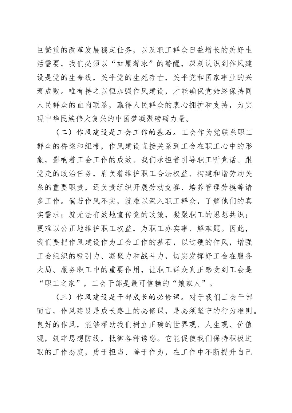 在总工会党组理论学习中心组深入贯彻中央八项规定精神学习教育研讨会上的交流发言同志们:党的作风建设,关乎党的形象,系于人心向背,决定事业兴衰。习近平总书记关于加强党的作风建设的重要论述,高屋建瓴、内涵深邃,为我们指明了前进方向,提供了根本遵循。市总工会作为全市各级地方总工会和市级各产业(行业)工会的领导机关,肩负着引领职工听党话、跟党走,维护职工合法权益,推动工会事业蓬勃发展的重任。在此背景下,深入学习贯彻习近平总书记重要论述,切实加强作风建设,对于我们履行使命、开创工会工作新局面,具有极其重要的现实意义。下面,我将围绕这一主题,与大家共同交流探讨。一、以“如履薄冰”的警醒,把准作风建设“方向盘”,校准思想之标(一)作风建设是党的生命线。作风彰显形象,作风关乎兴衰。党的作风,犹如一面镜子,清晰映照出党的性质宗旨与初心使命。回顾党的光辉历程,无论是革命战争年代的艰苦奋斗,还是社会主义建设时期的激情创业,亦或是改革开放以来的开拓进取,优良作风始终是我们党攻坚克难、不断前行的强大动力。从“三大纪律八项注意”到中央八项规定,从延安整风运动到当前持续深化的作风建设,党始终将作风建设摆在突出位置,常抓不懈。在新时代,面对复杂多变的国际形势、艰巨繁重的改革发展稳定任务,以及职工群众日益增长的美好生活需要,我们必须以“如履薄冰”的警醒,深刻认识到作风建设是党的生命线,关乎党的生死存亡,关乎党和国家事业的兴衰成败。唯有持之以恒加强作风建设,才能确保党始终保持同人民群众的血肉联系,赢得人民群众的衷心拥护和支持,为实现中华民族伟大复兴的中国梦凝聚磅礴力量。(二)作风建设是工会工作的基石。工会作为党联系职工群众的桥梁和纽带,作风建设直接关系到工会在职工心中的形象,影响着工会工作的成效。我们承担着引导职工听党话、跟党走的政治任务,肩负着维护职工合法权益、构建和谐劳动关系的重要职责,还负责组织开展劳动竞赛、培养管理劳模等诸多工作。倘若作风不实,就难以深入职工群众,了解他们的真实需求;就无法有效地宣传党的政策,凝聚职工的思想共识;更难以公正地维护职工权益,为职工办实事、解难题。因此,我们要把作风建设作为工会工作的基石,以过硬的作风,增强工会组织的吸引力、凝聚力和战斗力,切实发挥好工会在服务大局、服务职工中的重要作用,让职工群众真正感受到工会是“职工之家”,工会干部是最可信赖的“娘家人”。(三)作风建设是干部成长的必修课。对于我们工会干部而言,作风建设是成长路上的必修课,是必须坚守的行为准则。良好的作风,能够帮助我们树立正确的世界观、人生观、价值观,筑牢思想防线,抵御各种诱惑。它能促使我们保持积极进取的工作态度,勇于担当、善于作为,在工作中不断提升自己的能力和素质。同时,优良作风还有利于我们与同事和谐相处,形成团结协作的工作氛围,共同推动工会事业发展。反之,作风出了问题,不仅会影响个人的形象和声誉,还可能导致工作失误,损害职工利益,甚至走上违法违纪的道路。所以,我们要时刻以高标准严格要求自己,加强自我约束,注重品德修养,不断锤炼过硬作风,为个人成长和事业发展奠定坚实基础。二、以“刮骨疗毒”的勇气,直面作风建设“拦路虎”,剖析问题之症(一)思想认识层面。一是部分同志对作风建设的重要性认识不足,存在麻痹大意思想,认为作风问题是小事,无关紧要,没有将其上升到关系党和工会事业发展全局的高度来对待。“千里之堤,溃于蚁穴”,思想上的轻视往往是作风问题滋生的根源。二是学习习近平总书记关于加强党的作风建设重要论述不够深入系统,缺乏学深悟透的精神,未能真正将理论学习转化为实际行动的指南,在工作中不能自觉运用相关理论指导实践,导致思想与行动脱节。三是一些同志存在因循守旧、固步自封的思想,缺乏创新意识和进取精神,习惯于按老经验、老办法办事,对新形势下工会工作面临的新问题、新挑战缺乏敏锐的洞察力和应对能力,制约了工作的创新发展。(二)工作态度层面。一是工作中存在敷衍塞责、得过且过的现象,对工作任务不认真对待,只求完成,不求质量...