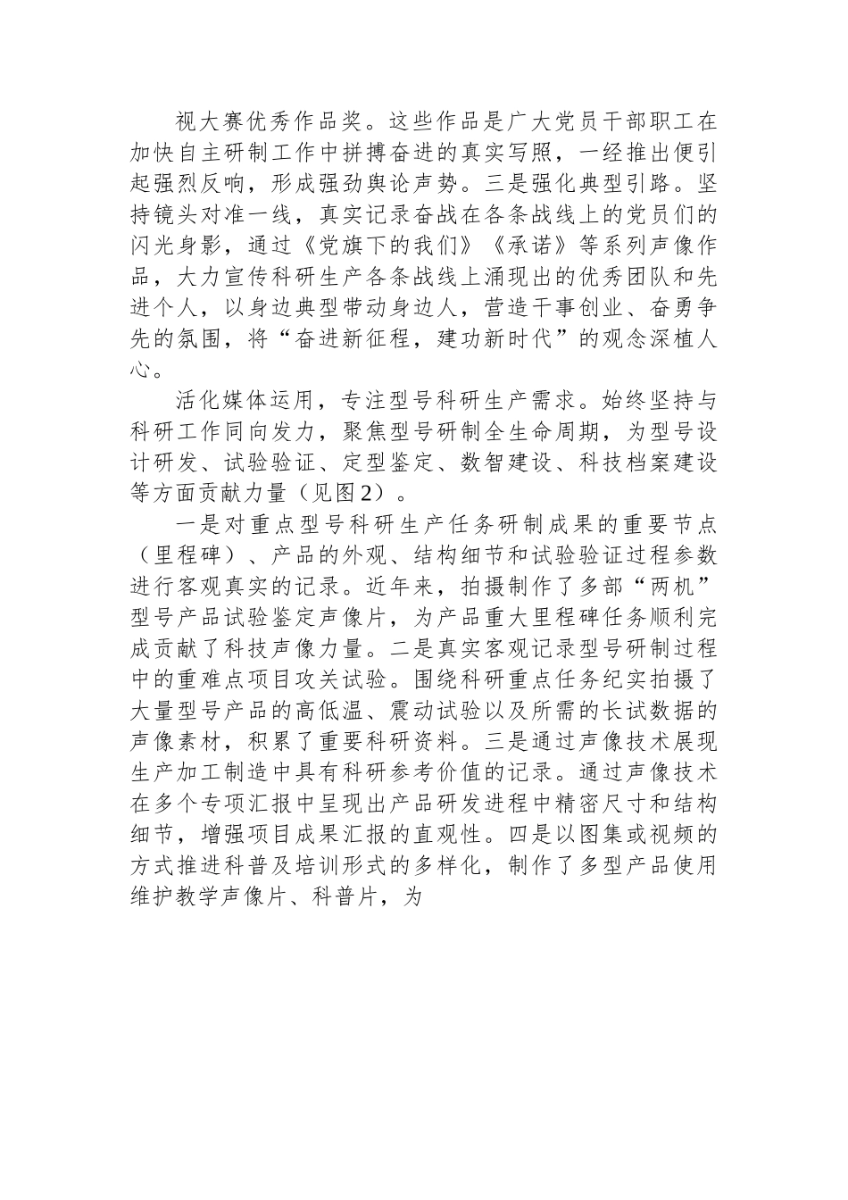 国企创建党建品牌经验做法:“12345”声像工作实践体系构筑党建特色宣传品牌近年来,XX党委始终坚持以党建为统领,牢牢把握正确的政治方向、舆论导向和价值取向,以思想政治工作为核心,以打造特色宣传品牌为抓手,融入中心推进企业各类宣传媒体综合发力、协同联动,探索出了“一核二维三层四向五愿”(简称12345)声像工作实践体系,在第一时间以视听结合的方式把党的政治理论、集团战略部署、公司改革发展、科研生产动态、员工创新创造、企业奋斗精神等转化成有筋骨有道德有温度的宣传作品,通过讲好西控故事,有效发挥出了聚焦中心、统一思想,服务大局、凝心铸魂的重要作用。一、突出一个核心,强化党建引领XX党委坚持以习近平新时代中国特色社会主义思想和党的二十大精神为指引,重点围绕党中央重大决策部署、党内主题教育,尤其是聚焦习近平总书记对航空发动机事业做出的重要指示批示精神等内容,践行集团“凝聚人心加快研发、敢于胜利”的工作理念,开展声像特色宣传。近年来,通过制作20余部党的十九大和党的二十大等中央重要会议精神、习近平总书记重要指示批示精神解读为主题的声像片,推动党的创新理论入脑入心,筑牢政治信仰上的“压舱石”。针对科研生产任务持续上量,通过每季度至少1部“形势任务教育”专题声像作品,全面聚焦集团和公司的内外部形势,围绕重点工作任务,强化全员责任担当。紧跟科研生产动态,以深推集团党组1号文件落地落实,服务重点产品研制全生命周期开展声像工作,制作多部科技声像片,助力科技创新、研发提速。持续融入、服务科研生产工作,动态跟踪摄制“铸心”新长征党员突击队、质量放心党员攻坚案例微视频30余部,着力用先进典型的吸引力、感染力凝聚企业发展正能量,注入干事创业新动能。二、着力两个维度,做实声像效果立足新时代的历史坐标,聚焦“动力强军,科技报国”的具体实践,始终坚持围绕中心,服务大局,用镜头笔头奋力记录精彩的西控故事,描绘动人心弦的发展画卷。坚持守正创新,专注思想价值引领需求。承担起宣传思想工作的使命任务,强化宣传思想政治引领。一是强化舆论导向。结合重大节日和纪念日等开展专题宣传策划,通过制作主题视频,形成强劲宣传声势。先后制作由近1600名干部职工参与的主题视频《我爱你,中国》和由100名优秀共产党员参与的主题视频《你的名字》,经微信公众号推送后,单日阅读量均破万次,广大干部职工竞相转发、评论。主题宣传走进了广大干部职工的心窝里,引导大家积极践行国家利益至上的价值观,加速奋进“铸心”新征程。二是强化时代气息。围绕企业改革发展历程,创作了多部以“忠诚”“奋斗”为主题的微电影,用好作品讴歌新时代新气象。先后制作《爸爸的时间去哪了》《因为有你》《同心追梦》《匠行者》等9部微电影。其中,《爸爸的时间去哪了》获得首届全国职工微影视大赛优秀作品奖。这些作品是广大党员干部职工在加快自主研制工作中拼搏奋进的真实写照,一经推出便引起强烈反响,形成强劲舆论声势。三是强化典型引路。坚持镜头对准一线,真实记录奋战在各条战线上的党员们的闪光身影,通过《党旗下的我们》《承诺》等系列声像作品,大力宣传科研生产各条战线上涌现出的优秀团队和先进个人,以身边典型带动身边人,营造干事创业、奋勇争先的氛围,将“奋进新征程,建功新时代”的观念深植人心。活化媒体运用,专注型号科研生产需求。始终坚持与科研工作同向发力,聚焦型号研制全生命周期,为型号设计研发、试验验证、定型鉴定、数智建设、科技档案建设等方面贡献力量(见图2)。一是对重点型号科研生产任务研制成果的重要节点(里程碑)、产品的外观、结构细节和试验验证过程参数进行客观真实的记录。近年来,拍摄制作了多部“两机”型号产品试验鉴定声像片,为产品重大里程碑任务顺利完成贡献了科技声像力量。二是真实客观记录型号研制过程中的重难点项目攻关试验。围绕科研重点任务纪实拍摄了大量型号产品的高低温、震动试验以及所需的长试数据的声像素材,积累了重要科研资料。三是通过声像技术展现生产加工制造中具有科研参考价值的记录。通过声像技术在多个专项汇报中呈现出产品研发进...