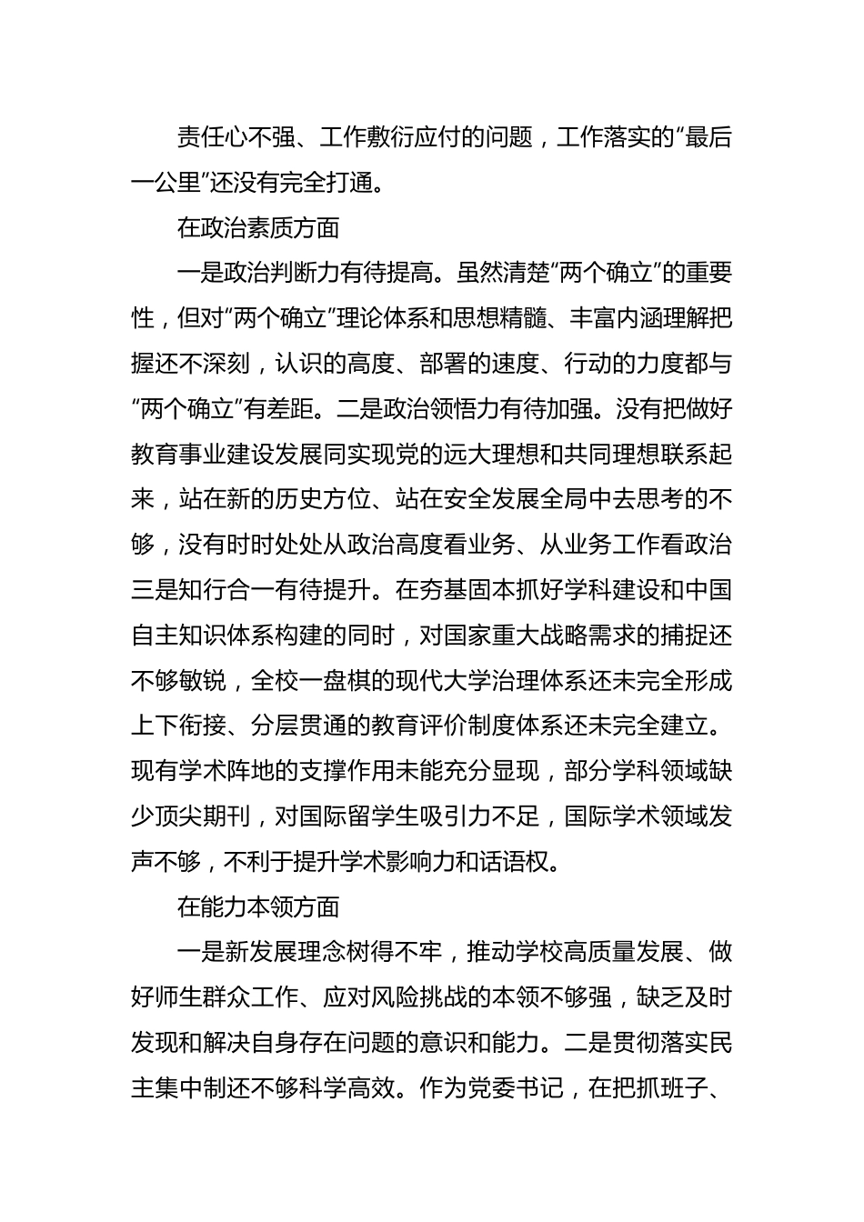 党委书记党内主题教育专题民主生活会对照检查材料(高校)根据《中共中央关于在全党深入开展学习贯彻习近平新时代中国特色社会主义思想主题教育的意见》、主题教育民主生活会通知要求,我聚焦民主生活会主题,深学理论、广纳群言、开诚谈心,并结合工作、学习和思想实际认真对照、仔细检查,深入剖析,现将有关情况汇报如下:一、存在的主要问题在理论学习方面一是学习主动性仍然不足。有时不能很好地处理工学矛盾,导致主动跟进学的能动性、系统性不够,存在零散化、碎片化、快餐化现象,存在以干代学、被动学习现象有时以实用主义态度对待学习,急用先学、现用现学,学习不深不透不系统,更多只满足于应付工作。二是融会贯通仍需加强。还没有较好地将习近平新时代中国特色社会主义思想与高校事业紧密联系起来,推动高校工作主动融入当地Xx战略”的举措还不多,工作创新发展的思考不够深、步子不够大。三是工作落实还有差距。虽然定期主持召开党委常委会研究“三重一大”等事项,但督导检查不够经常、跟踪问效不够深入、责任追究不够严格,导致有些工作措施在机关、基层没有得到很好落实。从去年各项工作考核排名情况来看,我校基础工作扣分最多,充分暴露出院校两级不同程度存在责任心不强、工作敷衍应付的问题,工作落实的“最后一公里”还没有完全打通。在政治素质方面一是政治判断力有待提高。虽然清楚“两个确立”的重要性,但对“两个确立”理论体系和思想精髓、丰富内涵理解把握还不深刻,认识的高度、部署的速度、行动的力度都与“两个确立”有差距。二是政治领悟力有待加强。没有把做好教育事业建设发展同实现党的远大理想和共同理想联系起来,站在新的历史方位、站在安全发展全局中去思考的不够,没有时时处处从政治高度看业务、从业务工作看政治三是知行合一有待提升。在夯基固本抓好学科建设和中国自主知识体系构建的同时,对国家重大战略需求的捕捉还不够敏锐,全校一盘棋的现代大学治理体系还未完全形成上下衔接、分层贯通的教育评价制度体系还未完全建立。现有学术阵地的支撑作用未能充分显现,部分学科领域缺少顶尖期刊,对国际留学生吸引力不足,国际学术领域发声不够,不利于提升学术影响力和话语权。在能力本领方面一是新发展理念树得不牢,推动学校高质量发展、做好师生群众工作、应对风险挑战的本领不够强,缺乏及时发现和解决自身存在问题的意识和能力。二是贯彻落实民主集中制还不够科学高效。作为党委书记,在把抓班子、带队伍、管思想、促发展方面履职不够到位,在民主集中制的决策质量和执行质量方面,仍然存在一些差距。比如,在民主决策过程中,领导班子对于如何辩证把握“服从多数”与“尊重少数”的有机统一,践行得还不够充分,有时为了提高决策效率,存在“以票决策”的简单化倾向,忽视了决策的质量,没有耐心转化不够妥当的否定意见,有理有据地引导改变有失偏颇的观点。三是在“两个维护”带头落实上有差距。作为党员领导干部,自己多年来始终坚持令行禁止,时刻把党中央的要求作为凝心聚力、开展工作的根本遵循和指引,但在“两个维护”上还有差距,认为自觉做到讲政治、守规矩就是“两个维护”,没有结合思想、信念、政治站位深刻理解、分析“两个维护”对于全党工作的定海神针作用,没有深入理解“两个维护”对于推动中国式现代化发展的重要作用,在落实上肤浅地认为自己践行了即是贯彻执行了,没有充分发挥带头践行“两个维护”的表率作用。在担当作为方面一是干事劲头还不够足。遇到工作时间紧、任务重时,有时会想着尽快完成,导致放松了要求、降低了标准,对不急的工作先放一放,那种事不过夜、只争朝夕的劲头有所下降。比如,对切实提升部分优势学科国际影响力和国际竞争力的把握和认识还有不足,少数传统优势学科发展趋缓,交叉学科等新生力量还没有完全成长起来。另外,在学科建设上还未能将开拓进取的精神发扬到底,部分双一流学科建设情况相对进展较慢,仍需加快推进。二是斗争精神还有不足。批评和自我批评武器用的不好,对于班子成员分管业务口的工作出现问题时,有时碍于情面直接批评少,不愿触及深层次的矛盾,缺乏主动斗争的...