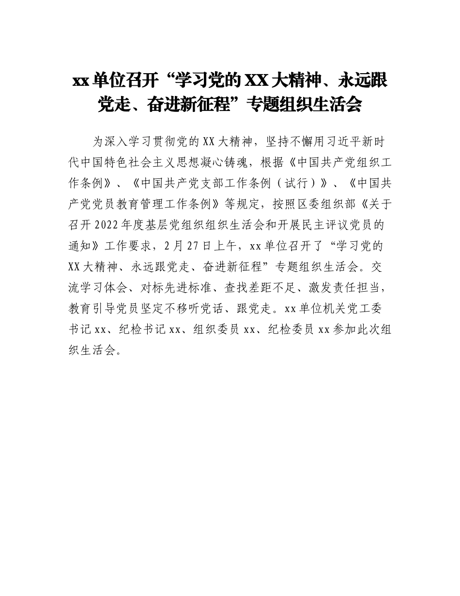 xx单位召开“学习党的XX大精神、永远跟党走、奋进新征程”专题组织生活会为深入学习贯彻党的XX大精神,坚持不懈用习近平新时代中国特色社会主义思想凝心铸魂,根据《中国共产党组织工作条例》、《中国共产党支部工作条例(试行)》、《中国共产党党员教育管理工作条例》等规定,按照区委组织部《关于召开2022年度基层党组织组织生活会和开展民主评议党员的通知》工作要求,2月27日上午,xx单位召开了“学习党的XX大精神、永远跟党走、奋进新征程”专题组织生活会。交流学习体会、对标先进标准、查找差距不足、激发责任担当,教育引导党员坚定不移听党话、跟党走。xx单位机关党工委书记xx、纪检书记xx、组织委员xx、纪检委员xx参加此次组织生活会。会议前期,网格党支部认真组织党员进行了集中学习和研讨交流,广泛开展谈心谈话和征求意见。各网格党支部结合本支部实际,采取集体学习和个人自学方式,组织党员原原本本、逐字逐句学党的XX大报告和党章,学习习近平总书记在党的二十届一中全会上的重要讲话精神,全面准确领会党的XX大精神。注重运用《党的XX大报告学习辅导百问》《XX大党章修正案学习问答》等辅导材料开展学习。对不能参加集中学习的老党员、流动党员等群体,党支部通过送学上门、线上学习等方式,确保学习教育全覆盖。党支部委员之间、党支部委员与党员之间、党员和党员之间开展谈心谈话,征求对党支部的意见建议,有针对性地做好党员思想政治工作。通过群众提、自己找、上级点、互相帮,进一步找准问题,对查摆的问题分别形成问题清单。党员对照习近平总书记的号召和要求,对照党员义务,全面查找在政治信仰、党员意识、理论学习、能力本领、作用发挥、纪律作风等方面的不足和问题,认真撰写对照检查材料,形成问题清单,为此次组织生活会奠定了扎实基础。会上,支部书记作2022年组织生活会全面对照检查,剖析根源,并提出下一步整改措施和努力方向。各网格党支部书记代表党支部委员会述职,报告一年来党支部的工作情况,检查党支部建设存在的问题。大家纷纷表示:在以后的工作中,我们还要加强理论和业务学习,更新知识,解放思想,拓宽思路,勤奋工作,我将继续秉承“求真务实、服务于民”的宗旨,求真务实扎实做好各项社区工作。述职后,党员们对党支部委员会的工作、作风等进行评议,填写《党员对党支部委员会评议表》。接着,各网格支部根据党员人数等实际情况,采取个人自评、党员互评的方式分别开展了批评和自我批评。通过开展批评与自我批评,引导和鼓励广大党员增强政治意识和大局意识,讲党性、讲原则、讲真话、讲实话,自觉地经受党内生活煅炼,自觉增强党性修养,进一步统一思想、明确目标、消除隔阂、凝聚力量。在自我批评中各位党员直奔主题,细致全面查问题,深挖根源找差距,敞开心扉谈不足;互评中大家不遮掩问题、不回避矛盾,见人见事见思想。全体党员在互帮互助、互相监督中提高了政治站位、增强了党性修养、改进工作作风。随后,党支部组织全体党员开展了民主评议党员,针对学习、工作、生活等实际表现进行党员互评。最后,采取发放测评表的方式,组织党员按照“优秀”、“合格”、“基本合格”、“不合格”进行民主测评。党支部委员会将在会后综合分析党员日常表现,结合民主测评结果,实事求是地对每名党员提出评定意见并向本人反馈。会议尾声,xx单位机关党工委书记xx对网格党支部组织生活会进行点评,并对以后的支部党建工作进行了专业的讲解和指导。xx书记认为此次组织生活会会前准备充分,具体程序严明,相互批评意见开诚布公、直接了当,起到了红脸出汗、排毒治病的效果,达到了统一思想、加强团结、互相促进、共同提高的目的。党员们广开言路,畅所欲言,体现了民主氛围,解决了问题,增进了团结,促进了工作,达到了本次会议预期的目的。同时,也找出了问题,剖析了根源,明确了努力方向和具体措施。此次活动结束后,大家纷纷表示:参加了今天的活动,明确了作为一名党员努力的方向和前进的动力,在今后的工作中和生活中会强化党性意识,继续学习XX大精神和习近平新时代中国特色社会主义思想,积极发挥正能量,永远跟党走,以实际行动奋进新征程。
