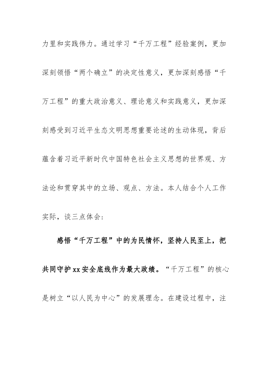 “千万工程”经验学习交流研讨材料(党建专干)“千万工程”是习近平总书记在浙江工作时亲自谋划、亲自部署、亲自推动的一项重大决策,也是习近平新时代中国特色社会主义思想在之江大地的生动实践。20年来,“千万工程”先后经历了示范引领、整体推进、深化提升、转型升级等四个阶段,经历了从温饱型生存需求向小康型发展和共富型发展需求的演变,实现了从“千村示范、万村整治”向“千村精品、万村美丽”,再向“千村未来、万村共富”的迭代升级。“千万工程”贡献巨大,意义深远,不仅造就了浙江万千美丽乡村,造福了万千农民群众,也充分彰显了习近平新时代中国特色社会主义思想的真理力里和实践伟力。通过学习“千万工程”经验案例,更加深刻领悟“两个确立”的决定性意义,更加深刻感悟“千万工程”的重大政治意义、理论意义和实践意义,更加深刻感受到习近平生态文明思想重要论述的生动体现,背后蕴含着习近平新时代中国特色社会主义思想的世界观、方法论和贯穿其中的立场、观点、方法。本人结合个人工作实际,谈三点体会:感悟“千万工程”中的为民情怀,坚持人民至上,把共同守护xx安全底线作为最大政绩。“千万工程”的核心是树立“以人民为中心”的发展理念。在建设过程中,注重征询群众意见,激发群众主人翁意识,引领人人参与美丽乡村建设,让广大农民在乡村振兴中有更多获得感、幸福感。“千万工程”不是用砖瓦建设出来的,他是党心和民心的铸就,是历史的选择。“千万工程”从人居环境整治入手,由环境变革触发生态变革,从而形成一场乡土垂整、乡村重塑、城乡重构的社会变革,其蕴含的人民立场,既是做好xx站党建工作的落脚点,更是正确政绩观的出发点。保护好生态环境、守护好zx环境安全是国之大者,对标对表厅党组的部署和要求,我们要时刻坚守人民立场,强化生态为民意识。作为党务专干,应结合xx站实际抓好常规党建工作。一方面,在学习上求“实”,在认真落实“三会一课”、发展党员、党费收缴等基础上,垂点结合主题教育,积极主动完成厅党组布置的各项工作任务,制定年度学习计划,周密做好xx主题教育集体学习、交流研讨等组织服务保障,为建设“五好”党支部贡献个人力里。另一方面,在服务上创“优”,积极发挥参谋助手作用,深刻领会上级文件精神,增强全局意识、服务意识、超前意识,提高办公室工作的主动性和能动性,忠于职守,乐于奉献,在工作岗位上积极发挥一名党员的先锋模范作用。感悟“千万工程”中的求实作风,坚持实事求是,把调查研究、建言献策作为推动工作的有效途径。2002年底,履新浙江、时任浙江省委书记的习近平同志深入展开调查研究,寻求破解统筹城乡发展的路径。2003年6月,习近平总书记审时度势,因地制宜,针对浙江省城乡发展实际,做出了实施“千万工程”的垂大决策,从全省迭择1万个左右的行政村进行全面整治,把其中1000个左右的中心村建成全面小康示范村,“千村示范、万村整治”应运而生,走出了一条建设美丽乡村的特色之路。当下,我们树立正确政绩观,就是要学习“千万工程”的求实作风,坚持实事求是,办实事、做实功、出实招、求实效。作为普通党员,立足xx发展实际,结合主题教育理论学习、主题党日、组织生活等,积极参与建言献策活动,积极发挥承上启下、联系左右、协调各方的作用,脚踏实地完成领导交办的各项工作任务。感悟“千万工程”中的方法论,坚持“功成不必在我”的政绩观,把xx党建工作作为一种责任担当。“千万工程”20年的实践发展,每一个阶段都随着群众需求升级而发展。“千万工程”是基础工程、龙头工程、生态工程、民心工程,更是伟大的乡村“探月”工程、民族筑梦工程、时代共富工程,为我们提供了很好的系统理论和方法,那就是坚持从实际出发想问题、做决策、办事情。认准目标,一任接着一任干、一锤接着一锤敲,久久为功,充分体现了“功成不必在我”的政绩观和“功成必定有我”的责任担当。要持续加强政治理论学习,提高思想觉悟,提升文字工作能力,勤学习、勤思考、勤实践,努力做到张口能说、提笔能写、有事能干、无事能思。将单位发展与个人成长紧密结合起来,遇事不退避、不推诿,真正担当起服...