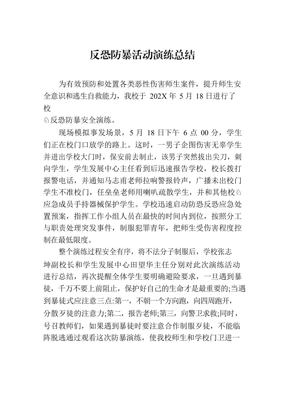 为有效预防和处置各类恶性伤害师生案件,提升师生安全意识和逃生自救能力,我校于202X年5月18日进行了校♘反恐防暴安全演练。现场模拟事发场景,5月18日下午6点00分,学生们正在校门口放学的路上。这时,一男子企图伤害无辜学生并进出学校大门时,保安前去制止,该男子突然拔出尖刀,刺向学生,学生发展中心主任看到后迅速报告学校,校长拨打报警电话,并通知马志甫老师拉响警报铃声,广播未出校门学生不准校门,任垒垒老师用喇叭疏散学生,并和其他校♘应急成员手持器械保护学生。学校迅速启动防恐反恐应急处置预案,指挥工作小组人员在最快的时间内到位,按照分工与职责处理突发事件,制服犯罪青年,把师生受伤害程度控制在最低限度。整个演练过程安全有序,将不法分子制服后,学校张志坤副校长和学生发展中心田望华主任分别对此次演练活动进行总结,再次提醒全体学生要明确避险要求,一旦遇到暴徒,千万不要上前阻止,保护好自己的生命才是最重要的;当遇到暴徒式应注意三点:第一,不朝一个方向跑,向四周跑开,分散歹徒的注意力;第二,报告老师;第三,向警卫求救;同时,号召教师们,如果遇到暴徒时要注意合作制服歹徒,不能临阵脱逃通过观看这次防暴演练,使我校师生和学校门卫进一步了解非法侵入事件应对的行动步骤,明确各自的分工与职责,提高师生防范、自救、合作意识与能力等安全意识。进一步提高了学校安全管理水平,强调各班级要最大限度地保护全校师生的生命安全。强调全校教师围绕“十个到位、两个加强”管安全,即安全文明校创建工作认识到位、责任♘落实到位、资金投入到位、安全教育到位、制度建立到位、安全管理到位、基础设施到位、环境整治到位、演练到位、资料整理到位。工作中,能够加强管理,在校安全文明创建上♘管理细致,精益求精,同时要加强校及周边环境的整治,♘为老师和学生营造一个舒适的学习环境。