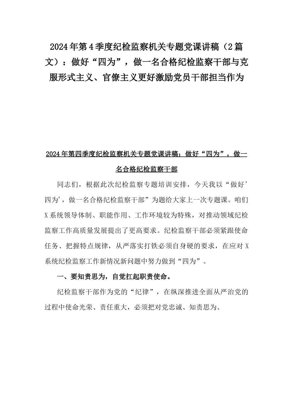 2024年第4季度纪检监察机关专题党课讲稿(2篇文):做好“四为”,做一名合格纪检监察干部与克服形式主义、官僚主义更好激励党员干部担当作为2024年第四季度纪检监察机关专题党课讲稿:做好“四为”,做一名合格纪检监察干部同志们,根据此次纪检监察专题培训安排,今天我以“做好'四为',做一名合格纪检监察干部”为题给大家上一次专题课。咱们X系统领导体制、职能作用、工作环境较为特殊,对推动领域纪检监察工作高质量发展提出了更高要求。纪检监察干部必须紧跟使命任务、把握特点规律,从严落实打铁必须自身硬的要求,在应对X系统纪检监察工作新情况新问题中努力做到“四为”。一、要知责思为,自觉扛起职责使命。纪检监察干部作为党的“纪律”,在纵深推进全面从严治党的过程中使命光荣、责任重大,必须把对党忠诚、知责思为、增强主动作为首要品质、核心品质。一是有信念坚定的政治底色。理想信念的坚定来自思想理论的坚定。纪检监察干部要深刻认识全面从严治党是新时代党的自我革命的伟大实践,深刻认识正风肃纪反腐是推进党的自我革命的重要抓手,深刻认识纪检监察机关是推进全面从严治党的重要力量,必须站在坚决拥护“两个确立”、做到“两个维护”的高度,肩负起为党分忧、为党尽责的历史使命。二是有勤勉敬业的责任意识。处在监督检查和审查调查一线,快节奏、高强度的工作任务是家常便饭。纪检监察干部要守得住清苦、耐得住寂寞,时常提振“一日不为、三日不安”的精气神,该做的事知重负重、攻坚克难,该负的责挺身而出、冲锋在前。纪检监察机关是党内监督和领域检查的专责机关,纪检监察干部必须自觉站在增强党的执政能力、永葆党的先进性和纯洁性的高度,以更高的觉悟致力于X系统反腐倡廉、维护群众利益、确保政令畅通等工作,时刻不忘肩负的使命责任。三是有为民服务的真挚情怀。纪检监察工作要始终不忘践行群众路线,纪检监察干部必须有贴近基层、贴近群众的归属感,建立与群众的紧密联系,对于群众反映的作风问题严肃查处,有爱憎分明的是非感,坚决与“微腐败”“暗腐败”现象作斗争,自觉为群众服务、回应群众所盼、维护群众利益。二、要担当能为,聚焦主业提升本领。X系统职能任务多样、业务交叉,纪检监察工作职责范围广泛,监督对象复杂多元,涉及政策法规繁杂,纪检监察干部必须适应新形势、新变化,把锤炼过硬本领、提高履职能力作为基础工作和重要内容来抓。一是提升政治把握能力。干部干好工作,政治能力是第一位的。要坚持以学增智,用党的创新理论武装头脑,系统学习习近平总书记关于全面从严治党重要论述,理论联系实际、融会贯通,不断增强政治判断力;善于从政治角度观察、分析和解决问题,联系党的路线方针政策、政治纪律和政治规矩,科学把握形势,不断提高政治领悟力;时刻胸怀大局,紧跟掌握党中央的重大研判、战略意图和决策部署,时时处处对标看齐落细落实、真抓实干,把观大局与办实事、谋长远与抓当下结合起来,不断提高政治执行力。二是持续聚焦主责主业。纪检监察干部作为政治干部,要成为纪检工作和业务工作两方面的行家里手,才能把政治工作服务保证高质量建设的要求落到实处。不管是处在领导链上,还是处在建设链、管理链、监督链上,都要把谋发展作为最大职责,持续强化战时纪检监察工作课题研究深度,积极参加重点业务等实践锻炼,全时跟进、全程保障、全面渗透,提升纪检监察工作贡献率。三是提高纪法运用能力。纪检监察干部要做到一专多能,既要熟知党纪国法,精通纪检监察基本法规、基本程序、基本方法,也要了解财务、工程、采购、人力等方面的业务规定,还要知晓其他领域行业部门有关规章制度,牢固树立法律意识、程序意识、证据意识。准确把握纪法衔接的内在逻辑关系,把纪律规矩挺在前面,做到纪在法前、纪严于法,准确规范运用“四种形态”,做到严有标准、宽有尺度、宽严相济,实现纪法情理贯通融合。三、要创新善为,持续推动作用发挥。X系统人少事多矛盾突出,纪检监察干部很多都身兼数职,工作精力分散,工作中必须讲求实际实效,完成教育人、监督人、挽救人的重任。一是把握特点规律。重点把握X系统招投标、物资采购...