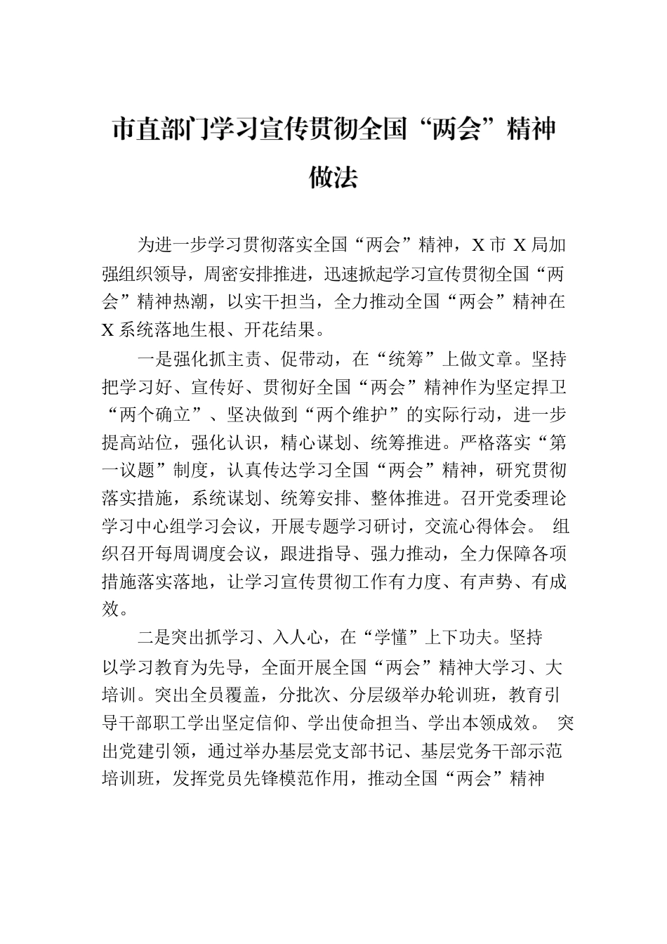 为进一步学习贯彻落实全国“两会”精神,X市X局加强组织领导,周密安排推进,迅速掀起学习宣传贯彻全国“两会”精神热潮,以实干担当,全力推动全国“两会”精神在X系统落地生根、开花结果。一是强化抓主责、促带动,在“统筹”上做文章。坚持把学习好、宣传好、贯彻好全国“两会”精神作为坚定捍卫“两个确立”、坚决做到“两个维护”的实际行动,进一步提高站位,强化认识,精心谋划、统筹推进。严格落实“第一议题”制度,认真传达学习全国“两会”精神,研究贯彻落实措施,系统谋划、统筹安排、整体推进。召开党委理论学习中心组学习会议,开展专题学习研讨,交流心得体会。组织召开每周调度会议,跟进指导、强力推动,全力保障各项措施落实落地,让学习宣传贯彻工作有力度、有声势、有成效。二是突出抓学习、入人心,在“学懂”上下功夫。坚持以学习教育为先导,全面开展全国“两会”精神大学习、大培训。突出全员覆盖,分批次、分层级举办轮训班,教育引导干部职工学出坚定信仰、学出使命担当、学出本领成效。突出党建引领,通过举办基层党支部书记、基层党务干部示范培训班,发挥党员先锋模范作用,推动全国“两会”精神学习深入开展。坚持学在日常,通过召开中心组学习会、“三会一课”、主题党日等形式,引导和推动干部职工切实把思想和行动统一到党中央决策部署和省、市工作安排上来,真正做到内化于心、外化于行。三是坚持促转化、求实效,在“结合”上展担当。坚持把学习贯彻全国“两会”精神与党的二十大、自治区第十三次党代会、X市第六次党代会精神结合起来,从细处研究、往细处谋划、在细处落实,坚定同建设黄河流域生态保护和高质量发展先进区、绿色发展先进市深度融合起来,推动城市建设质量更高、效益更好;同落实乡村建设行动、打造塞上乡村乐深度融合起来,推动乡村面貌“靓起来”、民生♘福祉“起来”;同行业风险防范、转型发展深度融合起来,♘推动房地产业、建筑业稳定健康发展;同改善民生、增进福祉深度融合起来,推动公用事业保障、物业服务管理等提档升级,谋定提升住房舒适度、提高城市首位度、放大乡村美誉度、增强群众满意度等x项重点工作、X类X项重点项目,细化完善推进措施X项,建立创新、重点、常规及重大项目“3+1”工作清单,切实把宏伟蓝图细化为“施工图”,转化为“实景图”。四是聚焦抓主业、见行动,在“落实”上见成效。紧紧围绕中心服务大局,埋头苦干奋勇前进,奋力把学习贯彻全国“两会”精神成果转化为实实在在的工作成效。健全重点项目领导包抓机制,靠前帮助企业解决项目审批手续办理、地上附着物迁移、工程用水用电等问题,全市建设项目共开工X项,开工率X%,完成产值X亿元,同比增长X%。召开房地产企业座谈会,集智破解矛盾困难,全力提振住房消费信心,全市商品房销售达X平方米,同比增长X%。全力推进城乡面貌提升,市区市政道路保畅通工程等8个基础设施项目、X个重点小城镇项目全面开工建设,全区住建系统重点项目暨重点小城镇建设启动现场会在xx召开。聚焦民生保障,累计完成农村清洁取暖“双替代”改造X万户,在全区首次开展农村建筑工匠培训,累计培训X余人,开工建设危房、抗震房改造X户,赴山东参观见学完整社区暨“红色物业”先进经验,高标准完成X“好房子”评选,全面启动完整社区试点建设,聚力推动“红色物业”建设,不断提升人民群众获得感、幸福感、安全感。