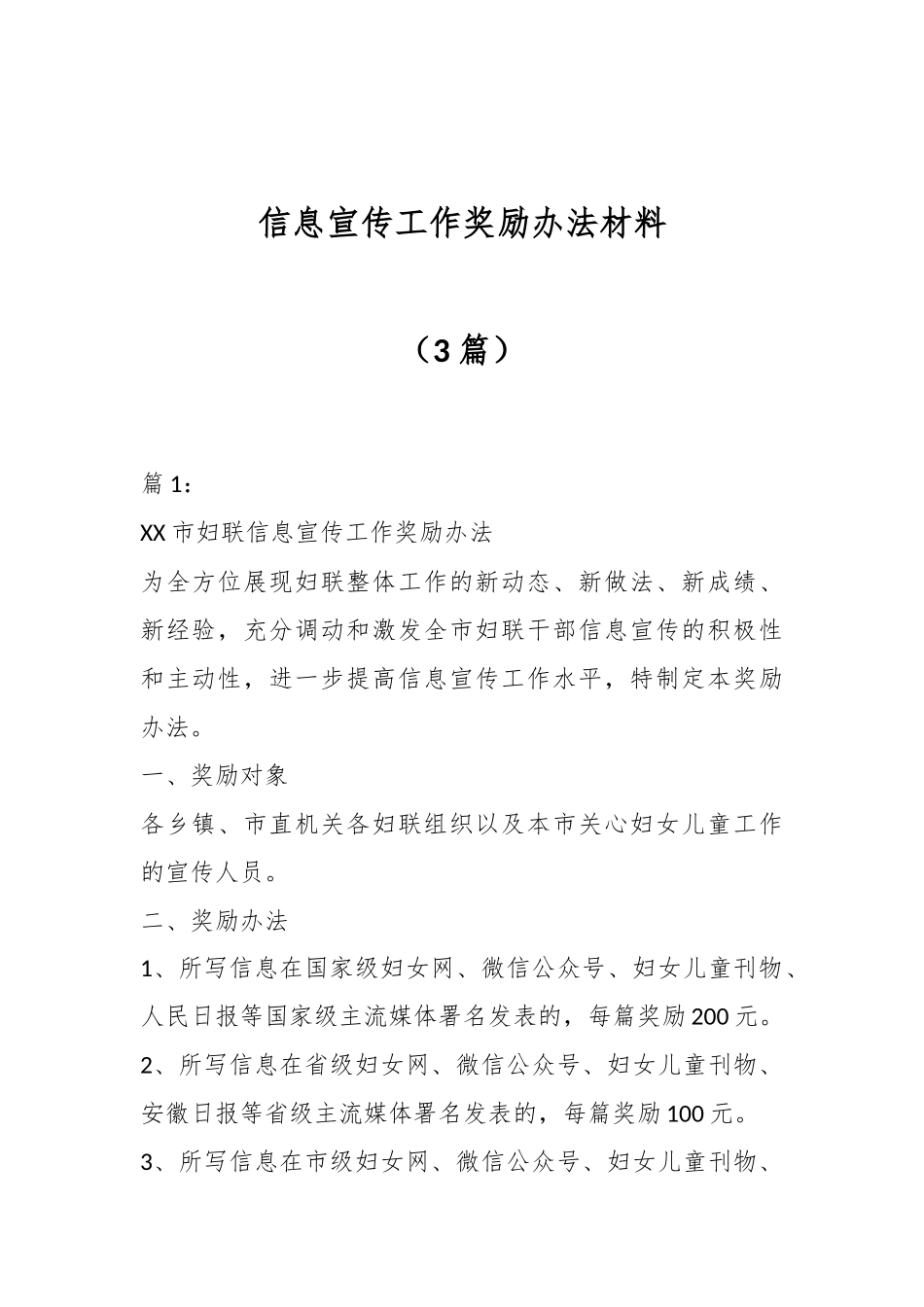 信息宣传工作奖励办法材料(3篇)篇1:XX市妇联信息宣传工作奖励办法为全方位展现妇联整体工作的新动态、新做法、新成绩、新经验,充分调动和激发全市妇联干部信息宣传的积极性和主动性,进一步提高信息宣传工作水平,特制定本奖励办法。一、奖励对象各乡镇、市直机关各妇联组织以及本市关心妇女儿童工作的宣传人员。二、奖励办法1、所写信息在国家级妇女网、微信公众号、妇女儿童刊物、人民日报等国家级主流媒体署名发表的,每篇奖励200元。2、所写信息在省级妇女网、微信公众号、妇女儿童刊物、安徽日报等省级主流媒体署名发表的,每篇奖励100元。3、所写信息在市级妇女网、微信公众号、妇女儿童刊物、安庆日报等市级主流媒体署名发表的,每篇奖励50元。4、所写信息被潜山妇女网、潜山先锋网、潜山政府网、潜山新闻网、微潜山、潜山女性微信公众号采用的,每篇奖励10元。5、各地妇联工作经验做法被中央电视台、安徽卫视、安庆电视台、潜山电视台采用播出的,分别奖励200元、100元、50元、10元。6、被采用字数在1000字以上的妇女工作经验介绍或调研文章,每篇按同级别奖励标准的两倍兑现。7、一稿多用的,以最高级别的计算,不重复计算;对本机关工作人员所写信息在潜山妇女网、潜山女性公众号发表的不予奖励。三、具体要求1、信息宣传工作纳入每年度对乡镇、开发区妇联工作目标管理考核。2、原则要求开发区及乡镇妇联、市直机关妇联(妇委会)、机关各部室每月上报一条信息,一年内至少完成10条。3、信息、新闻稿件要内容真实,观点正确,突出妇联工作主题。4、报道的信息、新闻稿件,投稿个人注意保留原稿。5、奖励每年底进行兑现,由个人申报,市妇联组宣部审核发放。本办法自202X年1月1日起执行。篇2:政务信息和宣传报道工作奖励办法政务信息和宣传报道工作是了解情况、掌握动态、把握全局的重要途径,是督促检查各项工作落实情况的重要手段,是目标管理考核的重要依据。为充分调动全局干部职工做好信息报送工作的主动性、积极性和创造性,进一步提高全局政务信息和宣传报道工作的质量和水平,营造良好舆论氛围,树立永顺县国土资源局良好社会形象,促进永顺县国土资源局工作更好更快发展,结合我局实际,特制定本办法。一、报送内容信息报送内容要突出贯彻落实上级重要会议精神和相关要求;重点工作推进情况;重要事件、重大活动、重要会议落实情况;具有典型意义、值得推广的经验、做法;对重点问题的调查研究及对策建议;业务规定、流程调整情况各类检查、总结报告;通知公告等。二、报送标准注重信息报送的时效性。要十分重视信息报送工作的时效性,具备敏锐、强烈的信息意识。当日信息当日报送,做到快速撰稿、快速传递,快速上报。力求信息要突出中心抓住重点、关注热点、反映难点,同时要确保信息内容的正确性、全面性,文字表达的准确性、精练性。三、奖励范围奖励人员为本单位工作人员;奖励稿件必须是宣传永顺县国土资源局工作的信息、新闻稿件及各类文章;凡被上级党委政府和部门采用的信息以及报纸、刊物、电视台、电台采用的稿件,本单位的撰稿人均可受到奖励。四、奖励标准国家级:每篇奖励1000元。省级:每篇奖励500元。州级:每篇奖励200元。县级:每篇奖励100元。五、奖励办法1、凡被采用的信息、新闻稿件及各类文章,每月发放一次奖金。2、一篇文章或摄影作品,有多人署名的只按一篇给予奖励。3、同一篇稿件或新闻照片被不同级别新闻媒体采用转载,其奖励计算标准累加计算。六、投稿要求政务信息报送到永顺县国土资源局办公室。对宣传信息由政工股送分管领导审核后报送到相关媒体,个人如有其他投稿渠道的,请另外说明。一般的政务信息、宣传报道稿件由局分管室领导审核;重大的(敏感的)政务信息、宣传报道稿件由局长审定。未经审批自行投稿,如宣传报道内容失实造成不良影响的,所产生的后果由作者自负,并追究有关人员责任。七、本办法最终解释权归永顺县国土资源局所有。篇3:政协信息宣传工作奖励办法为进一步做好信息宣传工作,规范奖励标准,鼓励广大政协工作者积极撰写宣传稿件,扩大政协影响,营造良好氛围。根据省、市政协相关表彰奖励规定,结...