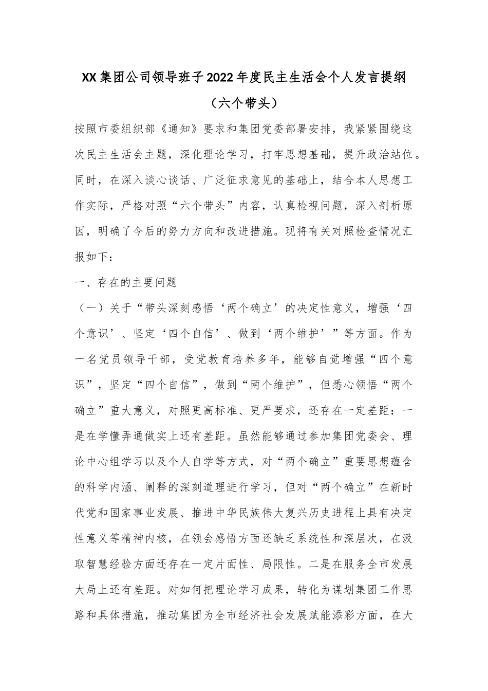 XX集团公司领导班子2022年度民主生活会个人发言提纲(六个带头)按照市委组织部《通知》要求和集团党委部署安排,我紧紧围绕这次民主生活会主题,深化理论学习,打牢思想基础,提升政治站位。同时,在深入谈心谈话、广泛征求意见的基础上,结合本人思想工作实际,严格对照“六个带头”内容,认真检视问题,深入剖析原因,明确了今后的努力方向和改进措施。现将有关对照检查情况汇报如下:一、存在的主要问题(一)关于“带头深刻感悟‘两个确立’的决定性意义,增强‘四个意识’、坚定‘四个自信’、做到‘两个维护’”等方面。作为一名党员领导干部,受党教育培养多年,能够自觉增强“四个意识”,坚定“四个自信”,做到“两个维护”,但悉心领悟“两个确立”重大意义,对照更高标准、更严要求,还存在一定差距:一是在学懂弄通做实上还有差距。虽然能够通过参加集团党委会、理论中心组学习以及个人自学等方式,对“两个确立”重要思想蕴含的科学内涵、阐释的深刻道理进行学习,但对“两个确立”在新时代党和国家事业发展、推进中华民族伟大复兴历史进程上具有决定性意义等精神内核,在领会感悟方面还缺乏系统性和深层次,在汲取智慧经验方面还存在一定片面性、局限性。二是在服务全市发展大局上还有差距。对如何把理论学习成果,转化为谋划集团工作思路和具体措施,推动集团为全市经济社会发展赋能添彩方面,在大格局中找定位、定目标还存在短板。比如,去年集团围绕贯彻落实市十三次党代会,全面确立了“××”发展目标,在对标对表市委市政府决策部署中谋篇布局,积极为我市“××”贡献了水务力量。但在推动落实过程中,在实现供排双轮驱动、加快技术创新、提升管理质效、强化数字赋能、盘活闲置资源等方面,还缺乏更多具体有效办法,推进集团高质量发展的制胜优势没有充分显现出来。再如,在优化营商环境服务方面,聚焦“办事不找人、审批不见面”,虽然集团建成营商网络服务大厅、增设“××”APP用水报装、维修等服务功能、积极推进水电气一站式服务,但多满足于“规定动作”,有特色、有亮点“自选动作”不够多。(二)关于“带头用习近平新时代中国特色社会主义思想凝心铸魂”等方面。始终坚持“思想引领、学习在先”,通过强化理论武装,提升政策水平和领导能力,但还存在着一些不足:一是理论学习的全面性还不到位。存在“急学急用”、实用主义问题,主要表现在对习近平新时代中国特色社会主义思想学习不够全面深入,学习内容单一,除学习研读上级明确的“规定书目”外,主要在经济发展、国企改革、安全生产、生态文明等与集团业务工作关联紧密的理论知识学习比较多,系统综合学习做得还不够,对一些新思想、新论断及时学习、反复咀嚼、深入钻研还要加强。二是在知行合一、全面践行上还有差距。存在理论学习与实际融合脱节现象,运用党的最新理论解决实际问题、有效推动工作方面不够到位。比如,当前集团深入贯彻全市深化国资国企改革会议,着眼实现集团战略性重组、专业化整合、系统性重构目标,下决心推动综合改革,在整体工作推进过程中,对于如何将理论学习成果融入到贯彻党的路线方针政策和市委市政府部署要求之中,贯穿于破解改革难题、加快工作进度之中,还是感到方式不够多,创新想法比较欠缺。(三)关于“带头坚持和加强党的全面领导”等方面。作为集团党委书记,能够带头坚持和加强党的全面领导,落实上级决策指示不打折扣,不搞变通,但离高标准、严要求还有一定距离。一是推动党建与生产深度融合还不够贯通。身为党建工作第一责任人,能够认真履行抓党建职责,加强建章立制,在完善公司治理中加强党的领导,但有时存在统筹兼顾不到位的问题。比如,在总部职能部门抓党建工作和业务工作同谋划、同部署、同落实、同考核工作过程中,自身指示的多、指导的少,重视严格考核、轻视结果激励,“两层皮”现象还没有得到根本解决。二是加强基层党组织建设的责任还不够务实。对基层党建工作侧重于听汇报、提要求,主动沉下心来,谋划思考的不够,沉下身子调研基层党建工作的时间较少,精力分配不科学。比如,重视加强试点规范、强化整体推进,但受时间、人员、能...