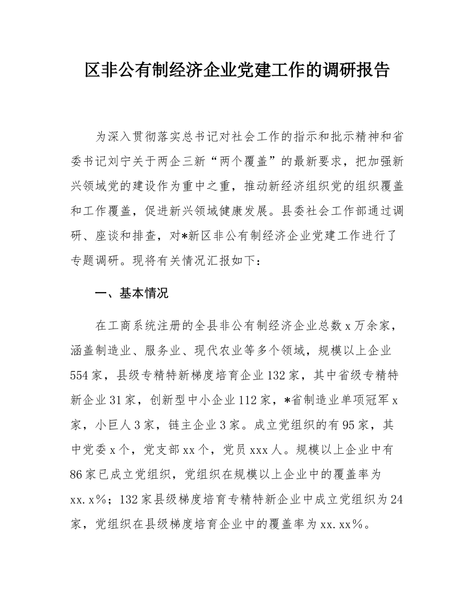 区非公有制经济企业党建工作的调研报告为深入贯彻落实总书记对社会工作的指示和批示精神和省委书记刘宁关于两企三新“两个覆盖”的最新要求,把加强新兴领域党的建设作为重中之重,推动新经济组织党的组织覆盖和工作覆盖,促进新兴领域健康发展。县委社会工作部通过调研、座谈和排查,对*新区非公有制经济企业党建工作进行了专题调研。现将有关情况汇报如下:一、基本情况在工商系统注册的全县非公有制经济企业总数x万余家,涵盖制造业、服务业、现代农业等多个领域,规模以上企业554家,县级专精特新梯度培育企业132家,其中省级专精特新企业31家,创新型中小企业112家,*省制造业单项冠军x家,小巨人3家,链主企业3家。成立党组织的有95家,其中党委x个,党支部xx个,党员xxx人。规模以上企业中有86家已成立党组织,党组织在规模以上企业中的覆盖率为xx.x%;132家县级梯度培育专精特新企业中成立党组织为24家,党组织在县级梯度培育企业中的覆盖率为xx.xx%。二、党建工作成效(一)示范引领作用凸显。党建驱动技术创新,激活企业发展动能。在24家建立党组织的专精特新企业中,通过“党建+创新”模式,成立党组织以来党员牵头组建技术攻关小组xx个,累计突破关键技术瓶颈xx项,申请专利xx件(其中发明专利xx件),推动企业研发投入强度从x.x%提升至x.x%。例如,*公司党支部书记*,带领的党员科技公关小组,先后申请专利xx余项,其中授权发明专利x项,实用新型xx项,和高校院所展开产学研合作,积极开展了五项内部研发项目,并成功结项,其中,还获得了四项成果技术评价,均是国内领先水平。*机器人通过党员“揭榜挂帅”机制,攻克工业机器人精密控制难题,产品市场份额跃居全省前三。(二)服务发展能力增强。*集团党委依托党组织,通过党建引领服务增效,构建民生保障“红色堡垒”。在新冠疫情期间,党委组建“党员保供突击队”,24小时调度物资,累计向全国调配蔬菜、粮油xxx万吨,确保*及周边地区价格波动低于全国平均水平;2021年*洪灾期间,免费开放冷库xx万吨,捐赠物资xxxx万元,获全国抗疫保供先进集体称号。在乡村振兴促共富方面,实施“党建+扶贫”行动,在*、*等县建设直采基地xx万亩,带动x.x万农户年均增收x.x万元;开设“乡村振兴专区”,减免贫困地区商户租金、管理费x.x亿元,相关模式写入《*省乡村振兴战略规划》。95家已成立党组织的企业依托党组织协调解决企业用地、融资等难题xxx件,推动32家企业完成技改升级;开展“党员先锋岗”创建活动,评选技术能手、管理标兵xxx名,带动企业生产效率提升xx%。三、面临挑战一是党组织覆盖率偏低。覆盖率差距悬殊,非公企业总量庞大28820家,但党组织仅覆盖108家,小微企业党建几乎空白;规上企业覆盖率不足x%,远低于全省平均水平xx%。二是党建与业务融合不深。已建党组织中,有xx%左右的存在重建轻管现象,行业部门和属地对非公企业党建重视度不够;党建赋能不足:仅有xx%的企业将党建纳入发展规划,党组织建设与技术创新、市场拓展结合较弱。三是行业部门和属地抓非公党建的责任意识不强。少部分规模以上企业,虽然已成立党组织,但是党组织书记已经缺位较长时间。支部党员过少,流动党员的管理缺失,企业员工中流动党员多,党组织关系不在企业的多,党组织生活开展不起来。四是保障机制不健全。经费与人员短缺企业年均党建经费投入小于5,000元,依赖党费返还和财政补贴;党务工作者xx%以上为兼职,专业化水平低,流动性大。四、对策建议一是实施“三聚焦”攻坚行动。聚焦规上企业提质对554家规上企业实施“一企一策”党建帮扶,2025年底前党组织覆盖率提升至xx%,党的工作覆盖率提升至xxx%;对132家专精特新企业实行“红色导师”派驻制,确保2025年实现党组织全覆盖。聚焦小微企业覆盖。按行业组建x个联合党委(如电商、物流、快递、文旅、汽车配件),覆盖小微企业5000家以上;推行“党员归队计划”,引导xxx名流动党员转入企业党组织。二是抓实党员教育管理。严格落实“三会一课”、主题党日、组织生活会等制度,增强党的组织生活的政治性和严肃性。推动党建与业务深度融合,通过设立“党员示范岗...