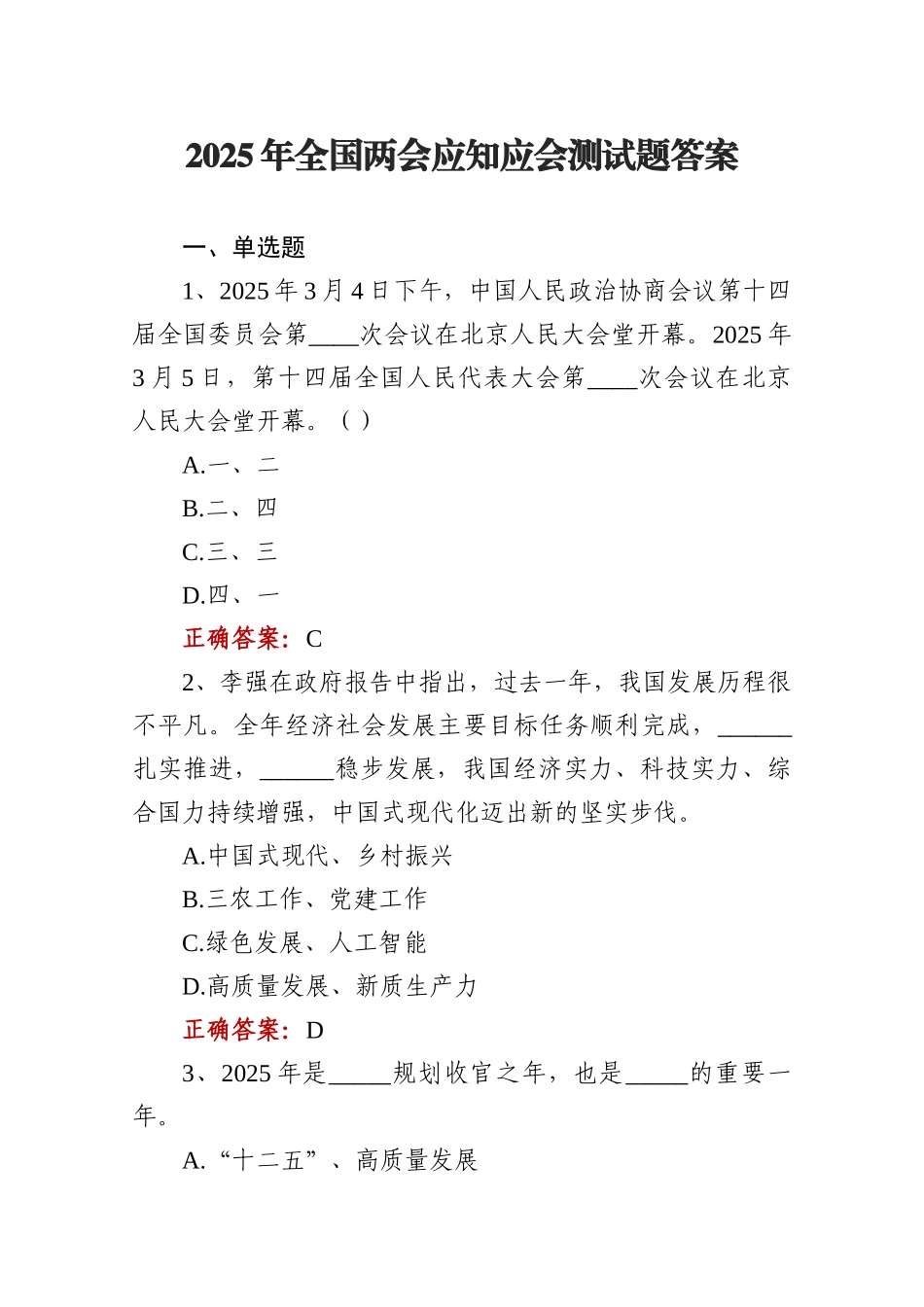 2025年全国两会应知应会测试题答案一、单选题1、2025年3月4日下午,中国人民政治协商会议第十四届全国委员会第____次会议在北京人民大会堂开幕。2025年3月5日,第十四届全国人民代表大会第____次会议在北京人民大会堂开幕。()A.一、二B.二、四C.三、三D.四、一正确答案:C2、李强在政府报告中指出,过去一年,我国发展历程很不平凡。全年经济社会发展主要目标任务顺利完成,______扎实推进,______稳步发展,我国经济实力、科技实力、综合国力持续增强,中国式现代化迈出新的坚实步伐。A.中国式现代、乡村振兴B.三农工作、党建工作C.绿色发展、人工智能D.高质量发展、新质生产力正确答案:D3、2025年是_____规划收官之年,也是_____的重要一年。A.“十二五”、高质量发展B.“十三五”、我国发展转型升级C.“十五五”、绿色发展D.“十四五”、进一步全面深化改革正确答案:D4、李强在政府报告中指出,过去一年,经济规模稳步扩大,国内生产总值达到_____元、增长_____,增速居世界主要经济体前列,对全球经济增长的贡献率保持在30%左右。A.114.9万亿、3%B.124.9万亿、4%C.134.9万亿、5%D.154.9万亿、6%正确答案:C5、李强在政府报告中指出,今年是“十四五”规划收官之年。今年发展主要预期目标是:国内生产总值增长____左右。A.5%B.4%C.6%D.3%正确答案:A6、李强在报告中指出,完成好今年目标任务,必须深入贯彻______,紧抓高质量发展这个首要任务,坚持以质取胜和发挥规模效应相统一,实现质的有效提升和量的合理增长。A.习近平新时代中国特色社会主义思想B.习近平经济思想C.习近平法制思想D.习近平强军思想正确答案:B7、李强在政府报告中指出,过去一年,民生保障扎实稳固,居民人均可支配收入实际增长_____,脱贫攻坚成果持续巩固拓展,义务教育、基本养老、基本医疗、社会救助等保障力度加大。A.5.1%B.5.0%C.4.9%D.5.2%正确答案:A8、李强在政府报告中指出,回顾过去一年,成绩来之不易。面对多重困难挑战,我们加力实施____政策,适时优化____,积极有效应对。A.减量、财政政策B.刺激消费、营商环境C.降息降准、政府服务D.存量、宏观调控正确答案:D9、李强在政府报告中指出,今年赤字率拟按____左右安排、比上年提高____个百分点,赤字规模5.66万亿元、比上年增加1.6万亿元。A.3%、2B.4%、1C.5%、4D.2%、3正确答案:B10、2025年政府工作报告指出,回顾过去一年,成绩来之不易。面对多重困难挑战,我们加力实施存量政策,适时优化宏观调控,积极有效应对。在这个过程中,我们深化了对经济工作的规律性认识,进一步认识到()是做好经济工作的根本保证。A.坚持两个毫不动摇B.坚持社会主义市场经济C.党中央集中统一领导D.以人民为中心正确答案:C11、2025年政府工作报告指出,2024年我国经济增速居世界主要经济体前列,对全球经济增长的贡献率保持在()左右。A.20%B.25%C.30%D.35%正确答案:C12、2025年政府工作报告指出,2024年我国就业、物价总体平稳,城镇新增就业()、城镇调查失业率平均为()。A.1256万人;5.1%B.1256万人;6.1%C.1156万人;5.1%D.1156万人;6.1%正确答案:A13、2025年政府工作报告指出,2024年我国就业、物价总体平稳,居民消费价格()。A.上涨0.8%B.上涨0.2%C.下降0.8%D.下降0.2%正确答案:B14、2025年政府工作报告指出,2024年我国国际收支基本平衡,对外贸易规模创历史新高,国际市场份额稳中有升,外汇储备超过()。A.2.6万亿美元B.3万亿美元C.32万亿美元D.3.6万亿美元正确答案:C15、2025年政府工作报告指出,2024年我国民生保障扎实稳固,居民人均可支配收入实际增长()。A.6.1%B.5.1%C.4.1%D.3.1%正确答案:B16、2025年政府工作报告指出,2024年我国产业升级有新进展,粮食产量首次跃上()新台阶、亩产提升()。A.1.3万亿斤;6.1斤C.1.4万亿斤;61斤B.1.3万亿斤;10.1斤D.1.4万亿斤;10.1斤正确答案:D17、2025年3月5日,国务院总理李强作《政府工作报告》指出,2025年拓宽()再贷款使用范围。A.保障性住房B.小微企业C.绿色产业D.科技创新正确答案:A18、2025年3月5日,国务院总理李强作《政府工作报告》指出,2025年发挥房地产融资协调机制作用,继续...