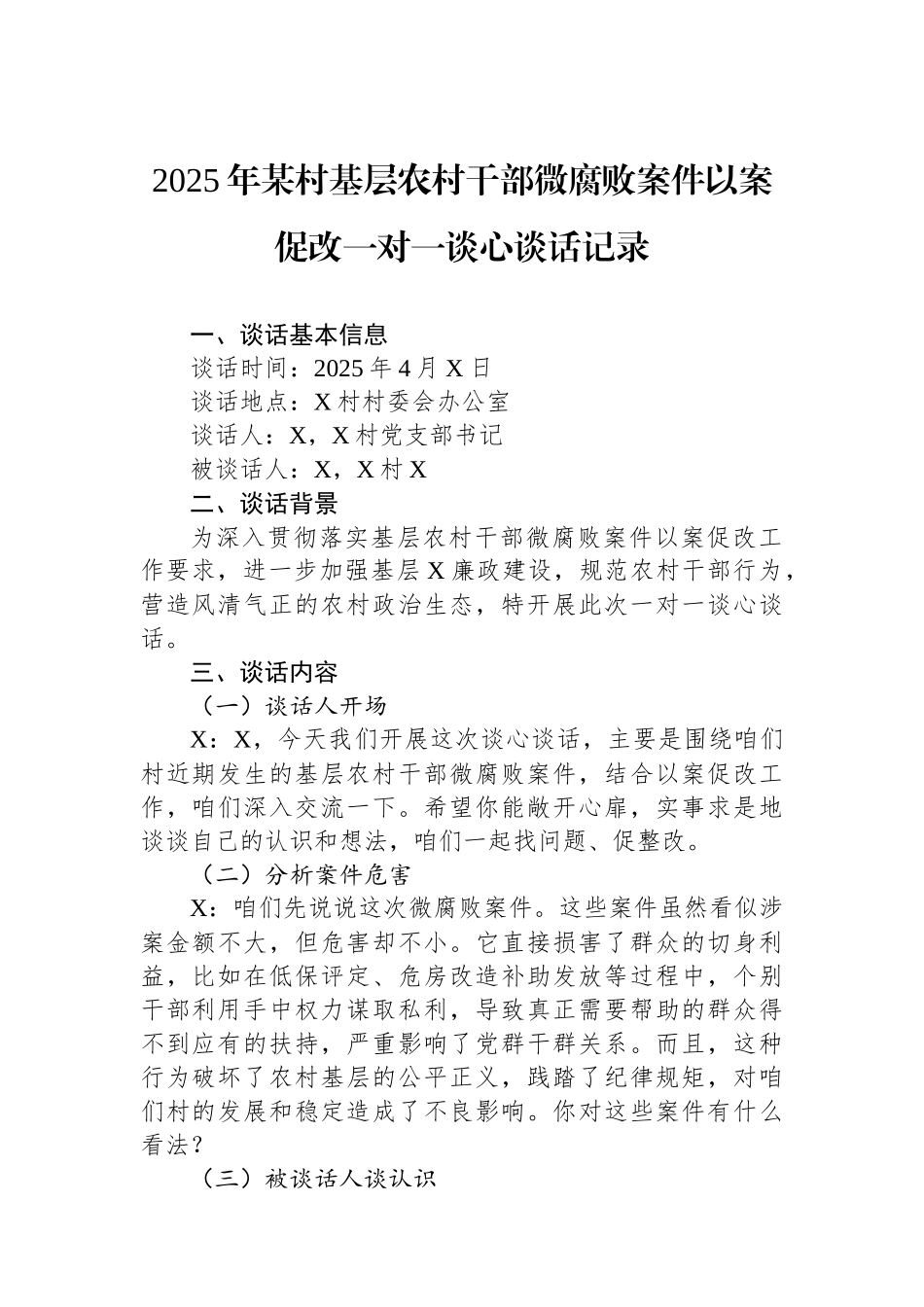 2025年某村基层农村干部微腐败案件以案促改一对一谈心谈话记录一、谈话基本信息谈话时间:2025年4月X日谈话地点:X村村委会办公室谈话人:X,X村党支部书记被谈话人:X,X村X二、谈话背景为深入贯彻落实基层农村干部微腐败案件以案促改工作要求,进一步加强基层X廉政建设,规范农村干部行为,营造风清气正的农村政治生态,特开展此次一对一谈心谈话。三、谈话内容(一)谈话人开场X:X,今天我们开展这次谈心谈话,主要是围绕咱们村近期发生的基层农村干部微腐败案件,结合以案促改工作,咱们深入交流一下。希望你能敞开心扉,实事求是地谈谈自己的认识和想法,咱们一起找问题、促整改。(二)分析案件危害X:咱们先说说这次微腐败案件。这些案件虽然看似涉案金额不大,但危害却不小。它直接损害了群众的切身利益,比如在低保评定、危房改造补助发放等过程中,个别干部利用手中权力谋取私利,导致真正需要帮助的群众得不到应有的扶持,严重影响了党群干群关系。而且,这种行为破坏了农村基层的公平正义,践踏了纪律规矩,对咱们村的发展和稳定造成了不良影响。你对这些案件有什么看法?(三)被谈话人谈认识X:书记,我也一直在关注这些案件。说实话,我心里挺震惊的。没想到身边的同志会犯这样的错误。这些案件反映出个别干部纪律意识淡薄,没有把群众的利益放在心上。他们的行为不仅害了自己,也给村里的工作带来了负面影响,让群众对我们干部的信任度打了折扣。(四)对照反思自身问题X:那你有没有对照这些案件,反思一下自己在工作中存在的问题呢?比如说在落实惠民政策、村级事务管理、资金使用等方面,有没有可能出现违规违纪的风险点?X:经过反思,我觉得自己在一些方面还存在不足。在惠民政策宣传上,有时候不够深入,导致部分群众对政策了解不透彻,可能在一定程度上影响了政策的公平落实。在村级事务管理中,虽然能够按照规定流程办事,但有时候存在怕得罪人的思想,对一些不合理的诉求没有坚决抵制。在资金使用方面,虽然自己没有挪用、截留资金的行为,但对资金的监管还不够严格,存在一些细节上的疏漏。(五)提出整改要求和期望X:针对你提到的问题,我们要认真加以整改。首先,要加强学习,提高纪律意识和规矩意识,深入学习X、法律法规以及各项惠民政策,做到心中有戒、心中有数。其次要增强责任意识,敢于担当,在村级事务管理中,严格按照制度和流程办事,坚决维护群众的合法权益。同时,要主动接受群众监督,定期公开村级事务和资金使用情况,让权力在阳光下运行。希望你能以这次以案促改为契机,深刻吸取教训,不断改进自己的工作作风。X:谢谢书记的提醒和指导。我一定牢记教训,加强学习,严格要求自己。在今后的工作中,我会把群众的利益放在首位,认真落实各项政策,主动接受监督,及时改进自身存在的问题,做一名让群众满意的基层干部。(六)总结谈话X:好的,希望你能说到做到,切实将整改措施落到实处。咱们要以这次微腐败案件为警示,不断完善制度,加强管理,防止类似问题再次发生。同时,也要团结带领村里的干部群众,共同营造风清气正、干事创业的良好氛围推动咱们村各项工作健康发展。四、谈话总结通过本次谈心谈话,双方围绕基层农村干部微腐败案件,深入交流了认识和看法,被谈话人深刻反思了自身存在的问题,并明确了整改方向。谈话达到了预期效果,为推进以案促改工作、加强基层X廉政建设奠定了坚实基础。