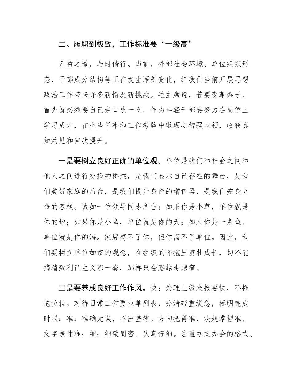 党课:但行好事,莫问前程——年轻党员干部要扭住“三个一”提升履职能力当年,有人曾问邓小平:“长征路上那么艰难凶险,爬雪山,过草地,是什么信念支撑你走过来的?”他坚定地说:“跟着走”。青春是每个人一生中最宝贵,像金子一样闪光的一段燃情岁月,在这样的年华中奋力击水,将会奏出激荡的长歌,奋力登高,会跃出人生的极限高度。但实际上,青年又是多有迷惘一段岁月,作为新时代的党员,应在前途并不“明朗”的时期,“跟着走”,用信仰上的正方向、工作上的高标准、修身上的勤求索来正心正行,在全面深化改革的浪潮中保持精进,攻下每一座新形势下工作前行路上的“腊子口”、“娄山关”。一、笃定信仰,心中方向要“一定对”作为一名年轻党员,需秉持入党入职的那颗初心,坚定为党的事业奋斗一生,坚守一生的信仰,传承红色基因,勇担强国重任。xxx%的纯。作为机关工作人员,承担着贯彻党的路线、方针政策,执行、传播党的理论的使命责任,首先自身要对党中央、总书记的领导要有不掺任何杂质的绝对忠诚,要传承革命先辈身上那种对党组织绝对信任,无限忠诚的优良基因。xxx%的信。要坚守对马克主义、毛泽东思想、中国特色社会主义理论体系的理论信仰,主动读原著、学原文、悟原理,真正拿出自己的时间学习理论,执笔着墨,通读原文,彻悟原理。此外,要加强对法规的学习,然后联系而不是孤立地进行思考,提炼总结出较为系统的认识,也是自己独到的体会。还可以结合网络上特别是政工研究、建言献策栏目上的调研文章,看看其他同类单位的情况,以此类比,就更能掌握全面的认识。如果再有时间,就可以读一读大部头原著,进一步在党史军史的河流中溯回激荡自己的思维,沉淀一些更厚重的思考。xxx%的真。总书记讲:“老实做人,做老实人,是共产党员先进性的内在要求。”在长期的革命、建设和改革实践中,正是在我们党几代领导核心的大力倡导、亲自笃行和有力推动下,“做老实人、说老实话、干老实事”,成为中国共产党人的优良传统和宝贵精神财富,激励着一代又一代中国共产党人脚踏实地前行。党的十八大后,全党在总书记的带领下进行重拳反腐,打掉了一批“大老虎”、拍掉了一批批“小苍蝇”。我们年轻党员干部在“官之初”就在心中装进党和国家的事业,对党组织要怀揣真感情,带着志气,带着情感,走进基层,融入基层,为强国复兴付出全部情感、全部智慧、全部能力。二、履职到极致,工作标准要“一级高”凡益之道,与时偕行。当前,外部社会环境、单位组织形态、干部成分结构等正在发生深刻变化,给我们当前开展思想政治工作带来许多新情况新挑战。毛主席说,若要变革梨子,首先就必须要自己亲口吃一吃,作为年轻干部要努力在岗位上学习成才,在担当任事和工作考验中砥砺心智强本领,收获真知灼见和自我提升。一是要树立良好正确的单位观。单位是我们和社会之间和他人之间进行交换的桥梁,是我们显示自己存在的舞台,是我们美好家庭的后台,是我们提升身价的增值器,是我们安身立命的客栈。诚如一位领导同志所言:如果你是小草,单位就是你的地;如果你是小鸟,单位就是你的天;如果你是一条鱼,单位就是你的海。家庭离不了你,但你离不了单位。因此,我们要树立单位如家的观念,在组织的怀抱里茁壮成长,切不能搞精致利己主义那一套,那样只会路越走越窄。二是要养成良好工作作风。快:处理上级来报要快,不拖拖拉拉。对待日常工作要拉单列表,分清轻重缓急,标明完成时限;准:准确无误,不出差错。方向把得准、法规掌握准、文字表述准;细:细致周密、认真仔细。注重办文办会的格式、杜绝错别字。对下转文件、发通知也要注意,不能出现错别字和语句不通顺等明显的低级错误。只有把大事做细做实、抓细抓小,才能出精品不出次品,出大成果不犯低级错误;严:办文办事要严谨按程序、规矩办事。遇事常请示汇报,不能自行其事,更不能擅作主张。做到不缺位、不错位、不越位。三是要不断提升业务能力。调查研究能力。经常深入基层,及时了解人民群众的思想反映和利益诉求,增强工作的主动性针对性实效性。基层有什么想法,有什么困难,都要及时的反馈。组织协调能力。善于把各...