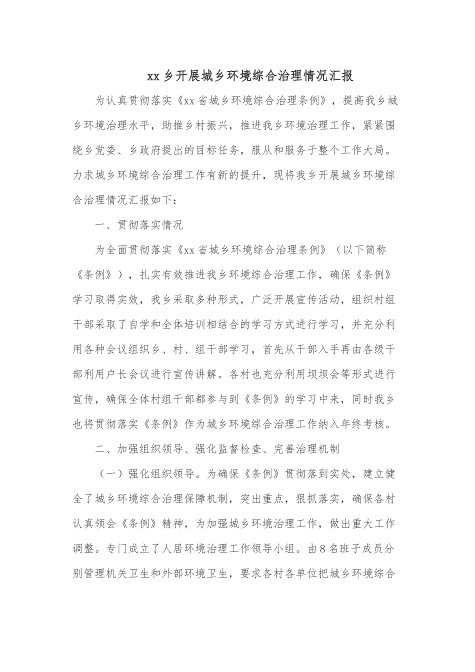 xx乡开展城乡环境综合治理情况汇报为认真贯彻落实《xx省城乡环境综合治理条例》,提高我乡城乡环境治理水平,助推乡村振兴,推进我乡环境治理工作,紧紧围绕乡党委、乡政府提出的目标任务,服从和服务于整个工作大局。力求城乡环境综合治理工作有新的提升,现将我乡开展城乡环境综合治理情况汇报如下:一、贯彻落实情况为全面贯彻落实《xx省城乡环境综合治理条例》(以下简称《条例》),扎实有效推进我乡环境综合治理工作,确保《条例》学习取得实效,我乡采取多种形式,广泛开展宣传活动,组织村组干部采取了自学和全体培训相结合的学习方式进行学习,并充分利用各种会议组织乡、村、组干部学习,首先从干部入手再由各级干部利用户长会议进行宣传讲解。各村也充分利用坝坝会等形式进行宣传,确保全体村组干部都参与到《条例》的学习中来,同时我乡也将贯彻落实《条例》作为城乡环境综合治理工作纳入年终考核。二、加强组织领导、强化监督检查、完善治理机制(一)强化组织领导。为确保《条例》贯彻落到实处,建立健全了城乡环境综合治理保障机制,突出重点,狠抓落实,确保各村认真领会《条例》精神,为加强城乡环境治理工作,做出重大工作调整。专门成立了人居环境治理工作领导小组。由8名班子成员分别管理机关卫生和外部环境卫生,要求各村各单位把城乡环境综合治理工作列入重要议事日程,要求包村干部负责指导督促此项工作的开展,确保领导到位、人员到位、责任到位、工作到位。为扎实有效开展城乡环境综合治理工作提供了强有力的保障。同时乡党委、乡政府将城乡环境治理工作摆上了重要的议事日程,纳入对各村和乡干部的年终目标任务考核。(二)强化监督检查。乡治理办每周最少督查1次以上,在节假日期间领导带队巡查,加强对新老集镇,挖丰路、两草路、景区和省道xxx沿线等重要路段的监管和督查,定期或不定期对各村环境卫生进行巡查和《条例》贯彻落实情况进行检查,对发现的问题及时进行劝导、协调和整改,确保《条例》的贯彻落到实处。(三)强化治理手段。坚持会议总结,每季度召开城乡环境综合治理专题工作会议。通过会议强化治理效果,查找薄弱环节、卫生死角及盲点。增添措施,对存在的问题及时整改到位确保取得实效。对乡机关卫生区域及市场化承包区域划定责任范围,落实到人,坚持严格考核,制定专门的考核办法,对于整治不到位的单位或个人给予通报,严格问责。三、城乡环境综合治理工作制度完善(一)健全清扫制度。我乡将两草路、垃圾转运、挖角新老集镇及重要路段环境卫生治理外包专业人员保洁,制定了完善的清扫保洁制度,奖惩分明,责任明确。(二)村规民约保障制度落实。我乡五个村将农村生活垃圾治理作为重要工作落实,积极引导农户开展环境卫生治理,通过召开村民大会一致将农村生活垃圾治理写入了村规民约,引导村民增强保护环境卫生的意识,提升乡风文明程度,提高农村生活垃圾治理的综合效果。(三)加强监督考核,确保机制长效落实。乡治理办每周不少于1次开展监督检查,同时对治理不力的村和市场化运作下发整改通知书,限期整改,完善督查暗访机制,我乡在不断总结完善工作经验的基础上,切实把刚性执法和文明劝导结合起来,采用各村交叉检查和乡治理办协助检查的方式,每月进行不定期检查,重点检查村活动室,村主干道两旁,并通报检查结果,纳入年终考核。四、突出重点,开展综合整治(一)加大重点区域卫生治理。我乡狠抓挖角新老集镇、农贸市场、七里坝、xx景区、卫生院、中心校等区域卫生治理,增派人守,加强农村人居环境重点区域卫生治理。(二)加强“两线”治理。截至目前共组织xxx人(次)对我乡境内大渡河河道、河沟、河岸进行全面清理,彻底清理河岸沿线白色垃圾,不留卫生死角。加强xxx沿线和两草路卫生保洁,加强施工车辆抛、洒、滴、漏监管工作,增派民兵xx人加强道路保通保畅,方便群众和过往游客出行。(三)狠抓聚居点环境治理。xx乡加强村庄道路、居住集中区、xx坝、xx景区、公共区域、公厕等公共设施的清扫保洁力度,规范住户房前屋后杂物的堆放,做好房前屋后卫生治理,加强家禽饲养规范管理。(四)加强建筑工地管理。xx乡持...