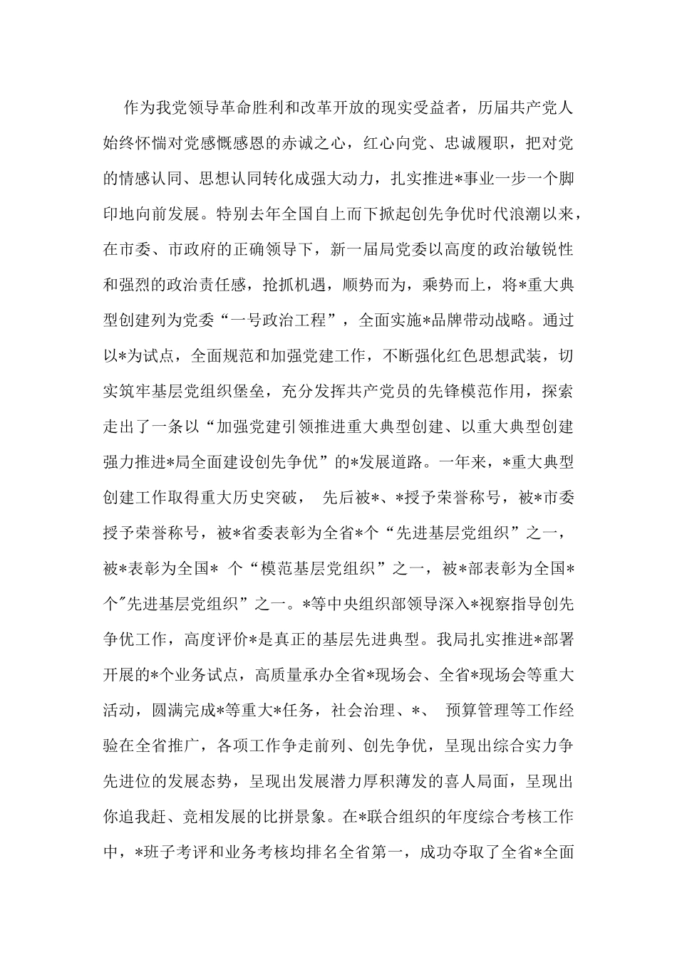 2024年党委书记、局长在庆祝建党103年暨“七一”表彰大会上的讲话稿与七一党课讲稿:弘扬井刚山精神激发创新热情(2篇文)2024年党委书记、局长在庆祝建党103周年暨“七一”表彰大会上的讲话稿同志们:在这个具有重大历史纪念意义的特殊日子,我们隆重集会,热烈庆祝伟大的中国共产党103周年华诞,歌颂党的光辉历程和丰功伟绩,隆重表彰全市全市*系统先进基层党组织、优秀党务工作者、优秀共产党员,总结并展望党建、创先争优等重点工作。刚才,*宣读了表彰通令,对受到表彰的先进单位和个人进行了颁奖。这些受到表彰的同志,是在各自岗位上坚决贯彻党的路线方针政策,忠实践行*精神,开拓进取,扎实工作的优秀代表,体现了新时期共产党人的优良品质和*队伍的时代风范,都是值得全市各级学习的典范标杆。在此,我首先代表局党委,向受到表彰的先进基层党组织和优秀党务工作者、优秀共产党员表示崇高的敬意!并通过你们,向辛勤工作在一线的全市*各级党组织和党务工作者、广大共产党员致以节日的问候!自1921年中国共产党诞生,我们党已走过了整整103年的光辉历程。回顾党的历史,我们心潮澎湃,倍感骄傲与自豪。从鸦片战争到中国共产党成立之前,中华民族经历了无数的屈辱,也进行了艰苦的抗争,但都没有找到救国救民、振兴中华的真理和道路。只有在中国共产党的坚强领导下,中国革命才走上了正确的道路,中国人民争取民族独立、人民解放和国家富强、人民幸福的斗争,才得以波澜壮阔地向前发展,中华民族才得以经历并实现从贫穷落后到繁荣昌盛、从受人欺凌到扬眉吐气的伟大变革。特别是改革开放以来,中国的经济实力和综合国力显著增强,人民的物质文化生活水平明显提高,党的执政地位更加巩固,政通人和、国泰民安,我国在国际上的地位和影响与日俱增。中华民族正以站立起来、富强起来的自尊、自信和自豪,前进在建设有中国特色社会主义道路上。103年的历史巨变充分证明:没有共产党就没有新中国,没有党的领导就没有中国的富强和中华民族的伟大复兴,中国共产党不愧是伟大、光荣、正确的党。作为我党领导革命胜利和改革开放的现实受益者,历届共产党人始终怀惴对党感慨感恩的赤诚之心,红心向党、忠诚履职,把对党的情感认同、思想认同转化成强大动力,扎实推进*事业一步一个脚印地向前发展。特别去年全国自上而下掀起创先争优时代浪潮以来,在市委、市政府的正确领导下,新一届局党委以高度的政治敏锐性和强烈的政治责任感,抢抓机遇,顺势而为,乘势而上,将*重大典型创建列为党委“一号政治工程”,全面实施*品牌带动战略。通过以*为试点,全面规范和加强党建工作,不断强化红色思想武装,切实筑牢基层党组织堡垒,充分发挥共产党员的先锋模范作用,探索走出了一条以“加强党建引领推进重大典型创建、以重大典型创建强力推进*局全面建设创先争优”的*发展道路。一年来,*重大典型创建工作取得重大历史突破,先后被*、*授予荣誉称号,被*市委授予荣誉称号,被*省委表彰为全省*个“先进基层党组织”之一,被*表彰为全国*个“模范基层党组织”之一,被*部表彰为全国*个"先进基层党组织”之一。*等中央组织部领导深入*视察指导创先争优工作,高度评价*是真正的基层先进典型。我局扎实推进*部署开展的*个业务试点,高质量承办全省*现场会、全省*现场会等重大活动,圆满完成*等重大*任务,社会治理、*、预算管理等工作经验在全省推广,各项工作争走前列、创先争优,呈现出综合实力争先进位的发展态势,呈现出发展潜力厚积薄发的喜人局面,呈现出你追我赶、竞相发展的比拼景象。在*联合组织的年度综合考核工作中,*班子考评和业务考核均排名全省第一,成功夺取了全省*全面建设“*连冠”。与此同时,局党委感到特别欣慰的是:今年以来,全市*队伍特别是广大领导干部居安思危、防微杜渐、举一反三,以庆祝建党*周年和深入开展*活动为重要契机,以廉政警示教育、作风纪律教育整顿、“五大”专项整治活动为重要抓手,以超常态势和超常举措,慎之又慎地防范各类事故,严之又严地强化管理教育,细之又细地推进队伍建设,全市各级风气建设实现明显好转,确保了部队内部的高度安全稳定。从督察暗...