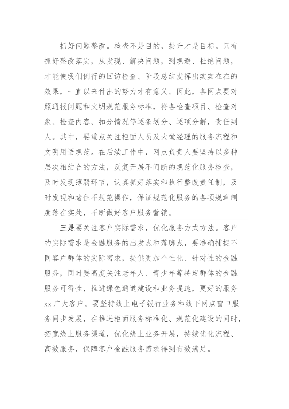 某银行领导在全行规范化服务总结会上的讲话同志们:为进一步提升我行规范化服务质量和6S管理水平,强化员工服务意识,今天我们例行召开xx年第x季度规范化服务及6S管理工作总结会。会议的主题是进一步明确目标、落实任务,动员全行上下积极行动起来,确保xx银行服务质量提升工作扎实开展、有序推进,切实提升我行金融服务满意度。围绕这一主题,我们每季度都会对全辖规范化服务工作进行分析总结,xx老师也通过数据对比、问题枚举、共性分析等方式对各网点外部环境、内部环境、柜员服务、大堂经理服务、保安服务、晨会执行情况等几大模块进行了逐个点评,直观展现了全行规范化服务工作取得的进步和仍然存在的各类问题。根据本次检查结果来看,虽然各网点的规范化服务工作取得了一定的成绩,但在优质服务管理方面仍存在着一些薄弱环节,各项优质服务的基础管理工作还有待进一步深化,这些问题在日常工作当中易导致客户满意度降低或引发客户投诉。究其原因,我认为主要有两点:一是营业场所没有日常持续地做好规范化服务管理工作。部分临柜人员对服务标准掌握不熟练、理解不透彻,执行过程发生偏差,或虽熟知服务标准,但在实操过程中无法将服务规范自然的融入至业务流程中,最终选择不执行或只执行部分。二是网点干部职工对规范化服务管理工作的认识还有待进一步提高,不能正确认识和处理经营发展与规范化服务之间的利害关系。部分网点负责人和促导师(会计)思想上未深刻认识到规范化服务工作的重要性和必要性,工作中心只放在日常业务上,导致规范化服务新问题层出不穷、小问题不断反复。为了解决这些现实存在的问题,不再让服务问题成为影响xx银行成绩的短板,真正从内而外擦亮xx品牌,我再提几点要求。一是要高度认识金融服务的重要性。优质金融服务是业务发展的“助推器”,是转型提质的“稳定器”。各网点要高度重视金融服务工作开展,将规范化服务提升与日常工作有机结合,把持续改进提升金融服务贯穿于各项日常工作中,内化于心、外化于行,持续树立“以客户为中心”的工作理念,提高思想认识,增强行动自觉,不断提升金融服务质效,打造xx服务品牌。二是抓好问题整改。检查不是目的,提升才是目标。只有抓好整改落实,从发现、解决问题,到规避、杜绝问题,才能使我们例行的回访检查、阶段总结发挥出实实在在的效果,一直以来付出的努力才有意义。因此,各网点要对照通报问题和文明规范服务标准,将各检查项目、检查对象、检查内容、扣分情况等逐条划分、逐项分解,责任到人。其中,要重点关注柜面人员及大堂经理的服务流程和文明用语规范。在后续工作中,网点负责人要坚持以多种层次相结合的方法,反复开展不间断的规范化服务检查,及时发现薄弱环节,认真抓好落实和执行整改责任制,及时发现和堵住不规范操作,保证规范化服务的各项规章制度落在实处,不断做好客户服务营销。三是要关注客户实际需求,优化服务方式方法。客户的实际需求是金融服务的出发点和落脚点,要准确捕捉不同客户群体的实际需求,提供更加个性化、针对性的金融服务,同时要高度关注老年人、青少年等特定群体的金融服务可得性,推进绿色通道建设和业务提速,更好的服务xx广大客户。要坚持线上电子银行业务和线下网点窗口服务同步发展,在推进柜面服务标准化、规范化建设的同时,拓宽线上服务渠道,优化线上业务开展,持续优化流程、高效服务,保障客户金融服务需求得到有效满足。“服务始于细微,见于平凡”。规范化服务是一项长期而系统的工作,要在硬件上长期坚持,从软件上整改提升。各网点要严格落实各项规范化服务要求,细化网格分工,细分责任到人,坚持好每周二集中清扫整顿,将规范化服务落实好、保持住,决不能出现忽冷忽热、一阵风的现象。总行将继续协同第三方公司,通过现场与非现场检查、每月评比和每旬通报等方式,积极推进全行6S管理、五小建设及网点升级改造工程,确保辖内营业网点硬件设施的全面升级,为员工、客户打造整洁舒适的办公办理环境,真正把优质服务转化为推动我行高质量发展的现实生产力。