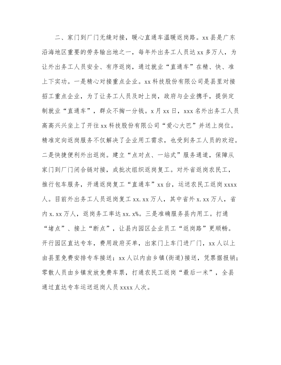 稳就业主题研讨发言:精准打好稳就业促复产“组合拳”稳就业促复产关系家庭生计、企业生存。xx县提前介入、第一时间部署行动,边一线防疫、边下好稳就业保用工的“先手棋”,通过扩就业、稳岗位、减负担夯实“底盘”,把耽误的时间抢回来,把遭受的损失补回来,在疫情防控形势稳定向好的同时,生产生活秩序正加快恢复。一、线上加线下立体招聘,就业和用工实现两不愁。春节过后是招工的高峰期,突如其来的新冠肺炎疫情打破了以往惯例,面对企业“用工荒”与群众“求职难”的矛盾,xx通过线上线下立体“配送”,保驾护航企业复工和群众就业。一方面,“零接触”线上招聘稳就业。就业有路、用工有人,拓展服务方式是关键。该县充分运用xx发布、xx智慧就业、微信公众号等平台开展线上招聘不停歇“春风行动”,打破“信息孤岛”,改过去“面对面”招聘为“屏对屏”对接服务,实现网上面试,“不见面”就业。全县参与网络招聘企业xx家,举办线上招聘会xx场,提供岗位xxxx个,达成就业意向xxxx人,入职企业就业xxxx人。另一方面,“一对一”送岗上门促就业。受疫情影响,xx鞋业有限公司复工面临用工缺口,企业干着急而又无计可施,县人社部门第一时间介入、精准服务,短短xx天时间帮助招聘员工xxx人,解了企业燃眉之急。聚焦农村务工人员特别是建档立卡贫困户,推行县就业服务“小分队”、乡镇干部、驻村工作队、村组干部、村劳务经纪人“x+x”联动机制,开展“一对一”送岗上门服务,为复工复产企业招聘员工xxxx人,其中贫困劳动力xxx人;xxx家乡村“致富车间”吸纳贫困动力就业xxxx人,让贫困户在家门口就能捧上“新饭碗”,实现“一人就业、全家脱贫”。二、家门到厂门无缝对接,暖心直通车温暖返岗路。xx县是广东沿海地区重要的劳务输出地之一,每年外出务工人员达xx多万人,为让外出务工人员安全、有序返岗,通过就业“直通车”在精、快、准上下实功。一是精心对接重点企业。xx科技股份有限公司是县里对接招工重点企业,为了让务工人员及时上岗,政府与企业携手,提供定制就业“直通车”,群众不掏一分钱。x月xx日,xxx名外出务工人员高高兴兴坐上了开往xx科技股份有限公司“爱心大巴”并送上岗位。精准定向返岗服务不仅解决了企业用工需求,也受到务工人员的欢迎。二是快捷便利外出返岗。建立“点对点、一站式”服务通道,保障从家门到厂门闭合链对接,成批次组织返岗复工。对外省返岗农民工,推行包车服务,开通返岗复工“直通车”xx台,运送农民工返岗xxxx人。目前外出务工人员返岗复工xx.xx万人,其中省外x.xx万人,省内x.xx万人,返岗务工率达xx.x%。三是准确服务县内用工。打通“堵点”、接上“断点”,让县内园区企业员工“返岗路”更顺畅。开行园区直达专车,费用政府买单,出家门上车门进厂门,xx人以上由县里免费安排专车接送;xx人以内由乡镇(街道)接送,凭票据报销;零散人员由乡镇发放免费车票,打通农民工返岗“最后一米”,全县通过直达专车运送返岗人员xxxx人次。三、普惠与特惠政策叠加,返岗复工活力持续迸发。为让企业安全平稳渡过“疫情寒冬”,xx县出台“x+xx”惠企稳岗政策,让企业既享“普惠”又吃“特惠”,助企业化危为机、危中见机。目前,全县开复工规模工业企业xxx家、开复工率xx%;累计到岗x.xx万人,到岗率xx%。一方面,普惠政策不折不扣。按国家规定的高限执行社保费免、减、缓三项政策,阶段性对全县中小微企业免征工伤保险、养老保险、失业保险单位缴费部分,职工个人缴费部分不予减免;对受疫情影响,生产经营困难企业,缓缴工伤保险、养老保险、失业保险。对不裁员或少裁员的参保企业,返还上年度实际缴纳失业保险费的xx%。xx家参保企业领取了稳岗补贴xx.x万元,给企业吃下了安心发展的“定心丸”。另一方面,特惠政策精准滴灌。制定出台园区用工激励政策,对人力资源服务机构、村劳务经纪人、乡镇(街道)干部、村组干部“四类对象”招工给予奖励,成功介绍到园区企业就业按xxx元/人标准给予补贴,全县发放就业创业服务补贴xx.xx万元。对企业每吸纳x名贫困劳动力就业给予xxxx元/人补贴。在众多利好政策扶持下,不少企业生产“逆势而上”。xxx科技...