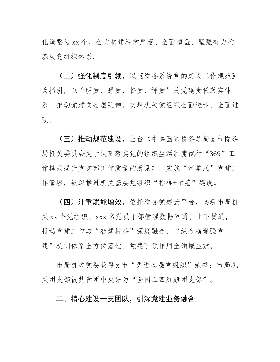 市税务局党委书记、局长在全市市直机关党组织书记抓党建工作汇报会上的发言近年来,x市税务局持之以恒推动学习贯彻总书记在中央和国家机关党的建设工作会议上的重要讲话精神,定位走好机关党建“第一方阵”,着眼x税务实际,强化政治担当、体现税务特色,聚焦“夯基础、促融合、聚合力、增亮点、助发展”目标导向,通过“五个一”项目实施共建提升,多措并举、精准发力,以高质量党建引领新时代x税收现代化高质量发展。一、全面实施一个规划,着力夯实基层基础党的工作最坚实的力量支撑在基层,只有持之以恒抓基层、打基础,机关党建工作才能落地生根。近年来,x市税务局围绕落实“晋税强基提质”工程,坚持一年一个台阶、逐年有所提升,稳步推进组织更加规范、权责更加清晰、管理更加科学、功能更好发挥,全面加强基层党组织建设。(一)立足强基固本,推动机关党委按期换届,推行把党支部建在科室上、建在分局上,将市局在职党支部由xx个优化调整为xx个,全力构建科学严密、全面覆盖、坚强有力的基层党组织体系。(二)强化制度引领,以《税务系统党的建设工作规范》为指引,以“明责、醒责、督责、评责”的党建责任落实体系,推动党建向基层延伸,实现机关党组织全面进步、全面过硬。(三)推动规范建设,出台《中共国家税务总局x市税务局机关委员会关于认真落实党的组织生活制度试行“369”工作模式提升党支部工作质量的意见》,实施“清单式”党建工作管理,纵深推进机关基层党组织“标准+示范”建设。(四)注重赋能增效,依托税务党建云平台,实现市局机关xx个党组织、xxx名党员干部管理数据互通、上下贯通,推动党建工作与“智慧税务”深度融合、“纵合横通强党建”机制体系全方位落地、党建引领作用全领域显效。市局机关党委获得x市“先进基层党组织”荣誉;市局机关团支部被共青团中央评为“全国五四红旗团支部”。二、精心建设一支团队,引深党建业务融合实践证明,越是在关键时期、重大任务面前,越要发挥基层党组织的战斗堡垒作用和共产党员的先锋模范作用。x市税务局找准机关党建与税收业务融合切入点,成立由优秀共产党员、优秀党务工作者和山西税务系统尖兵人才组成的“塞上先锋”党员工作室,引导党员干部在急难险重任务中走在前、作表率。(一)“先锋+税惠落实”,纾企困、排企难、助发展。构建“专项税费服务团队+税企交流群+政策专题辅导宣传”三位一体联络辅导机制,聚焦困难企业,主动下沉,探情况、问需求、解难题,2023年度落实减税降费及退税缓费超过xx亿元,以真金白银为企业健康发展保驾护航。(二)“先锋+政务服务”,纳民意、解民忧、惠民生。以“网格化管理”思路创新城乡居民医疗、养老保险征缴服务模式,通过掌上终端加上门服务,将办税服务下沉到村居、街道、乡镇,实现税费服务全覆盖,有效提升纳税人缴费人满意度。(三)“先锋+基层治理”,办实事、办好事、暖民心。以践行新时代“枫桥经验”为抓手,构建优化办税服务“‘三办’+‘六零’+‘九室’”的“朔税好办”税费服务管理现代化新模式,建立全市统一的“朔税云端”线上税费争议处理中心,累计解决争议xxxx起,实现将基层党组织的政治优势、组织优势更好地转化为税收治理效能。三、倾心打造一个品牌,广泛凝聚税务合力唯有紧扣机关党建时代特点和干部队伍思想行为特征开展工作,探索分众化、差异化的招数,才能增强工作有效性。x市税务局着眼更好发挥党群聚合效应,打造“塞上先锋”党建品牌,同步拓展“青税行”“她力量”“工会情”子品牌,以“1+3”党建品牌矩阵,汇聚推动x税务高质量发展的“红色引擎”。(一)发挥党建带群建政治优势,建章立制支持群团组织开展工作,开辟机关“职工之家”、“妇女之家”和“青年之家”,持续巩固和发展好群团基础,提升群团组织战斗力。(二)发挥党建带群建组织优势,完善“支部堡垒+”和“党员先锋+”工作法,持续深化广大税务干部爱党、爱国、爱社会主义、爱税务的情感纽带,激发党员干部干事创业的主动性。(三)发挥党建带群建群众优势,围绕社会需求、税收中心工作需要、税务干部成长需要,广泛开展主题党日、志愿服务、文明实践等各类...