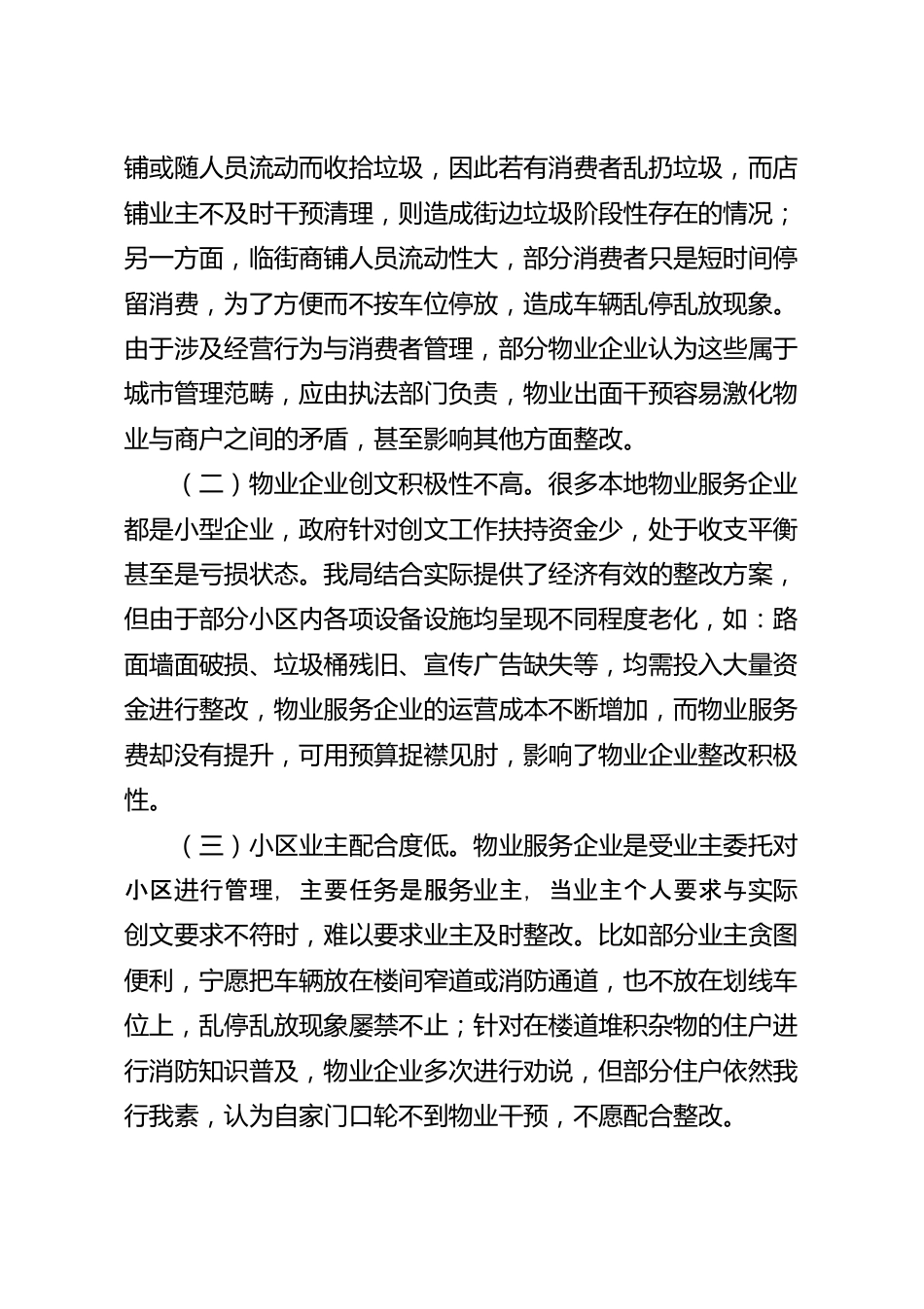 在住建局创文工作表态发言稿2023年上半年,区住建局紧紧围绕创建全国文明城市工作大局,以时不我待的使命感、责任感,上下一心,主动作为,稳步推进创文工作。一、阶段性成效一是推进建筑外墙专项整治。基本完成*等老旧城区主次干道、学校、农贸市场周边等建筑物外立面修缮、美化工作,抓好了*花园等3个老旧小区改造。二是加强建筑工地施工扬尘和围蔽管理。1-6月检查在建工程435项次,城区26个在建工地全部完成创文围挡挂设,较好发挥了创文宣传效果。三是大力物业小区督导整治。1-6月共出动检查人员164人次,检查物业小区81个次,完成督办任务76次,联合开展专项检查,督促物业企业落实整改。二、存在问题及原因分析根据《*“”公共文明指数综合测评红黑榜通报(5月份)》,我局成绩为*分,被列入黑榜名单。结合第三方测评结果与问题清单,创文主要问题存在于物业管理方面,具体体现在:临街店铺附近有乱扔垃圾、临街店铺和小区内有车辆乱停乱放、楼道内有堆积杂物等不文明现象。我局高度重视,深刻反思存在问题,组织开展自查整改,迅速查找形成以上问题的形成原因:(一)临街店铺人员流动性大、可控性低。一方面,物业保洁人员是定时进行垃圾清扫和清运,不能长期驻扎在某个店铺或随人员流动而收拾垃圾,因此若有消费者乱扔垃圾,而店铺业主不及时干预清理,则造成街边垃圾阶段性存在的情况;另一方面,临街商铺人员流动性大,部分消费者只是短时间停留消费,为了方便而不按车位停放,造成车辆乱停乱放现象。由于涉及经营行为与消费者管理,部分物业企业认为这些属于城市管理范畴,应由执法部门负责,物业出面干预容易激化物业与商户之间的矛盾,甚至影响其他方面整改。(二)物业企业创文积极性不高。很多本地物业服务企业都是小型企业,政府针对创文工作扶持资金少,处于收支平衡甚至是亏损状态。我局结合实际提供了经济有效的整改方案,但由于部分小区内各项设备设施均呈现不同程度老化,如:路面墙面破损、垃圾桶残旧、宣传广告缺失等,均需投入大量资金进行整改,物业服务企业的运营成本不断增加,而物业服务费却没有提升,可用预算捉襟见肘,影响了物业企业整改积极性。(三)小区业主配合度低。物业服务企业是受业主委托对小区行管理,主要任是服主,当主个人要求与进务务业业实际创文要求不符时,难以要求业主及时整改。比如部分业主贪图便利,宁愿把车辆放在楼间窄道或消防通道,也不放在划线车位上,乱停乱放现象屡禁不止;针对在楼道堆积杂物的住户进行消防知识普及,物业企业多次进行劝说,但部分住户依然我行我素,认为自家门口轮不到物业干预,不愿配合整改。(四)联合执法成效不明显。我局联合相关部门针对物业小区行沟通和磋商,共同推文工作。但于乱问题进进创对车辆停放、小区周围临街商户占道经营等问题,相关部门表示属于小区范内,法不适用。此外,于堵塞消防通道等围问题执权对问题,执法对象本应是具体业主而非物业企业,但最终责任依然落到物业企业肩上,导致物业企业孤军奋战,管理没有底气、工作不得民心、整改停滞不前。三、下一步工作计划一是强化责任落实。指导物业服务企业与小区临街商铺签“”订门前三包责任告知书,强化商户文明经商责任,加大小区临街商铺的保洁力度与频次。二是强化规划引导。指导具备条件的小区尽快实现车位应划尽划,并采取曝光教育、正面宣传等多种方式纠正居民长期占用消防通道的现象,为业主居民、来往群众提供更多停车位。三是强化联合执法。加强部门联动,针对楼梯间堆积私人杂物、乱扔垃圾等不文明行为进行劝说与教育,联合属地综合执法大队、城管、公安等多部门共同执法和监管,多管齐下。四是强化宣传引导。通过丰富宣传活动形式,深入群众展示创文作用,倡导市民自觉遵守文明行为规范,践行文明行为促进条例,从小事做起,从个人做起,共建文明和谐美丽宜居*。志行万里者,不中道而辍足。*住建局将深入贯彻落实本次会议精神,以踏石留印、抓铁有痕的决心,全力以赴完成相关问题整改,扎实做好文明城市创建各项工作,坚决为打赢创文攻坚战,贡献住建力量,为创文工作的全面胜利交出一份满意答卷!
