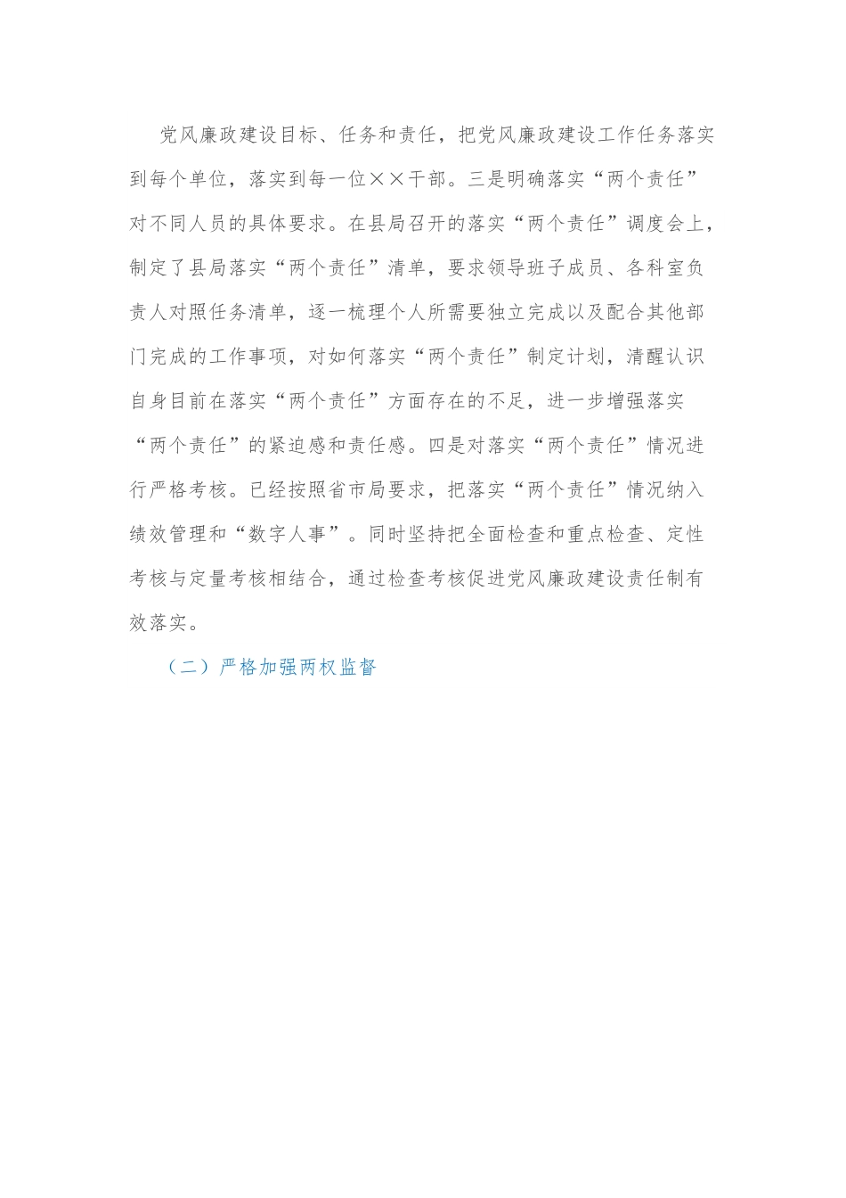 局党组2021年度落实党风廉政建设主体责任报告今年以来,××县××局在市局的正确领导下,以市局提出的“×××工作思路”为目标,认真执行“两个责任”要求,切实把市局的决策部署和工作指示落到实处。现根据上级工作要求,对县局党组落实党风廉政建设主体责任情况进行汇报:一、2021年××县局党组落实党风廉政建设主体责任情况(一)全面落实“两个责任”一是深刻领会落实“两个责任”的工作要求。今年市局召开落实“两个责任”推进会后,××县××局立即行动,先后召开县局落实“两个责任”推进会和调度会,将省局落实“两个责任”的意见和任务清单下发领导班子成员和各科室分局负责人,组织全体××干部认真学习、深入贯彻落实市局会议所传达的精神,深刻明确落实“两个责任”对于推动××工作进步的重要作用。二是进一步强化责任意识,狠抓责任落实。按照“党组统一领导、一把手负总责、分管领导分工负责、纪检监察部门组织协调、部门各负其责、××干部积极参与”的总要求,2021年××县局共召开两次党风廉政专题会议,由党组听取各科室分局落实党风廉政建设责任制情况汇报,对县局的反腐倡廉工作进行部署。年初班子主要负责人与分局长、分管局长与分管部门、部门与具体人员三个层面,认真签订《2021年党风廉政建设责任状》,并按照责任状的要求,及时对党风廉政建设所涉及到的各项任务进行分解,按照党组成员、各部门的工作职责和分工,分别落实党风廉政建设目标、任务和责任,把党风廉政建设工作任务落实到每个单位,落实到每一位××干部。三是明确落实“两个责任”对不同人员的具体要求。在县局召开的落实“两个责任”调度会上,制定了县局落实“两个责任”清单,要求领导班子成员、各科室负责人对照任务清单,逐一梳理个人所需要独立完成以及配合其他部门完成的工作事项,对如何落实“两个责任”制定计划,清醒认识自身目前在落实“两个责任”方面存在的不足,进一步增强落实“两个责任”的紧迫感和责任感。四是对落实“两个责任”情况进行严格考核。已经按照省市局要求,把落实“两个责任”情况纳入绩效管理和“数字人事”。同时坚持把全面检查和重点检查、定性考核与定量考核相结合,通过检查考核促进党风廉政建设责任制有效落实。(二)严格加强两权监督一是强化群众监督。以省市局关于执行中央八项规定的实施意见为标准,对全县××干部如何改进工作作风、密切联系群众提出具体工作目标。坚持把贯彻落实八项规定纳入经常性监督检查,公开举报电话,并将改进工作作风、密切联系群众有关要求融入落实党风廉政建设责任制工作之中。二是强化上级监督。按照市局要求,实行零申报、定期报告、重大问题24小时内报告制度,对报告内容实行县局一把手和纪检组长双签字背书,明确了责任,强化了监督。三是强化党内监督。实现党组内部的有效监督,防止权力不受制约而导致腐败。在党组成员分工上注意分权制约原则的运用。同时坚持党组民主集中制的原则,党组议大事按程序决策,民主研究决定。四是构筑监督体系。认真贯彻执行《××××》,依据各部门工作规程,落实责任追究制,构筑事前源头防范、事中监督保障、事后查实处罚的“两权”监督体系。2021年9月份迎接了市局八项规定专项检查,取得了较好的结果。(三)统筹推进内控机制建设一是制定内控机制建设方案。2021年上半年,××县局按照市局《××市××系统关于进一步深化内控机制建设的实施意见》的要求,制定内控机制建设方案,明确每个阶段的工作任务,组织好落实工作。二是组织召开内控调度会议。先后召开四次内控调度会议,18个科室分局均按照实施方案要求重新归纳了工作职责,确定了岗位个数,总结了重要权力事项,对本单位的风险进行了排查和统计,在本单位中研究和讨论筛选出高风险项目,并制定了更清晰明确的权力行使标准,让××干部明白,在什么情况下需要行使权力,行使哪种权力,权力以何种方式行使,权力行使要达到什么目的。三是严格防范执法风险。下半年将执法风险作为重点,对相关业务科室和分局业务工作中存在的执法风险进行细致、全面梳理,按照可执行、可跟踪、可完善的要求,逐项制定防范措施并确...