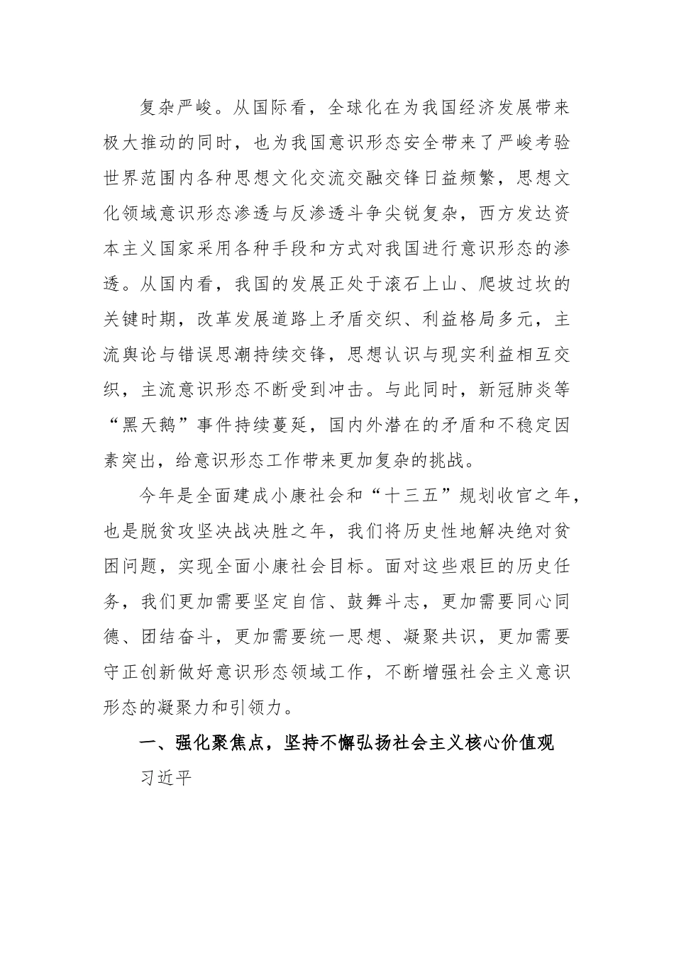 做好意识形态工作的研讨发言:守正创新做好新形势下的意识形态工作《习近平谈治国理政》第三卷,以一系列具有原创性、时代性、指导性的重大思想观点,生动展示了党的理论创新成果,是一部闪耀着马克思主义真理光芒的纲领性文献在习近平总书记治国理政思想体系中,党的意识形态创新是一个十分重要的方面。习近平总书记立足中国实际、着眼民族复兴、致力人类进步,确立以“民族复兴中国梦”为引领的思想理论体系,并将其凝聚成为全社会共同理想加强以“党内政治文化自信”为核心的思想文化建设,塑造形成全民族文化自觉;探索以“人类命运共同体”为主旨的人类社会发展规律,积极构建全世界思想认同,一步一个脚印推动着党的意识形态创新,为新形势下加强党的思想建设、理论建设和文化建设提供了根本遵循和方法论指导。党的十八大以来,党和国家始终把意识形态领域工作摆在重要位置加以推进,习近平新时代中国特色社会主义思想深入人心,中国特色社会主义和中国梦广泛认同,社会主义核心价值观和中华优秀传统文化大力弘扬,主流思想舆论不断巩固壮大,“四个自信”得到充分彰显,国家文化软实力和中华文化影响力大幅提升,全党全社会思想上的团结统一更加巩固。但我们也要清醒地认识到,意识形态领域斗争形势依然复杂严峻。从国际看,全球化在为我国经济发展带来极大推动的同时,也为我国意识形态安全带来了严峻考验世界范围内各种思想文化交流交融交锋日益频繁,思想文化领域意识形态渗透与反渗透斗争尖锐复杂,西方发达资本主义国家采用各种手段和方式对我国进行意识形态的渗透。从国内看,我国的发展正处于滚石上山、爬坡过坎的关键时期,改革发展道路上矛盾交织、利益格局多元,主流舆论与错误思潮持续交锋,思想认识与现实利益相互交织,主流意识形态不断受到冲击。与此同时,新冠肺炎等“黑天鹅”事件持续蔓延,国内外潜在的矛盾和不稳定因素突出,给意识形态工作带来更加复杂的挑战。今年是全面建成小康社会和“十三五”规划收官之年,也是脱贫攻坚决战决胜之年,我们将历史性地解决绝对贫困问题,实现全面小康社会目标。面对这些艰巨的历史任务,我们更加需要坚定自信、鼓舞斗志,更加需要同心同德、团结奋斗,更加需要统一思想、凝聚共识,更加需要守正创新做好意识形态领域工作,不断增强社会主义意识形态的凝聚力和引领力。一、强化聚焦点,坚持不懈弘扬社会主义核心价值观习近平总书记强调:“我国是一个有着xx亿多人口、xx个民族的大国,确立反映全国各族人民共同认同的价值观‘最大公约数’”,“关乎国家前途命运,关乎人民幸福安康”,必须“把培育和弘扬社会主义核心价值观作为凝魂聚气、强基固本的基础工程”。历史和实践已经充分证明无论在任何社会和时代,意识形态安全出现问题的根源都是在于核心价值观发生了动摇与改变。国家意识形态越是能够被社会成员的大多数所接受并认同,国家意识形态就越安全,与此相应,它在国家发展中所承担的精神引领的力量也就越强大。因此,要挖掘和阐释社会主义内涵,把社会主义核心价值观融入社会发展各方面,充分调动各方面的积极性,有效整合社会意识,增强社会主义意识形态的吸引力,提高全国各族人民对以中国共产党领导为最本质特征的中国特色社会主义制度的认同程度,建设具有强大凝聚力和引领力的社会主义意识形态,从而不断巩固全党全国各族人民团结奋斗这一共同思想基础,凝聚起实现中华民族伟大复兴中国梦的强大精神力量。政协系统做好意识形态工作,要牢牢把握社会主义协商民主重要渠道和专门协商机构的工作定位,牢牢把握团结民主两大主题,坚持开放协商、开门协商,协商与民、协商为民,以融入促深化、以学习促内化、以载体促转化将社会主义核心价值观落实到建言资政和凝聚共识双向发力工作中。二、把握关键点,一以贯之坚定“四个自信”习近平总书记强调:“要把坚定‘四个自信’作为建设社会主义意识形态的关键。”当前,社会思想日趋多元化,我们需要在“惊涛骇浪”中掌握“定海神针”;敌对势力“西化”“分化”的图谋始终未变,我们需要对国家“举什么旗、走什么路”“如何强起来”有清醒认识;社会主义核心价值...