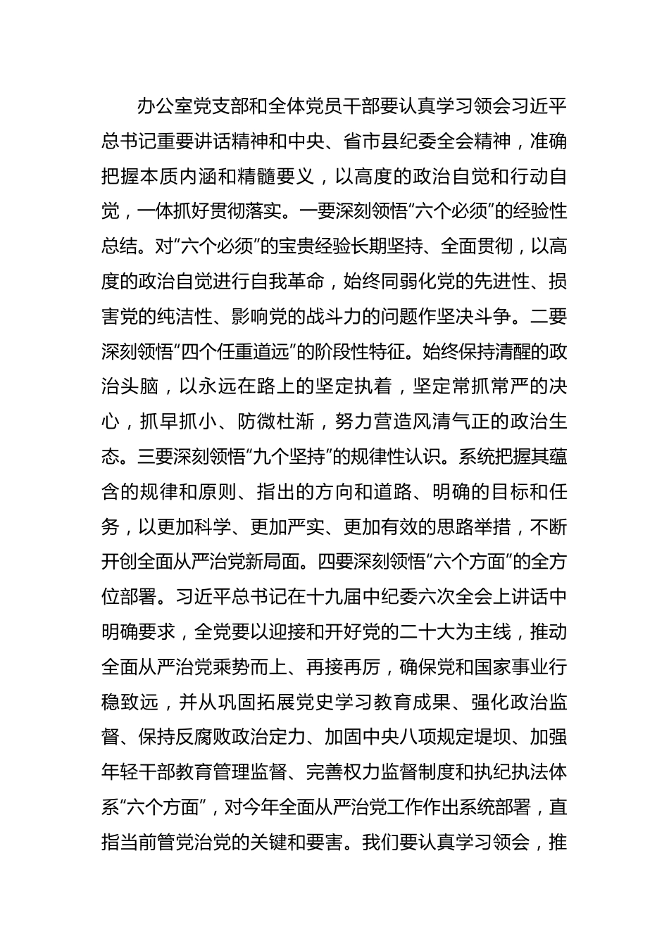 纪检组长在县委办党风廉政建设暨警示教育会议上的讲话同志们:根据县纪委监委要求,按照本次会议安排,下面,我代表县纪委监委派驻县委办纪检监察组,就助推做好县委办领导班子深化全面从严治党、落实落细党风廉政建设主体责任工作讲以下三个方面:一、深化思想认识,增强不断推进全面从严治党的政治自觉办公室党支部和全体党员干部要认真学习领会习近平总书记重要讲话精神和中央、省市县纪委全会精神,准确把握本质内涵和精髓要义,以高度的政治自觉和行动自觉,一体抓好贯彻落实。一要深刻领悟“六个必须”的经验性总结。对“六个必须”的宝贵经验长期坚持、全面贯彻,以高度的政治自觉进行自我革命,始终同弱化党的先进性、损害党的纯洁性、影响党的战斗力的问题作坚决斗争。二要深刻领悟“四个任重道远”的阶段性特征。始终保持清醒的政治头脑,以永远在路上的坚定执着,坚定常抓常严的决心,抓早抓小、防微杜渐,努力营造风清气正的政治生态。三要深刻领悟“九个坚持”的规律性认识。系统把握其蕴含的规律和原则、指出的方向和道路、明确的目标和任务,以更加科学、更加严实、更加有效的思路举措,不断开创全面从严治党新局面。四要深刻领悟“六个方面”的全方位部署。习近平总书记在十九届中纪委六次全会上讲话中明确要求,全党要以迎接和开好党的二十大为主线,推动全面从严治党乘势而上、再接再厉,确保党和国家事业行稳致远,并从巩固拓展党史学习教育成果、强化政治监督、保持反腐败政治定力、加固中央八项规定堤坝、加强年轻干部教育管理监督、完善权力监督制度和执纪执法体系“六个方面”,对今年全面从严治党工作作出系统部署,直指当前管党治党的关键和要害。我们要认真学习领会,推动中央、省市县委全面从严治党部署要求不折不扣落实到位。二、正视问题差距,强化持续推动全面从严治党的政治定力面对全面从严治党的新形势新任务新要求,我们必须清醒认识到工作中存在的差距和不足。县委办是政治机关,承担着贯彻县委重要工作部署,组织协调全县重大活动,负责组织协调对全县政治、经济、社会等方面的重大问题进行调查研究,为县委决策提供依据等等重要职责,这对我们提出了更高、更严的要求,我们更要注重克服存在问题。全面从严治党压力传导还需持续加强,党建、党风廉政建设同业务工作同部署、同考核还不够到位,日常谈话缺乏针对性;个别党员干部还存在说得多、行动少、落实慢的问题,一些干部业务不精,对习总书记重要讲话、指示批示精神及中央、省市县委政策、决策不熟悉,不精准,担当意识不强,精神懈怠,自我满足倾向比较明显。以上这些问题,是我们通过走访调研,并从县纪委监委机关室组听取了解梳理归纳。指出这些问题,不是否定工作成绩,是为了防患于未然,及时发现堵点、痛点和风险点,县委办领导班子必须站在政治的高度看待问题、审视问题,切实担起管党治党政治责任,主动对标对表找差距、从严从实担责任,时刻保持严的主基调,把严的导向体现在管党治党全过程。三、强化责任担当,坚定不移推进全面从严治党向纵深发展县委办是县委的综合办事机构,处于承上启下、协调左右的中枢位置,发挥以文辅政作用,在全县工作大局中地位特殊、作用特殊、影响特殊,凡事都要率先垂范,做好表率。对干部队伍的思想意识、作风状况、能力素质等各方面工作要求都很高。为此,办公室要持续深化全面从严治党,推进作风建设常态化、长效化,努力打造一支作风硬、能力强、效率高的办公室队伍。一要强化政治引领,持续深化学习教育。办公室领导班子要把学懂弄通做实习近平新时代中国特色社会主义思想作为首修课和必修课,深入学习领会贯彻党的二十大精神及中央、省市县纪委全会精神,持续加强“四史”学习教育,让初心使命在内心深处真正扎根,把“四个意识”“四个自信”融入灵魂、融进事业,坚定捍卫“两个确立”、坚决做到“两个维护”,真正把党史学习教育成果转化为推动工作高质量发展的强劲动力。二要增强使命担当,压实压细主体责任。要以高度的政治自觉和行动自觉,把全面从严治党的主体责任扛在肩上抓在手上,经常听取和研究党风廉政建设工作,切实做到党风廉政...