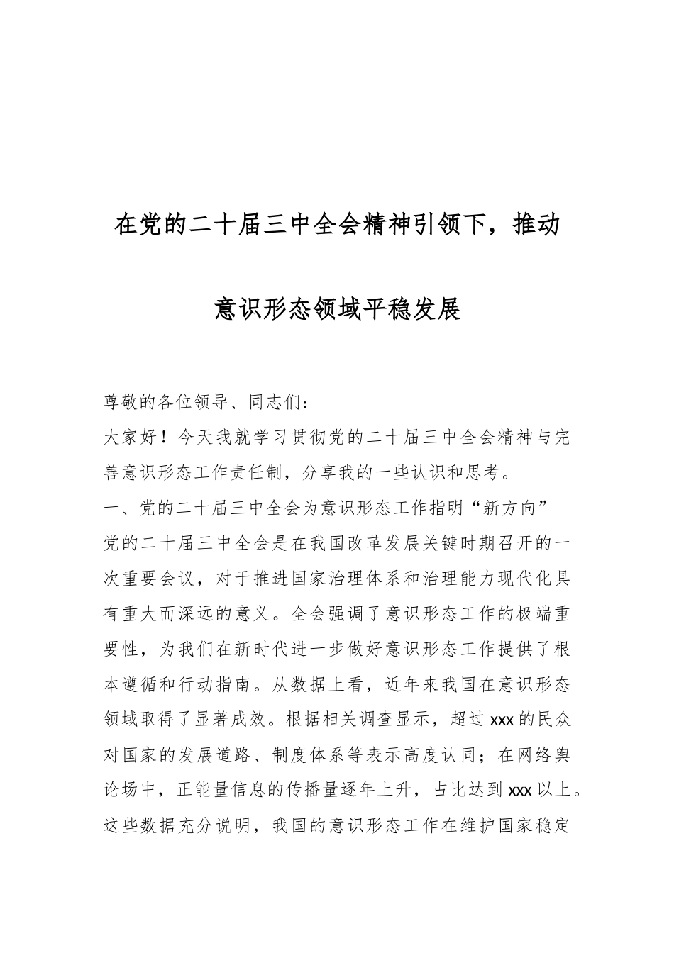 在党的二十届三中全会精神引领下,推动意识形态领域平稳发展尊敬的各位领导、同志们:大家好!今天我就学习贯彻党的二十届三中全会精神与完善意识形态工作责任制,分享我的一些认识和思考。一、党的二十届三中全会为意识形态工作指明“新方向”党的二十届三中全会是在我国改革发展关键时期召开的一次重要会议,对于推进国家治理体系和治理能力现代化具有重大而深远的意义。全会强调了意识形态工作的极端重要性,为我们在新时代进一步做好意识形态工作提供了根本遵循和行动指南。从数据上看,近年来我国在意识形态领域取得了显著成效。根据相关调查显示,超过xxx的民众对国家的发展道路、制度体系等表示高度认同;在网络舆论场中,正能量信息的传播量逐年上升,占比达到xxx以上。这些数据充分说明,我国的意识形态工作在维护国家稳定凝聚民族力量方面发挥了重要作用。然而,我们也不能忽视当前意识形态领域面临的挑战。随着全球化的深入发展信息技术的飞速进步,各种思想文化交流交融交锋更加频繁,意识形态领域的斗争依然复杂严峻。二、当前意识形态工作责任制落实的“现状与挑战”(一)责任意识方面。部分单位和领导干部对意识形态工作的重视程度还不够,存在“说起来重要,做起来次要,忙起来不要”的现象。在一些基层单位,对意识形态工作的认识还停留在表面,没有真正将其纳入到日常工作中。例如,在一些地方的绩效考核中,意识形态工作所占的比重较低,导致部分干部对意识形态工作的积极性不高。据不完全统计,在一些地区的基层单位中,能够将意识形态工作与业务工作同部署、同落实、同考核的比例仅为xxx左右。(二)工作机制方面。意识形态工作责任制的落实机制还不够完善,存在职责不清、任务不明的问题。在一些部门和单位,意识形态工作的责任分工不够明确,导致工作出现推诿扯皮的现象。同时,监督考核机制也不够健全,对意识形态工作的考核评价缺乏科学的标准和方法,难以准确衡量工作的成效。例如,在一些地方的意识形态工作考核中,主要以查看资料、听取汇报等方式进行,缺乏对实际工作效果的深入考察,使得考核结果的真实性和可靠性受到一定影响。(三)阵地管理方面。随着互联网的快速发展,网络意识形态阵地的管理难度不断加大。一些网络平台存在信息审核不严格、不良信息泛滥等问题,对社会舆论产生了不良影响。据统计,每年我国相关部门查处的网络违法违规信息数量高达数百万条。同时,在一些传统的意识形态阵地如学校、媒体等,也存在着管理不到位的情况,部分教师、媒体从业人员的政治意识和责任意识不强,容易受到错误思想的影响。三、以党的二十届三中全会精神为指引,完善意识形态工作责任制“新举措”(一)强化责任意识,明确责任主体。各级党委(党组)要切实担负起意识形态工作的主体责任,把意识形态工作纳入重要议事日程,与经济建设、政治建设、文化建设、社会建设、生态文明建设和党的建设等工作同部署、同落实、同考核。要明确领导班子成员的具体责任,建立健全意识形态工作责任制的责任清单,确保责任到人、任务到岗。例如,可以建立意识形态工作联系点制度,每位领导干部联系一个基层单位或一个重点领域,定期指导和督促意识形态工作的开展。(二)完善工作机制,加强协同配合。建立健全意识形态工作的协调机制,加强宣传、文化、教育、公安等部门之间的沟通协作,形成工作合力。要完善监督考核机制,制定科学合理的考核评价指标体系,加强对意识形态工作的日常监督和定期考核。例如,可以建立意识形态工作述职评议制度,每年组织各级党委(党组)书记进行意识形态工作述职,接受群众的评议和监督。同时,要加强对考核结果的运用,将考核结果与干部的选拔任用、奖惩激励等挂钩,确保意识形态工作责任制落到实处。(三)加强阵地建设,守好舆论阵地。加强对网络意识形态阵地的管理,加大对网络违法违规行为的打击力度,净化网络环境。要加强对各类媒体的管理,坚持正确的舆论导向,提高新闻舆论的传播力、引导力、影响力、公信力例如,可以建立网络舆情监测和应对机制,及时发现和处理网络舆情事件,维护社会稳定。同时,要加强对学校、文化场馆...