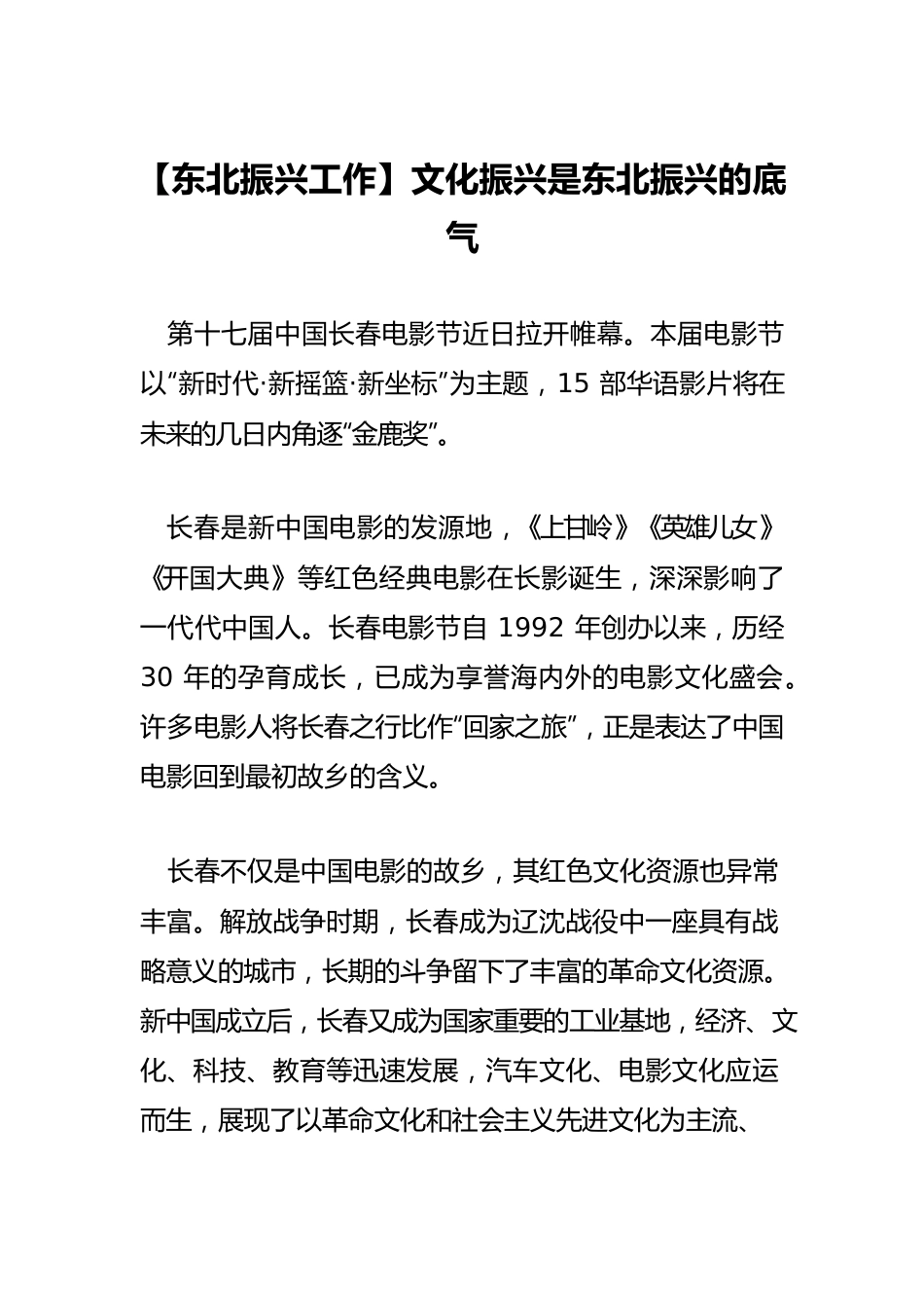 【东北振兴工作】文化振兴是东北振兴的底气第十七届中国长春电影节近日拉开帷幕。本届电影节以“新时代·新摇篮·新坐标”为主题,15部华语影片将在未来的几日内角逐“金鹿奖”。长春是新中国电影的发源地,《上甘岭》《英雄儿女》《开国大典》等红色经典电影在长影诞生,深深影响了一代代中国人。长春电影节自1992年创办以来,历经30年的孕育成长,已成为享誉海内外的电影文化盛会。许多电影人将长春之行比作“回家之旅”,正是表达了中国电影回到最初故乡的含义。长春不仅是中国电影的故乡,其红色文化资源也异常丰富。解放战争时期,长春成为辽沈战役中一座具有战略意义的城市,长期的斗争留下了丰富的革命文化资源。新中国成立后,长春又成为国家重要的工业基地,经济、文化、科技、教育等迅速发展,汽车文化、电影文化应运而生,展现了以革命文化和社会主义先进文化为主流、多样文化并存的城市文化新特征。长春丰富的红色文化资源只是东北蕴藏的红色文化资源中的一个篇章。广袤的白山黑水,承载着大量珍贵的红色记忆。第一批纳入中国共产党人精神谱系的东北抗联精神、抗美援朝精神、雷锋精神、北大荒精神等伟大精神,其红色根基都在东北。这些红色文化资源所带来超越时空的巨大凝聚力与感召力,深深融入东北人民的精神血脉,也将凝聚起振兴东北的蓬勃动力。就在不久前,习近平总书记考察辽宁,在回望历史中汲取智慧力量,在实地调研中倾听人民心声,在深切瞩望中为东北振兴领航指向。考察的第一站,习近平总书记就来到了辽沈战役纪念馆,看着一件件珍贵的历史文物,叮嘱老战士老同志,“给子孙后代多讲讲革命的故事、英雄的故事,讲讲共产党的光荣历史,让我们的红色江山后继有人、代代相传”。东北具有浓的工业文化基础。东北地区是我国重要♘的老工业基地,中国的第一辆蒸汽机车、第一架喷气式飞机、第一艘万吨级远洋货轮、第一台拖拉机都诞生于此;东北还是英雄劳模辈出的地方,其数量之多、持续时间之长、涉及领域之广、社会影响之大,均系国内罕见。当我们说起大庆精神(铁人精神)、劳模精神,王进喜、郭明义、焦百顺等老一辈英模的形象便浮现在眼前,这是一代人和全国人民的集体记忆。工业文化中蕴含的价值观念、思维方式、工业精神和职业伦理,对增强当代工人的文化认同,营造积极向上的地域氛围,有着深刻而潜移默化的作用。不只红色文化与工业文化,东北还有深的文艺文化♘基础。文学作品、影视作品、文艺作品,当下的东北涌现出一大批具有地域特色的文化现象,展现了东北文化强大的生命力与繁衍力。文化自信是最根本的自信。从这个意义而言,文化振兴是东北振兴的底气。立足区域文化优势,选择性继承与发展东北优秀的传统文化与文化遗产,大力弘扬与发展红色文化与工业文化,这是东北振兴的时代命题,也是东北振兴的历史任务。