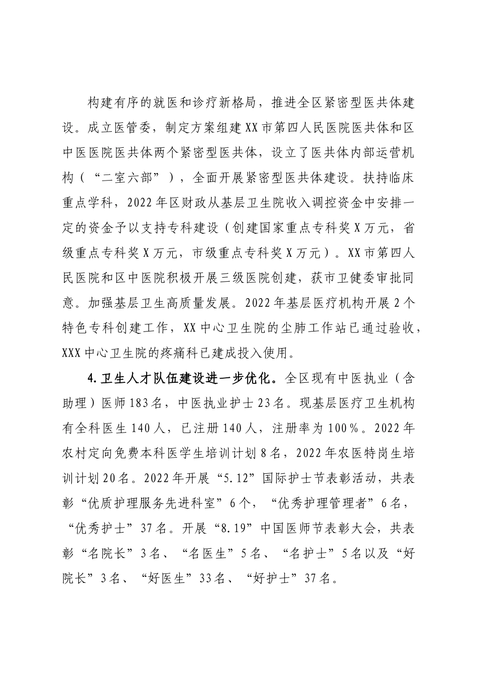 XX区卫生健康局2022年工作总结和2023年工作计划2022年,区卫健局在区委、区政府的领导下,紧紧围绕疫情防控为重点,以深化卫生健康综合改革和医药卫生体制改革为切入点,以改革求创新、促转型、强能力作为工作的出发点和落脚点,不断提升我区卫生健康工作水平,现将2022工作情况汇报如下:一、2022工作总结1.疫情防控总体向好。今年以来,在省市的坚强领导下,在区委区政府的统筹指挥下,坚持“外防输入、内防扩散总策略,坚持”动态清零“总方针,1-11月,累计排查管控省外返零人员X人,全部按要求落实管控措施。成功处置“X.XX”过境疫情,卫健系统出动医务人员X人,请求外市、室内各县市区支援医疗队人员X人,排查密接X人,为打好打赢了“X.XX”疫情防控全民战、阻击战、攻坚战、歼灭战贡献卫健力量。2.床位建设进一步加速。《健康XX行动》2021年考核在全市卫健系统排名第三。区中医综合救治应急能力及占地面积X平方米(约X亩)。初步规划总建筑面积约X平方米,编制床位X张,总投资X亿元的中医康复建设项目(区中医医院搬迁)有序推进。妇保中心整体搬迁项目正在进行室内装修变更设计。乡镇卫生院标准化建设即将全面完成。3.深化医药卫生体制改革。构建有序的就医和诊疗新格局,推进全区紧密型医共体建设。成立医管委,制定方案组建XX市第四人民医院医共体和区中医医院医共体两个紧密型医共体,设立了医共体内部运营机构(“二室六部”),全面开展紧密型医共体建设。扶持临床重点学科,2022年区财政从基层卫生院收入调控资金中安排一定的资金予以支持专科建设(创建国家重点专科奖X万元,省级重点专科奖X万元,市级重点专科奖X万元)。XX市第四人民医院和区中医院积极开展三级医院创建,获市卫健委审批同意。加强基层卫生高质量发展。2022年基层医疗机构开展2个特色专科创建工作,XX中心卫生院的尘肺工作站已通过验收,XXX中心卫生院的疼痛科已建成投入使用。4.卫生人才队伍建设进一步优化。全区现有中医执业(含助理)医师183名,中医执业护士23名。现基层医疗卫生机构有全科医生140人,已注册140人,注册率为100%。2022年农村定向免费本科医学生培训计划8名,2022年农医特岗生培训计划20名。2022年开展“5.12”国际护士节表彰活动,共表彰“优质护理服务先进科室”6个,“优秀护理管理者”6名,“优秀护士”37名。开展“8.19”中国医师节表彰大会,共表彰“名院长”3名、“名医生”5名、“名护士”5名以及“好院长”3名、“好医生”33名、“好护士”37名。5.重点民生实事得到有效落实。根据省、市政府的统一部署和安排,区卫健局承担的重点民生实事项目共4项,截止11月28日,“两癌”筛查累计完成12001人,完成总任务的100%;产前筛查累计完成2412人,完成率104.84%;老年人免费体检完成45013人,完成率90.03%。6.中医药事业创新发展。以XX区中医医院为龙头,大力提升中医药服务能力。区中医医院XX卷烟厂分院改扩建项目于2022年1月17日正式投入使用,总投资XXXX万元,新增床位70张,主要满足社区便捷就医和医养服务。鼓励社会力量举办中医医疗机构,截止2022年11月底,XX区辖区内共有中医类民营医院1家,中医类诊所36家。持续推进基层中医药人才培养。6、做好意识形态工作。截止11月底,登载通讯稿件424篇,其中一类稿件1篇,二类稿件190篇,四类稿件233篇,创建三类专版3个。共处置中国政府网、红网百姓呼声、市区长信箱等平台网络舆情180余起,回复网络信息180条,及时发布信息180条,回复率和及时率都达100%。今年推出2个卫健系统先进典型:“忠诚担当守初心规范执法践使命”的“全省卫生健康综合监督工作表现突出个人”XXX和“四先”达人——XX市XX区职业健康先进工作者XXX。二、当前工作存在的突出问题1.疫情防控方面。防控机制还有待健全,医疗机构院感防控,隔离点管理还有待加强,疫情防控服务能力还有待提升。2.卫生服务体系项目建设方面。缺乏项目资金,导致妇保院和剩下的四个乡镇卫生院标准化建设进度缓慢。3.医疗资源分布还不均衡。优质医疗卫生资源大都集中城区,农村地区卫生专业人才队伍薄弱,人才留住难、晋升难、发展难。三、2023年工作谋划1.切实抓...