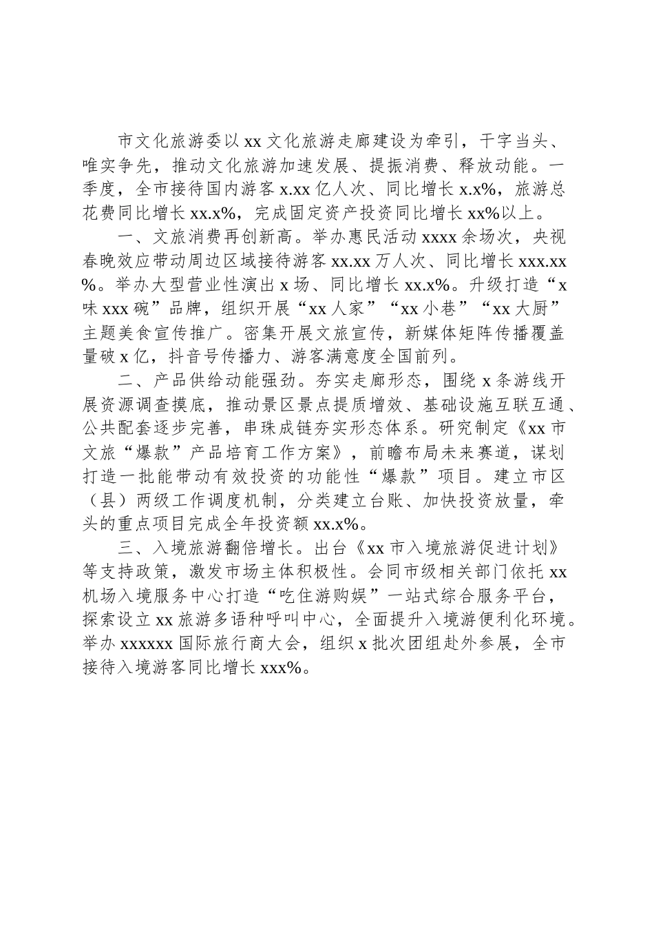 市区县委书记和部门一把手例会发言材料汇编(10篇)目录1.激活文旅新引擎跑出发展加速度助推全市经济高质量发展22.民生为大就业优先奋力跑出高质量充分就业“加速度”..43.深化实施“智融惠畅”工程以高质量金融服务助推经济高质量发展.........................................................................................64.融入“六区一高地”扛起小县大担当奋力夺取一季度“开门红”.............................................................................................85.干字当头唯实争先加快探索跨越式高质量发展新路子....106.发展为要项目为王奋力推动经济社会高质量发展............127.精准落子消费促进市场产业民生满盘皆活........................148.突出“链”上发力推动工业高质量发展跑出加速度........169.拓展主战场做强主力军激活主引擎推动工业经济跑出扩量提质新速度...................................................................................1810.强化项目引领夯实产业支撑全力推动经济高质量发展..20激活文旅新引擎跑出发展加速度助推全市经济高质量发展市文化旅游委以xx文化旅游走廊建设为牵引,干字当头、唯实争先,推动文化旅游加速发展、提振消费、释放动能。一季度,全市接待国内游客x.xx亿人次、同比增长x.x%,旅游总花费同比增长xx.x%,完成固定资产投资同比增长xx%以上。一、文旅消费再创新高。举办惠民活动xxxx余场次,央视春晚效应带动周边区域接待游客xx.xx万人次、同比增长xxx.xx%。举办大型营业性演出x场、同比增长xx.x%。升级打造“x味xxx碗”品牌,组织开展“xx人家”“xx小巷”“xx大厨”主题美食宣传推广。密集开展文旅宣传,新媒体矩阵传播覆盖量破x亿,抖音号传播力、游客满意度全国前列。二、产品供给动能强劲。夯实走廊形态,围绕x条游线开展资源调查摸底,推动景区景点提质增效、基础设施互联互通、公共配套逐步完善,串珠成链夯实形态体系。研究制定《xx市文旅“爆款”产品培育工作方案》,前瞻布局未来赛道,谋划打造一批能带动有效投资的功能性“爆款”项目。建立市区(县)两级工作调度机制,分类建立台账、加快投资放量,牵头的重点项目完成全年投资额xx.x%。三、入境旅游翻倍增长。出台《xx市入境旅游促进计划》等支持政策,激发市场主体积极性。会同市级相关部门依托xx机场入境服务中心打造“吃住游购娱”一站式综合服务平台,探索设立xx旅游多语种呼叫中心,全面提升入境游便利化环境。举办xxxxxx国际旅行商大会,组织x批次团组赴外参展,全市接待入境游客同比增长xxx%。民生为大就业优先奋力跑出高质量充分就业“加速度”市人力社保局全面落实市委“新春第一会”精神,扩容量做增量、提质量,推动全市城镇新增就业人数同比增长x.x%。一、推动“三个转化”,扩大就业容量。推动新质生产力转化为就业新潜力,推行用工服务“四单制”,举办招聘活动xxxx场,促进“xxxxx”现代制造业企业吸纳就业。推动政策工具箱转化为就业新空间,用足失业保险降费、社保补贴等存量政策,用好县域制造业就业补贴等增量政策,为企业提供低利率“稳岗贷”。推动消费新热点转化为就业新渠道,拓展低空经济、文旅康养等领域岗位,实施专项行动,培育xxx个主题夜市带动就业。二、实施“三大行动”,做大就业增量。实施百万高校毕业生等青年留x来x就业创业行动,推出十万大学生职业体验万名大学生基层就业等专项,促进青年留x来xx.x万人,青年西部就业创业首选之城成势见效。启动农民工就近就业三年行动,新增农民工就近就业xx.x万人,“引老乡、回家乡、建家乡”初见成效。实施“x创x新”创业促进行动,促进全市新增创业人数同比增长x.x%,创新引领创业、创业带动就业的倍增效应持续释放。三、强化“三项赋能”,提升就业质量。数字赋能促就业迭代“社会·x悦就业”应用,动态归集岗位xx万个,精准服务劳动者。培训赋能助就业,健全城乡一体全生命周期就业培训机制,技能培训与产业匹配度提高xx.x%。服务赋能稳就业,健全超大城市就业公共服务体系,实现零就业家庭动态清零。深化实施“智融惠畅”工程以高质量金...