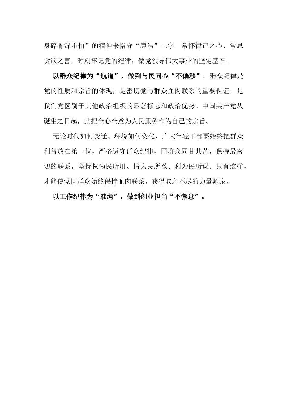 2024年学习教育严守党的“六大纪律”(政治纪律、组织纪律、廉洁纪律、群众纪律、工作纪律、生活纪律)研讨发言稿【5篇文】习近平总书记指出,年轻干部一定要有清醒的认识,经常对照党的理论和路线方针政策、对照党章党规党纪、对照初心使命,看清一些事情该不该做、能不能干,守住拒腐防变的防线。年轻干部生逢伟大时代,是党的国家事业发展的生力军,要以党的政治纪律、组织纪律、廉洁纪律、群众纪律、工作纪律、生活纪律为行动准则,时刻自重自省,扣好廉洁从政的“第一粒扣子”,努力成为党和人民忠诚可靠的干部。以政治纪律为“保障”,做到对党忠诚“不动摇”。政治纪律是党的所有纪律中最重要、最根本、最关键的纪律,是各级党组织和全体党员在政治方向、立场、言论和行为方面必须遵守的基本准则,是维护党的团结统一的根本保证。政治纪律对年轻干部来说就是“紧箍咒”“高压线”,只有严守政治纪律,才能在政治原则”政治立场、政治观点和路线、方针、政策上,始终同党中央保持高度一致。要准确把握新发展阶段、贯彻新发展理念、构建新发展格局、推动高质量发展,时时处处向党中央看齐,扎扎实实贯彻党中央决策部署,确保执行不偏向、不变通、不走样。以组织纪律为“纽带”,做到团结一致“不逾矩”。中国共产党栉风沐雨、历经坎坷,不断从胜利走向胜利,发展成为世界第一大执政党,组织严密是重要保证。之所以组织严密,是因为有严明的组织纪律作保障。加强组织纪律是建设坚强有力马克思主义政党的必然要求,是我们党的优良传统和强大政治优势。年轻干部应时刻把“四个服从”铭记于心,不犯个人主义、自由主义错误,养成规矩意识,严格遵守党的民主集中制、组织生活制度、请示报告制度等党内的各项规章制度,始终做到守规矩、讲大局、知敬畏。以廉洁纪律为“标尺”,做到为官清白“不越线”。廉洁自律是共产党人最鲜明的特征之一,能否做到清正廉洁,是一个领导干部品行如何的“试金石”,直接关系到干部在群众心中的评价,影响我们党的形象和执政地位。严格遵守廉洁纪律是党员干部的从政底线,是干部清正、政府清廉、政治清明的重要保障。作为新时代的年轻干部必须坚持高线、守住底线,不触底线、不越红线,以“粉身碎骨浑不怕”的精神来恪守“廉洁”二字,常怀律己之心、常思贪欲之害,时刻牢记党的纪律,做党领导伟大事业的坚定基石。以群众纪律为“航道”,做到与民同心“不偏移”。群众纪律是党的性质和宗旨的体现,是密切党与群众血肉联系的重要保证,是我们党区别于其他政治组织的显著标志和政治优势。中国共产党从诞生之日起,就把全心全意为人民服务作为自己的宗旨。无论时代如何变迁、环境如何变化,广大年轻干部要始终把群众利益放在第一位,严格遵守群众纪律,同群众同甘共苦,保持最密切的联系,坚持权为民所用、情为民所系、利为民所谋。只有这样,才能使党同群众始终保持血肉联系,获得取之不尽的力量源泉。以工作纪律为“准绳”,做到创业担当“不懈怠”。工作纪律是党的各级组织和全体党员在党的各项具体工作中必须遵守的行为规则,是党的各项工作正常开展的重要保证。工作纪律强调正确履职,担当尽责,反映工作作风要求。只有严守党的工作纪律,才能做到讲实话、干实事,敢作为、有担当,言必信、行必果,最终向党和人民交出满意的“答卷”。广大年轻干部要勇挑时代重担,自觉在大局下想问题、做工作,让初心使命在内心深处真正扎根,把忠诚于党和人民落到行动上,继承弘扬党的光荣传统和优良作风,为党和人民事业赤诚奉献,在新的赶考之路上考出好成绩。以生活纪律为“明镜”,做到品德高尚“不染尘”。生活纪律是党员在日常生活和社会交往中应当遵守的行为规则,涉及个人品德、家庭美德、社会公德等各个方面,直接关系党的形象。党员的党性,不仅体现在政治生活中,还要体现在日常生活中。作为年轻干部要自觉培养高尚道德情操,杜绝享乐主义、奢靡之风,坚持勤俭办事业的优良作风,大力弘扬社会主义核心价值观,追求健康情趣,从日常生活的小事小节着手,严以修身、正心明道,在生活中做好表率,时时处处体现出共产党员的先进性和纯洁性。2024年党学习...