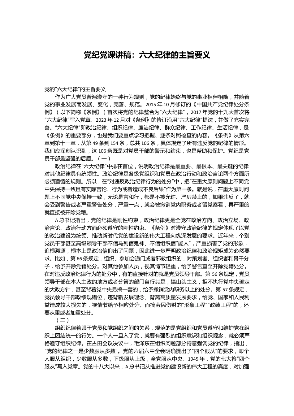 党纪党课讲稿:六大纪律的主旨要义党的“六大纪律”的主旨要义作为广大党员普遍遵守的一种行为规则,党的纪律始终与党的事业相伴相随,并随着党的事业发展而发展、变化,完善、规范。2015年10月修订的《中国共产党纪律处分条例》(以下简称《条例》)首次将党的纪律整合为“六大纪律”,2017年党的十九大首次将“六大纪律”写入党章。2023年12月对《条例》的修订沿用“六大纪律”提法,并做了充实完善。“六大纪律”即政治纪律、组织纪律、廉洁纪律、群众纪律、工作纪律、生活纪律,是《条例》的重要部分,也是我们要重点学习把握、逐条对照检查的内容。《条例》从第六章到第十一章,从第49条到154条,总共106条,具体规定了所有违反党的纪律的情形。我们应深刻认识到,这106条既是对党员干部的警示和约束,也是帮助和保护。党纪是党员干部最坚强的后盾。(一)政治纪律在“六大纪律”中排在首位,说明政治纪律是最重要、最根本、最关键的纪律对其他纪律具有统领性。政治纪律是各级党组织和党员在政治行动和政治言论两个方面所必须遵循的规则。所以,在“对违反政治纪律行为的处分”中,把“在重大原则问题上不同党中央保持一致且有实际言论、行为或者造成不良后果”作为第一条。就是说,在重大原则问题上不同党中央保持一致,无论是言和行,都是不被允许、严厉禁止的,如果违反了,就会受到警告或者严重警告处分,严重一点,就会被撤销党内职务或者留党察看,再严重的就直接被开除党籍。A总书记指出,党的纪律是刚性约束,政治纪律更是全党在政治方向、政治立场、政治言论、政治行动方面必须遵守的刚性约束。《条例》对遵守政治纪律的规定体现了以党的政治建设为统领、推动新时代党的建设新的伟大工程向纵深发展的要求。近年来,个别党员干部甚至高级领导干部不信马列信鬼神、不信组织信“能人”,严重损害了党的形象,追根溯源,根本上是政治信仰出了问题,因此进一步严明政治纪律和政治规矩成为必然要求。比如,第66条规定,组织、参加会道门或者邪教组织的,对策划者、组织者和骨干分子,给予开除党籍处分。对其他参加人员,视其情节轻重,给予警告直至开除党籍处分。在对违反政治纪律行为的处分中,有的直接针对的就是党员领导干部。第56条规定,党员领导干部在本人主政的地方或者分管的部门自行其是,搞山头主义,拒不执行党中央确定的大政方针,甚至背着党中央另搞一套的,给予撤销党内职务以上的处分。第57条规定,党员领导干部政绩观错位,违背新发展理念、背离高质量发展要求,给党、国家和人民利益造成较大损失的,视情节给予相应处分。而搞劳民伤财的“形象工程”“政绩工程”的,还要从重或者加重处分。(二)组织纪律着眼于党员和党组织之间的关系,规范的是党组织和党员遵守和维护党在组织上团结统一的行为。一个人一旦入了党,就要有强烈的组织意识和组织观念,就必须严格遵守组织纪律。在古田会议决议中,毛泽东在组织问题部分特意强调党的纪律,指出,“党的纪律之一是少数服从多数”。党的六届六中全会明确提出了“四个服从”的要求,即个人服从组织,少数服从多数,下级服从上级,全党服从中央。1945年,党的七大将“四个服从”写入党章。党的十八大以来,A总书记从推进党的建设新的伟大工程的高度,对加强党的组织纪律建设作出深刻阐述,强调组织纪律是党性修养的重要内容,必须严格执行各项组织制度;明确组织纪律界限,严肃查处违反组织纪律的行为;强调自觉接受组织安排和纪律约束,自觉维护党的团结统一。新时代我们党在加强组织纪律建设方面采取了一系列措施,为党的理论、路线、方针、政策的贯彻落实提供了组织保证。《条例》对违反组织纪律行为的处分虽然只有17条,但多条规定还作了补充或者“有下列行为之一的”分解,因而文字量并不少。民主集中制是我们党的根本组织原则,作为我们党的一项重要制度,在各个历史时期都发挥了重要作用。新征程上推进强国建设、民族复兴伟业,确保实现党对一切工作的领导,要坚持好、运用好这一制度。《条例》把违反民主集中制原则作为对违反组织纪律行为处分的第一条,规定了四种行为要给予处分,一是拒不执行或者擅...