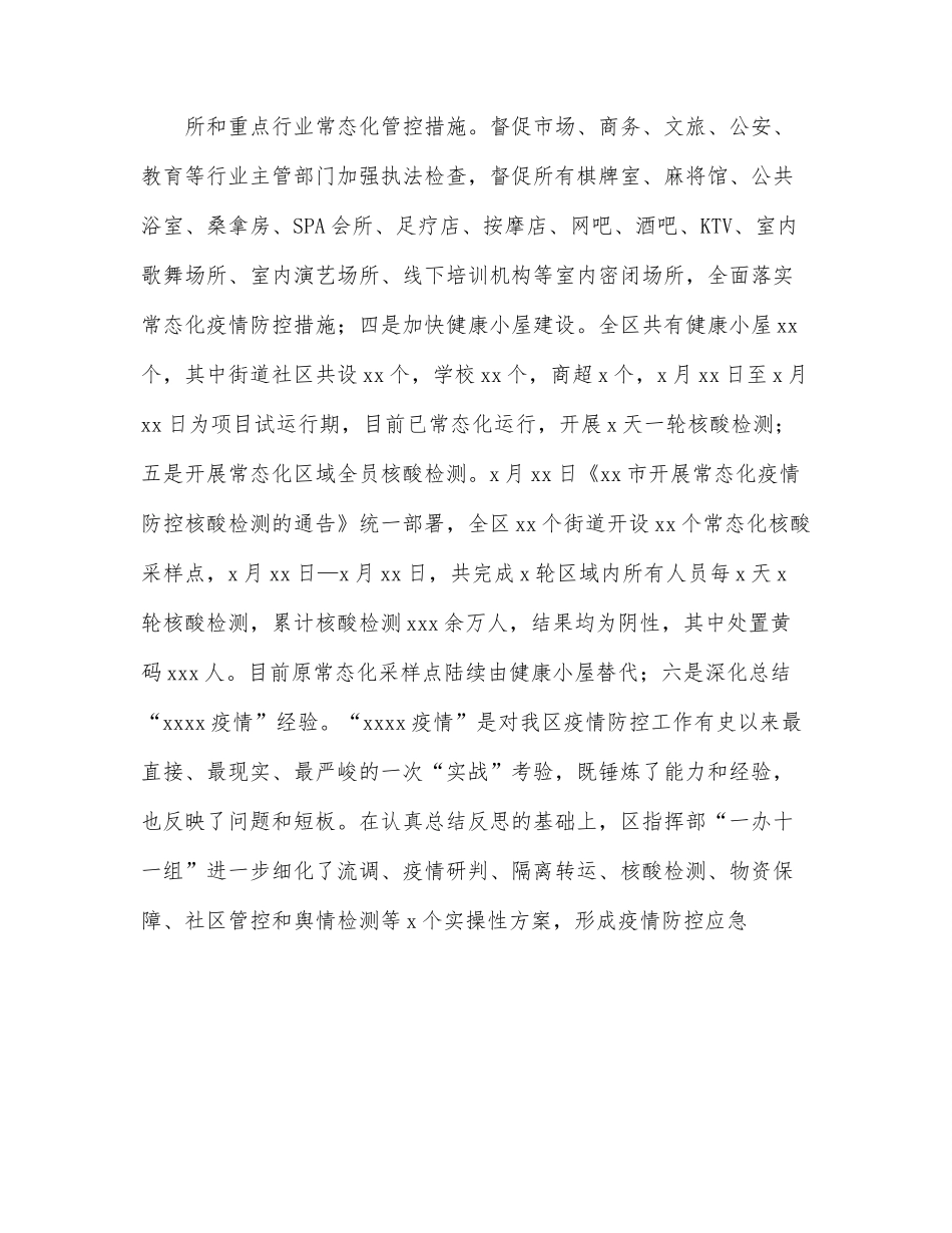 卫健委2022年上半年工作总结(区县)一、上半年工作完成情况(一)扎实开展党建工作。2022年上半年,xx区卫健委党组认真贯彻落实区委和区委组织部的部署要求,认真学习贯彻习近平新时代中国特色社会主义思想为指导,进一步统一思想、提高认识、明确任务,全系统党员干部职工开展党史学习教育,不忘初心、牢记使命、锐意进取,将党建工作与做好新冠肺炎疫情防控、党史学习教育和业务工作紧密结合。一是加强思想理论教育,坚定理想信念,全力做好疫情防控工作。上半年组织党员干部、职工约xxx余人次投入我区大量疫情防控工作并取得了阶段性胜利;二是提升党建规范化水平,加强基层党组织建设。从严抓好党员发展,严格落实党建主体责任。夯实党建基础,严肃组织生活。严格落实“三会一课”制度,抓好党员教育管理,做好党员干部党支部工作联系点的工作;三是加强党风廉政教育,守住廉洁自律底线。坚持将党风廉政建设和业务工作同部署、同安排,开展经常性廉政警示教育,学习《xx区新一轮深化”三个以案“警示教育违法违纪案例选编》、《严重违纪违法党员干部忏悔录选编》等警示教育读本;四是狠抓意识形态工作,筑牢思想防线。认真落实意识形态工作责任制,始终坚持把意识形态工作作为一项政治任务来抓。明确党组书记“第一责任人”、分管领导“直接责任人”、班子成员“一岗双责”责任。注重舆论导向,加强意识形态阵地管理,织牢意识形态安全“保护网”,切实将意识形态工作抓在手、落在实处;五是坚持做好群众信访工作和履行好统一战线工作。扎实做好作风建设,夯实信访工作基础。切实把了解社情民意和群众诉求的各项工作做细做实,引导全民学法尊法知法用法,营造化解矛盾靠法的良好法治氛围。切实形成统一战线工作合力。加强对统战工作的领导,真正肩负起第一责任的使命。做到在思想上高度重视,认识上高度统一,行动上高度自觉。确保落到实处、取得实效。(二)全力以赴做好常态化疫情防控工作。一是持续关注疫情发展形势。坚决贯彻落实习近平总书记关于疫情防控工作的重要指示精神,坚持“外防输入、内防反弹”总策略和“动态清零”的总方针不犹豫不动摇。每周召开一次疫情研判会,分析我区疫情防控风险隐患,明确当前重点、难点和要点工作;加强常态化疫情监测,动态调整重点地区和风险地区来(返)x人员管控措施;二是排查管控重点人员“四个不放松”。严把重点卡口不放松、社区网格化排查不放松、快速流调和重点人群筛查不放松、隔离管控不放松;三是加强重点场所和重点行业常态化管控措施。督促市场、商务、文旅、公安、教育等行业主管部门加强执法检查,督促所有棋牌室、麻将馆、公共浴室、桑拿房、SPA会所、足疗店、按摩店、网吧、酒吧、KTV、室内歌舞场所、室内演艺场所、线下培训机构等室内密闭场所,全面落实常态化疫情防控措施;四是加快健康小屋建设。全区共有健康小屋xx个,其中街道社区共设xx个,学校xx个,商超x个,x月xx日至x月xx日为项目试运行期,目前已常态化运行,开展x天一轮核酸检测;五是开展常态化区域全员核酸检测。x月xx日《xx市开展常态化疫情防控核酸检测的通告》统一部署,全区xx个街道开设xx个常态化核酸采样点,x月xx日—x月xx日,共完成x轮区域内所有人员每x天x轮核酸检测,累计核酸检测xxx余万人,结果均为阴性,其中处置黄码xxx人。目前原常态化采样点陆续由健康小屋替代;六是深化总结“xxxx疫情”经验。“xxxx疫情”是对我区疫情防控工作有史以来最直接、最现实、最严峻的一次“实战”考验,既锤炼了能力和经验,也反映了问题和短板。在认真总结反思的基础上,区指挥部“一办十一组”进一步细化了流调、疫情研判、隔离转运、核酸检测、物资保障、社区管控和舆情检测等x个实操性方案,形成疫情防控应急处置工作规范化、流程化、实用化历史资料,是今后开展疫情防控工作的宝贵经验和教科书。(三)积极推动民生工作任务落实。一是xx区医院不断优化服务流程、改善就医体验,积极开展老年人门诊就医便民服务。有效解决老年人在门诊就医服务中遇到的困难,使老年人在门诊就医中能够享受到方便快捷的服务,切实解决老年人门诊就医过程遇到的问题...