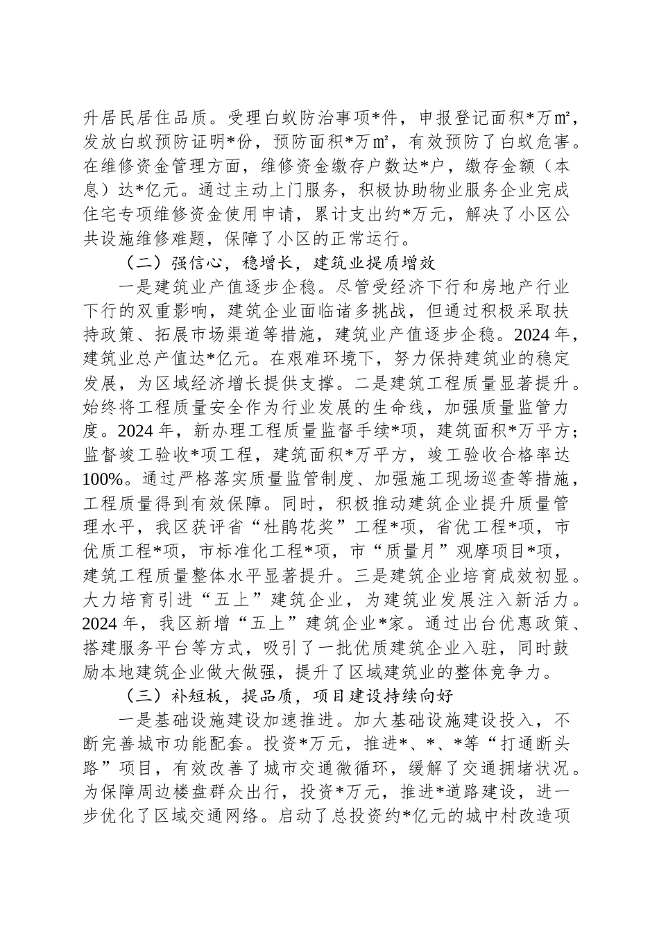 在市住建局年度工作会议上的讲话2024年,在市委市政府的坚强领导与省住建厅的大力支持下,市住建局紧紧围绕中心工作,以推动城乡建设高质量发展为目标,聚焦住房保障、建筑业发展、民生项目建设、民生服务保障等重点领域,攻坚克难、担当作为,各项工作取得了显著成效,为区域经济社会发展和民生改善作出了积极贡献。一、2024年工作回顾(一)稳市场,惠民生,住房保障更加完善一是房地产市场运行平稳。密切关注房地产市场动态,加强市场监测与分析。2024年,新建商品房销售面积达*万㎡,尽管同比有所波动,但市场整体保持平稳态势。其中,住宅销售*万㎡,非住宅销售*万㎡,新建商品住宅成交均价为*元/㎡。通过加强政策引导、规范市场秩序等措施,有效促进了房地产市场的健康发展,保障了购房者的合法权益。二是房屋及房产交易有序推进。在房屋及房产交易备案工作方面,全年共受理房屋面积备案*㎡。完成商品房转移备案*件,面积*万平方米;存量房转移备案*件,面积*万平方米。同时,稳步推进抵押注销业务,共办理抵押注销*件。积极开展存量房资金托管业务,累计托管资金达*亿元,为房产交易安全提供了有力保障,维护了市场交易秩序。三是公租房管理提质增效。持续加强公租房管理,切实保障困难群众住房需求。办理经济适用房上市*户,补缴政府补贴资金*万元。累计发放公租房租赁补贴*户*人,发放金额*万元,有效缓解了低收入家庭的住房压力。积极推进保障性租赁住房筹集工作,完成筹集保障性租赁住房*套,超额完成年度任务,并争取到上级补助资金*万元。加大公租房清(腾)退力度,共清(腾)退*套,确保公租房资源合理高效利用。四是物业管理水平逐步提升。不断强化物业管理服务,提升居民居住品质。受理白蚁防治事项*件,申报登记面积*万㎡,发放白蚁预防证明*份,预防面积*万㎡,有效预防了白蚁危害。在维修资金管理方面,维修资金缴存户数达*户,缴存金额(本息)达*亿元。通过主动上门服务,积极协助物业服务企业完成住宅专项维修资金使用申请,累计支出约*万元,解决了小区公共设施维修难题,保障了小区的正常运行。(二)强信心,稳增长,建筑业提质增效一是建筑业产值逐步企稳。尽管受经济下行和房地产行业下行的双重影响,建筑企业面临诸多挑战,但通过积极采取扶持政策、拓展市场渠道等措施,建筑业产值逐步企稳。2024年,建筑业总产值达*亿元。在艰难环境下,努力保持建筑业的稳定发展,为区域经济增长提供支撑。二是建筑工程质量显著提升。始终将工程质量安全作为行业发展的生命线,加强质量监管力度。2024年,新办理工程质量监督手续*项,建筑面积*万平方;监督竣工验收*项工程,建筑面积*万平方,竣工验收合格率达100%。通过严格落实质量监管制度、加强施工现场巡查等措施,工程质量得到有效保障。同时,积极推动建筑企业提升质量管理水平,我区获评省“杜鹃花奖”工程*项,省优工程*项,市优质工程*项,市标准化工程*项,市“质量月”观摩项目*项,建筑工程质量整体水平显著提升。三是建筑企业培育成效初显。大力培育引进“五上”建筑企业,为建筑业发展注入新活力。2024年,我区新增“五上”建筑企业*家。通过出台优惠政策、搭建服务平台等方式,吸引了一批优质建筑企业入驻,同时鼓励本地建筑企业做大做强,提升了区域建筑业的整体竞争力。(三)补短板,提品质,项目建设持续向好一是基础设施建设加速推进。加大基础设施建设投入,不断完善城市功能配套。投资*万元,推进*、*、*等“打通断头路”项目,有效改善了城市交通微循环,缓解了交通拥堵状况。为保障周边楼盘群众出行,投资*万元,推进*道路建设,进一步优化了区域交通网络。启动了总投资约*亿元的城中村改造项目,涉及征迁面积*万平方米,建设安置房约*套,将极大改善居民的居住条件。同时,全力推进*片区多条市政道路以及供水、供电、供气等配套建设项目,为区域发展奠定了坚实基础。此外,积极推动*顺利复工,助力城市形象提升和经济发展。二是城市体检与更新有序开展。深入开展城市体检工作,按照“城市体检区域全覆盖”的要求,对*、*、*等社区进行城市自体检评估。通过全面细致的“体检”,精准查找...