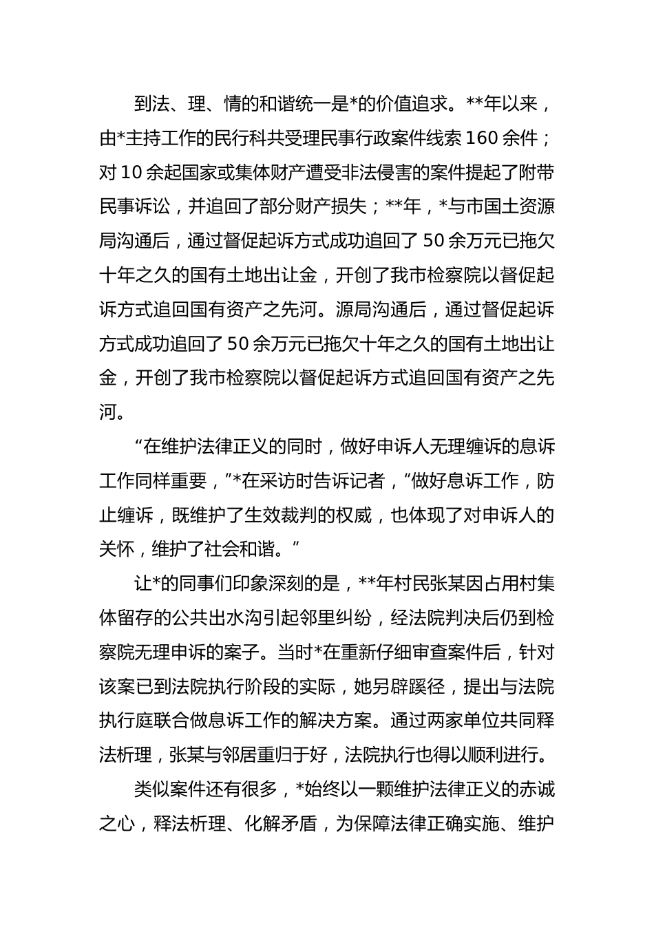 检察院检察官事迹材料作为一名光荣的女检察官,*从**年参加工作那天起,就决心把自己的命运同胸前的检徽紧紧相连。“干一行,爱一行,精一行”是*的人生追求,也是她工作状态的真实写照。公诉领域里显示一流水准。*在公诉科从复印、打印法律文书等简单工作开始,秉着对法律的无比忠诚以及对刑事检察的满腔热忱,她在公诉业务领域执着前行,并逐渐成长为一名具有一流办案水准的公诉人员。在办理一批侵犯知识产权案件的过程中,*的细心、专业和负责获得了广泛的赞誉。**年,我市部分火花塞制造企业未经注册商标所有人许可,在自己生产的火花塞上使用外国着名火花塞商标,引起了国外商标权利人的投诉,并通过国家商务部表示强烈不满。当这些案件移送起诉到慈溪市人民检察院后,*高度重视,立即着手办理案件。同时*还想方设法,通过各种可能的途径查到相关地址,并运用自己的外语专长,把《委托诉讼代理人告知书》翻译成英文,以特快邮递方式送达受害人。该案件最终顺利得到公正的审理,侵权人均受到了法律严厉制裁。几天后一个美国人走进了慈溪市人民检察院,对*这位正义感强、办案水准专的公诉检察官竖起了大拇指。坚持维护法律正义,又对申诉人充满关爱之心,努力达到法、理、情的和谐统一是*的价值追求。**年以来,由*主持工作的民行科共受理民事行政案件线索160余件;对10余起国家或集体财产遭受非法侵害的案件提起了附带民事诉讼,并追回了部分财产损失;**年,*与市国土资源局沟通后,通过督促起诉方式成功追回了50余万元已拖欠十年之久的国有土地出让金,开创了我市检察院以督促起诉方式追回国有资产之先河。源局沟通后,通过督促起诉方式成功追回了50余万元已拖欠十年之久的国有土地出让金,开创了我市检察院以督促起诉方式追回国有资产之先河。“在维护法律正义的同时,做好申诉人无理缠诉的息诉工作同样重要,”*在采访时告诉记者,“做好息诉工作,防止缠诉,既维护了生效裁判的权威,也体现了对申诉人的关怀,维护了社会和谐。”让*的同事们印象深刻的是,**年村民张某因占用村集体留存的公共出水沟引起邻里纠纷,经法院判决后仍到检察院无理申诉的案子。当时*在重新仔细审查案件后,针对该案已到法院执行阶段的实际,她另辟蹊径,提出与法院执行庭联合做息诉工作的解决方案。通过两家单位共同释法析理,张某与邻居重归于好,法院执行也得以顺利进行。类似案件还有很多,*始终以一颗维护法律正义的赤诚之心,释法析理、化解矛盾,为保障法律正确实施、维护社会和谐稳定做着积极的努力。办案是能手,学习当尖兵,以“拼命三郎”式的精神不断学习。*告诉记者,要成为一名优秀的政法干警,除了学习法律知识,还必须知社情、察民意、讲政治、懂政策。*这么说,也是这么做的。她在如饥似渴地学习新颁布实施的民事、行政法律法规的同时,也广泛涉猎行政管理、经济金融等领域,全面提高综合业务能力。在办案中,她也践行着学习工作化、工作学习化的理念,紧紧抓住所有可能提高自己的机会。仅**年,她就结合办案过程中遇到的问题深入钻研,撰写调研文章11篇,其中5篇发表于国家级刊物上,被评为该院年度学习型检察官。去年,*又获得了“省民行十佳办案人”的荣誉称号。