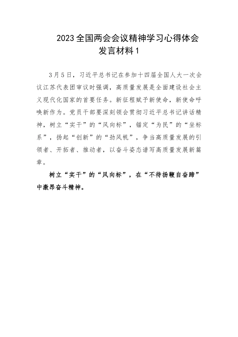 2023全国两会会议精神学习心得体会发言材料13月5日,习近平总书记在参加十四届全国人大一次会议江苏代表团审议时强调,高质量发展是全面建设社会主义现代化国家的首要任务。新征程赋予新使命,新使命呼唤新作为。党员干部要深刻领会贯彻习近平总书记讲话精神,树立“实干”的“风向标”,锚定“为民”的“坐标系”,扬起“创新”的“劲风帆”,争当高质量发展的引领者、开拓者、推动者,以奋斗姿态谱写髙质量发展新篇章。树立“实干”的“风向标”,在“不待扬鞭自奋蹄”中激昂奋斗精神。高质量发展是“方方面面的总要求”,在通往新征程的道路上,没有捷径,唯有实干。2022年我国国内生产总值增长3%,城镇新增就业1206万人,年末城镇调查失业率降到5.5%、居民消费价格上涨2%,货物进出口总额增长7.7%,财政赤字率控制在2.8%……一串串数据和一个个成绩的背后,无不彰显着敢于斗争、勇于胜利的强劲动力。大道至简,实干为要。广大党员干部在倍感振奋的同志,要持续树立“实干”的“风向标”,发挥“不待扬鞭自奋蹄”的奋斗精神,加强对经济高质量发展理论的学习研究,不断完善和加快经济学理论知识更新,强化经济思维和实践能力,打开前瞻视野,努力成为政策水平高、专业能力强实践经验多、善抓经济工作的行家里手,为燃旺高质量发展的“炉火”提供高效能“燃料”。锚定“为民”的“坐标系”,在“万般辛苦不觉累”中践行奋斗初心。人民幸福安康是推动高质量发展的最终目的。人民群众对高品质生活的期待,既体现为收入的日益增长,也体现为安全感、幸福感的普遍提升,以及不断升级的个性化、多样化需来的切实满足。坚持以人民为中心的发展思想,、坚定不移走高质量发展之路,为解决当前我国社会主要矛盾指明方向。天地之大,黎元为本。广大党员干部要锚定“为民”的“坐标系”,以“百姓之心为心”,在干事创业时始终把“屁股端端地坐在老百姓的一边”,身体力行地投入到经济发展、乡村振兴、基层治理等重点难点任务一线,以“万般辛苦不觉累”的奋斗情怀,解决好人民群众的急难愁盼,架起同人民群众之间的“连心桥”,带动人民群众在党的旗帜下团结成“一块坚硬的钢铁”,共同推动中国发展航船劈波斩浪、行稳致远。扬起“进取”的“劲风帆”,在“中流击水正在时”中奏响奋斗乐章。高质量发展之路绝不可能是一片坦途,还有许多“狂风骤雨”“冰天雪地”的严峻关口要过,还有许多“暗流涌动”“风暴频繁”的未知海域要闯,唯有迎难而上、爬坡过坎,才能闯出新天地、开创新局面。百尺竿头更进一步,中流击水正当其时。广大党员干部要扬起“进取”的“劲风帆”,坚持问题导向、目标导向、结果导向,不断锤炼过硬能力本领和意志品质,补齐短板弱项、解决自身实际问题,以“等不起”的紧迫感、“慢不得”的危机感“坐不住”的责任感,争做无所畏惧、勇毅向前的弄潮儿并主动到恢复和扩大消费的重要任务中淬炼、在促外贸进出口稳定增长的艰难岗位上历练,勇于突破发展进取的“阈值”,在苦干实干中比学赶超,跑出发展“加速度”以冲刺姿态书写出奋斗“新华章”2023全国两会会议精神学习心得体会发言材料2今年的全国两会已于3月5日、3月4日分别在京隆重开幕。两会既是中国的重要政治活动,又是民主政治建设的重要组成部分,也是反映中国政治、经济、社会状况的窗口之一。全体党员、干部要认真收听收看两会,结合自身工作,深入学习贯彻落实全国两会的重要会议精神,以“奋进之姿”共赴这场“春天的盛会”,为全面建设社会主义现代化国家、全面推进中华民族伟大复兴贡献自己的智慧和力量。躬身为民是“美姿”,用心唱好枝叶总关情的“进行曲”,让人民的生活更有品质。利民之事,丝发必兴;厉民之事,毫末必去。人民是历史的创造者,是真正的英雄。我们党自成立之日起就把“为中国人民谋幸福,为中华民族谋复兴”作为自己的初心使命,并矢志不渝为了这一崇高理想而拼搏奋斗。特别是党的十八大以来,以习近平同志为核心的党中央团结带领全国各族人民脱贫困、奔小康、抗大灾、应变局、战疫情、谋振兴,最终的目标都是为了实现人民对美好生活的向往。每年的全国两会之所以都会受到各界广泛关注,...