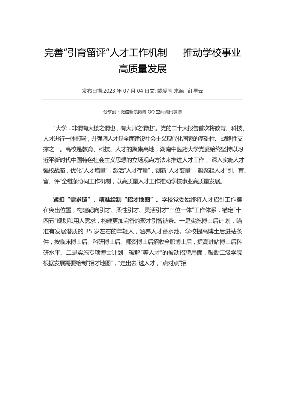 完善“引育留评”人才工作机制推动学校事业高质量发展发布日期:2023年07月04日文:戴爱国来源:红星云分享到:微信新浪微博QQ空间腾讯微博“大学,非谓有大楼之谓也,有大师之谓也”。党的二十大报告首次将教育、科技、人才进行一体部署,并强调人才是全面建设社会主义现代化国家的基础性、战略性支撑之一。高校是教育、科技、人才的聚集高地,湖南中医药大学党委始终坚持以习近平新时代中国特色社会主义思想的立场观点方法来推进人才工作,深入实施人才强校战略,优化“人才增量”,激活“人才存量”,创新“人才变量”,凝聚起人才“引、育、留、评”全链条协同工作机制,以高质量人才工作推动学校事业高质量发展。紧扣“需求链”,精准绘制“招才地图”。学校党委始终将人才招引工作摆在突出位置,构建靶向引才、柔性引才、灵活引才“三位一体”工作体系,锚定“十四五”规划和用人需求,构建更加完备的聚才引智链条。一是实施博士后计划,瞄准有发展潜质的35岁左右的年轻人,涵养人才蓄水池。学校提高博士后进站条件,按临床博士后、科研博士后、师资博士后招收全职博士后,提高进站博士后科研水平。二是实施专项博士计划,破解“等人才”的被动招聘局面,鼓励二级学院根据发展需要绘制“招才地图”,“走出去”选人才,“点对点”招人才,“家门口”留人才,通过调动或招聘形式引进高层次人才。三是灵活运用柔性引进、同工同酬、项目聘用等多种形式,构建固定编制、流动编制、非事业编制聘用相结合的用人机制,探索PI聘任制和兼职教师长期聘用制度。激活“创新链”,系统拓宽“育才路径”。人才工作的基础在培养,难点也在培养。学校党委始终坚持“引育并举”,把人才培育深度融入创新链,推动各类人才走出“舒适区”、勇闯“无人区”,走出“象牙塔”、走向“竞技场”,让人才在一线“赛马”。一是在人才管理上做“减法”,激发活力动力。推进人才管理重心下移,实行校院二级目标管理、绩效发放和职称评审制度改革,推动形成“以学校为主导、以学院为主体”的校院两级人才体系和“院办大学”改革模式。倡导团队建设,选好配强学术带头人,吸引高端人才及团队“揭榜挂帅”。二是在激励服务上做“加法”,强力推出“三亿”人才发展战略。全面实施“院士培育计划、拔尖人才引培计划、临床高层次人才引培计划”,三个计划各设立一亿专项资金,高规格引培高层次学科人才。实施“杏林英才”支持计划,构建“杏林杰出、杏林领军、杏林拔尖、杏林骨干、杏林青苗”为主体的塔型人才培养梯队,培养造就国际顶尖水平的战略科学家和科技领军人才,打造具备国际视野、引领中医药科技创新变革的专家队伍。优化“服务链”,用心织密“留才网格”。环境好,则人才聚、事业兴。学校党委始终聚焦人才所思所忧所盼,着力强服务、暖人心、优环境,打造真心、精心、用心、悉心的全方位服务体系。一是用事业留人,拓宽人才职业发展通道,从人才培养、科学研究、社会服务的需要出发,兼顾各类人员的结构现状,合理确定岗位总量,优化岗位结构比例。积极搭建科研平台,推动组建科研团队,充分发挥人才“传帮带”作用。二是用待遇留人,大幅提高高层次人才津补贴、科研启动费和安家费。建立完善的人才激励机制,加大高水平成果的奖励力度。优化绩效工资分配制度改革,做到“低职不一定低薪、高职不一定高薪”。三是用情感留人,在政策允许的范围内着力破解高层次人才的配偶就业,子女教育等问题,畅通人才购房绿色通道,让各类人才安神定志、无后顾之忧。完善“制度链”,科学写好“评才文章”。人才评价是人才队伍建设的指挥棒。学校党委始终坚持党管人才原则,将改革完善人才评价机制作为人才工作的重要内容,充分发挥人才评价的正向引领和激励作用。一是加强顶层设计。加强党对人才工作的领导,党委会、书记碰头会定期研究人才工作,通过健全制度、创新机制、提升环境、改善服务,搭建人才评价改革的“四梁八柱”。二是健全分类评价体系。分为“教学型、科研型、教学科研型”岗位,分类设置评价指标,创造让“金课”型教师脱颖而出的制度体系。鼓励科研型教师聚焦国家重大需求和学科发展需要,做真学问...