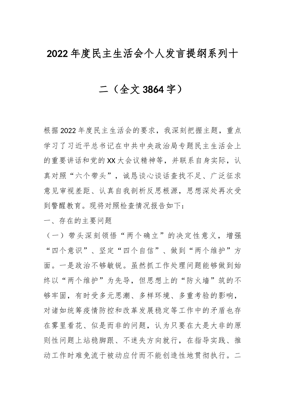 2022年度民主生活会个人发言提纲系列十二(全文3864字)根据2022年度民主生活会的要求,我深刻把握主题,重点学习了习近平总书记在中共中央政治局专题民主生活会上的重要讲话和党的XX大会议精神等,并联系自身实际,认真对照“六个带头”,诚恳谈心谈话查找不足、广泛征求意见审视差距、认真自我剖析反思根源,思想深处再次受到警醒教育。现将对照检查情况报告如下:一、存在的主要问题(一)带头深刻领悟“两个确立”的决定性意义,增强“四个意识”、坚定“四个自信”、做到“两个维护”方面。一是政治不够敏锐。虽然抓工作处理问题能够做到始终以“两个维护”为先导,但思想上的“防火墙”筑的不够牢固,有时受多元思潮、多样环境、多重考验的影响,对诸如统筹疫情防控和改革发展稳定等工作中的矛盾也存在雾里看花、似是而非的问题,认为只要在大是大非的原则性问题上站稳脚跟、不迷失方向就行,在指导实践、推动工作时难免流于被动应付而不能创造性地贯彻执行。二是视野不够开阔。虽然能够站在全局高度思考问题,但在吃透上级精神、准确把握中央及省市工作的重心和节奏上思考深度、工作站位、决心力度还有差距,缺乏更近一步更深一层的思考发掘。比如,对如何推动XX经济高质量发展、美丽乡村建设、社会治理升级等工作思路还缺乏更有实效、更高站位的思考和摆布三是思考不够深入。对“政治三力”的现实意义及内在联系认识还有差距,没有完全转化成为推进工作的思想动力和高效方法,特别是对事关长远的战略规划重视不够、谋划不深。比如,有时对一些比较急的项目,仓促启动,导致后续工作困难重重、推进不快。有时担心发展减速、位次下滑,在定思路、作决策、上项目时,没有完全把生态竹乡、康养XX的发展导向落到实处。(二)带头用习近平新时代中国特色社会主义思想凝心铸魂方面。一是全面学习不够系统。能够按照上级部署要求带头用习近平新时代中国特色社会主义思想武装头脑、指导实践、推动工作,但根据个人兴趣和工作需要针对性学习多,在系统把握、扩展延伸上下功夫不够,导致运用政治大局统揽农村工作的能力还需要进一步提高。二是融会贯通不够深入在深钻细研、内化于心、外化于行上用心用力不够,学习中满足于掌握基本观点、基本内容多,联系实际、结合工作深层次思考少,没能做到融会贯通、举一反三,特别是站在政治和全局的高度思考问题、筹划工作不够细致,对用什么方法去实践、靠什么工作去落实、以什么标准去规范还缺乏思考和行动。三是实践运用不够灵活。在知行合一、转化运用方面还存在欠缺,没有真正将学习所得转化为工作思路和方法,尤其是对加快XX农特、旅游产业发展壮大,推动市场化、规模化、产业化提质增效思考研究还不深不透、发力不准。(三)带头坚持和加强党的全面领导方面。一是坚持和加强党的全面领导还不彻底。日常工作中抓行政性事务多,对党的政治建设关注不够、过问不多,突出党的统筹领导作用不够,抓基层党建与业务工作结合上方法不多、形式不活。比如,在疫情防控、文明创建、人居环境整治、社会治理等方面注重发挥基层党组织总揽全局、协调各方的作用不够充分,配合不够紧密。二是带头坚持组织生活还需强化。受具体工作事务影响,有时落实组织生活制度还有折扣,偶尔也存在重经济、轻党建的倾向,对上级要求任务指标关注比较多,对党性修养、组织建设等方面关注比较少,与班子成员相互间交心谈心的时间较少,开展批评与自我批评顾虑还比较多,有些该提醒的不提醒,该批评的不批评,辣味不足。(四)带头坚持以人民为中心的发展思想,推动改革发展稳定方面。一是宗旨服务意识有待增强。能够树立正确的政绩观,主动践行群众路线,但以人民为中心的发展思想树的不够牢,走村入户听取群众意见、困难的频次不够,一定程度上导致了群众对自然村整治、四宜村镇建设、重要工程项目落地等方面不够了解。二是为民解决难题有待提升。真正沉下身子体察民情、解决民生短板不够,倾听群众和企业心声、解决实际困难的方式方法较为传统,针对性不强、创新性不足。如,对群众密切关注的征地拆迁、民生保障等重点领域政策解读、矛盾处理不够精准细致。三是改革发...