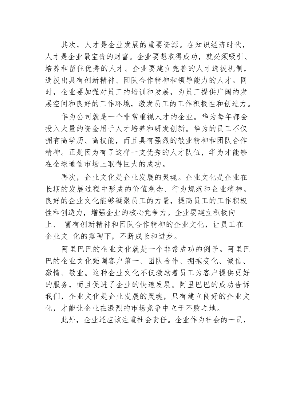 在企业家论坛上的发言尊敬的各位企业家朋友们:大家好!非常荣幸能够在这个企业家论坛上与大家相聚,共同探讨企业发展的机遇与挑战。今天,我想和大家分享一些我在企业经营管理中的感悟和思考。在当今这个快速发展的时代,企业面临着前所未有的机遇和挑战。科技的飞速进步、市场的不断变化、消费者需求的日益多样化,都对企业提出了更高的要求。在这样的环境下,企业要想取得成功,就必须不断创新、不断进取。首先,创新是企业发展的核心动力。在这个竞争激烈的市场中,只有不断推出具有创新性的产品和服务,才能满足消费者日益变化的需求,赢得市场份额。创新不仅仅是技术创新,还包括管理创新、营销创新等各个方面。企业要鼓励员工勇于创新,建立创新激励机制,营造良好的创新氛围。同时,企业要加强与高校、科研机构的合作,引进先进的技术和人才,提高自身的创新能力。以苹果公司为例,它之所以能够成为全球最具价值的企业之一,就是因为它不断推出具有创新性的产品。从iPhone到iPad,从Mac到AppleWatch,每一款产品都引领了行业的发展潮流,改变了人们的生活方式。苹果公司的成功告诉我们,创新是企业发展的关键,只有不断创新,才能在市场中立于不败之地。其次,人才是企业发展的重要资源。在知识经济时代,人才是企业最宝贵的财富。企业要想取得成功,就必须吸引、培养和留住优秀的人才。企业要建立完善的人才选拔机制,选拔出具有创新精神、团队合作精神和领导能力的人才。同时,企业要加强对员工的培训和发展,为员工提供广阔的发展空间和良好的工作环境,激发员工的工作积极性和创造力。华为公司就是一个非常重视人才的企业。华为每年都会投入大量的资金用于人才培养和研发创新。华为的员工不仅拥有高学历、高技能,而且具有强烈的敬业精神和团队合作精神。正是因为有了这样一支优秀的人才队伍,华为才能够在全球通信市场上取得巨大的成功。再次,企业文化是企业发展的灵魂。企业文化是企业在长期的发展过程中形成的价值观念、行为规范和企业精神。良好的企业文化能够凝聚员工的力量,提高员工的工作积极性和创造力,增强企业的核心竞争力。企业要建立积极向上、富有创新精神和团队合作精神的企业文化,让员工在企业文化的熏陶下,不断成长和进步。阿里巴巴的企业文化就是一个非常成功的例子。阿里巴巴的企业文化强调客户第一、团队合作、拥抱变化、诚信、激情、敬业。这种企业文化不仅激励着员工为客户提供更好的服务,而且促进了企业的快速发展。阿里巴巴的成功告诉我们,企业文化是企业发展的灵魂,只有建立良好的企业文化,才能让企业在激烈的市场竞争中立于不败之地。此外,企业还应该注重社会责任。企业作为社会的一员,不仅要追求经济效益,还要承担起社会责任。企业要积极参与公益事业,关注环境保护、教育、扶贫等社会问题,为社会的发展做出贡献。同时,企业要加强自身的管理,遵守法律法规,诚实守信经营,树立良好的企业形象。腾讯公司就是一个非常注重社会责任的企业。腾讯在发展自身业务的同时,积极参与公益事业,推出了腾讯公益平台,为广大网友提供了一个便捷的公益捐赠渠道。腾讯还通过技术创新,为教育、医疗、环保等领域提供了一系列的解决方案,为社会的发展做出了积极贡献。腾讯的成功告诉我们,企业只有注重社会责任,才能赢得社会的尊重和认可,实现可持续发展。最后,我想强调的是,企业发展是一个长期的过程,需要我们不断地学习、不断地创新、不断地进取。在这个过程中,我们会遇到各种各样的困难和挑战,但只要我们坚定信心、勇于拼搏,就一定能够克服困难,实现企业的发展目标。各位企业家朋友们,让我们携手共进,共同开创企业发展的美好未来!让我们以创新为动力,以人才为支撑,以企业文化为灵魂,以社会责任为己任,为推动经济的发展和社会的进步做出更大的贡献!