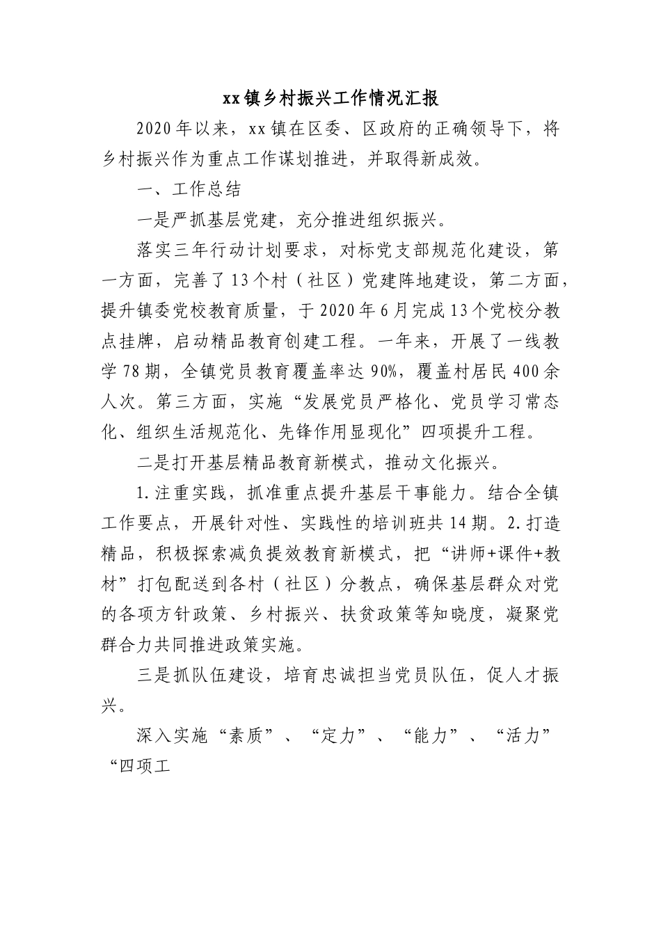 xx镇乡村振兴工作情况汇报2020年以来,xx镇在区委、区政府的正确领导下,将乡村振兴作为重点工作谋划推进,并取得新成效。一、工作总结一是严抓基层党建,充分推进组织振兴。落实三年行动计划要求,对标党支部规范化建设,第一方面,完善了13个村(社区)党建阵地建设,第二方面,提升镇委党校教育质量,于2020年6月完成13个党校分教点挂牌,启动精品教育创建工程。一年来,开展了一线教学78期,全镇党员教育覆盖率达90%,覆盖村居民400余人次。第三方面,实施“发展党员严格化、党员学习常态化、组织生活规范化、先锋作用显现化”四项提升工程。二是打开基层精品教育新模式,推动文化振兴。1.注重实践,抓准重点提升基层干事能力。结合全镇工作要点,开展针对性、实践性的培训班共14期。2.打造精品,积极探索减负提效教育新模式,把“讲师+课件+教材”打包配送到各村(社区)分教点,确保基层群众对党的各项方针政策、乡村振兴、扶贫政策等知晓度,凝聚党群合力共同推进政策实施。三是抓队伍建设,培育忠诚担当党员队伍,促人才振兴。深入实施“素质”、“定力”、“能力”、“活力”“四项工程”,持续强化党员干部在急难险重工作中的攻坚克难的能力。如我镇圆满完成村(社区)党组织换届选举工作,产生新一届村(社区)党组织班子成员61名,平均年龄40岁,较上届下降了4岁,大专及以上学历45名,较上届多28名,有效实现了学历及结构双优化。村(居)委换届顺利推进,计划于1月24日-25日开展选举,预计可实现预期目标。四是统筹推进农业产业发展,激发农业农村经济发展新动能。引进“金新农”生猪养殖、盛大农业、东升农场等项目,加快优化农业产业结构,打造强农富民的特色产业。做好“特”字产业文章,打响xx农业品牌。我镇流坑村马坝油粘米、北约村优质肉牛成功入选为广东省2021年“一村一品、一镇一业”项目;我镇优质水稻成功被评为2020年广东省“一村一品、一镇一业”专业镇(水稻)。五是推进新农村建设和镇街提升整治,强化生态振兴。1.补齐农村基础设施短板,推进新农村建设。我镇,目前全域推进干净整洁村建设,共涉及79个村小组建设项目,目前启动的有77个,完成的有75个,完成率为95%。该项目完成后,我镇148个村小组将全面达到干净整洁村标准。5个省定贫困村65个村小组通过围竹篱笆等方式建设人畜分离区,全面实现家禽圈养。2.“139”镇街提升项目有效推进,填补了多年来经济社会发展的突出问题短板,实施过程得到了广大群众和商铺经营者的鼎力协助和大力支持,仅用了4个月就完成总体进度的90%,再次彰显了“xx速度和xx效率”,该项目完成后,将大大改善群众的生产生活环境,提升我镇的整体形象和城镇品位。二、存在问题基层组织建设还需进一步加强;产业发展结构仍不够合理;人居环境虽有改善,但与美丽宜居乡村仍有一段距离。三、下一步工作计划一是围绕基层组织建设,高质量完善三个全面升级。结合镇委党校、风度书屋、党员活动室等优质学习平台,精心设计开展各类学习活动,实现党建教育阵地全面升级打造支部党建示范带,辐射带动基层组织建设水平全面升级。强化头雁队伍、党员干部队伍专业化培养,实现党建促进经济建设能力全面升级。二是加大农业招商项目开发,加速xx农业产业转型升级。继续协调、引进上市的正邦、新五丰、温氏等大型上市公司,在我镇选址建设现代生猪养殖场。三是继续加大城镇整治力度。特别在整治“六乱”上下狠功、出实招,严格落实长效管理机制、精细化服务,巩固“纵向到底、横向到边、责任明确、处置及时”的动态监管机制,不断提升城镇管理水平,并打造出具有xx地方特色的宜居宜业宜游最美生态小镇。四是稳步推进乡村振兴,打造一批特色精品村庄。在S521xx段沿线村庄实施“寻回消失的村落-溯源马坝人”白楼村美丽乡村示范片环境提升工程及“樟林流翠、故里果香”美丽乡村示范片提升工程。继续打造芦溪-南约路段沿线风貌整治建设,形成住房风貌整治示范带。