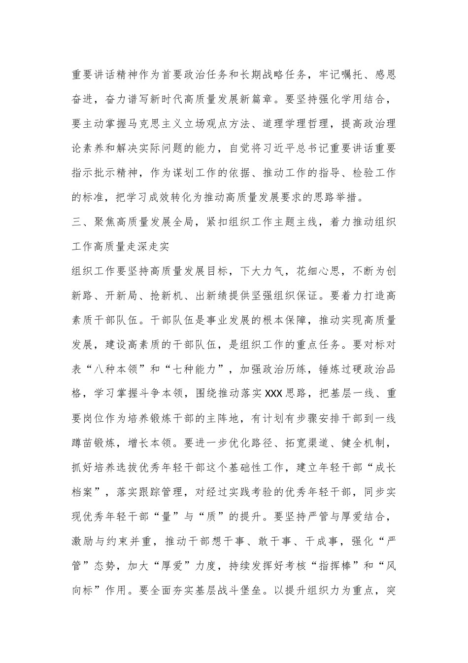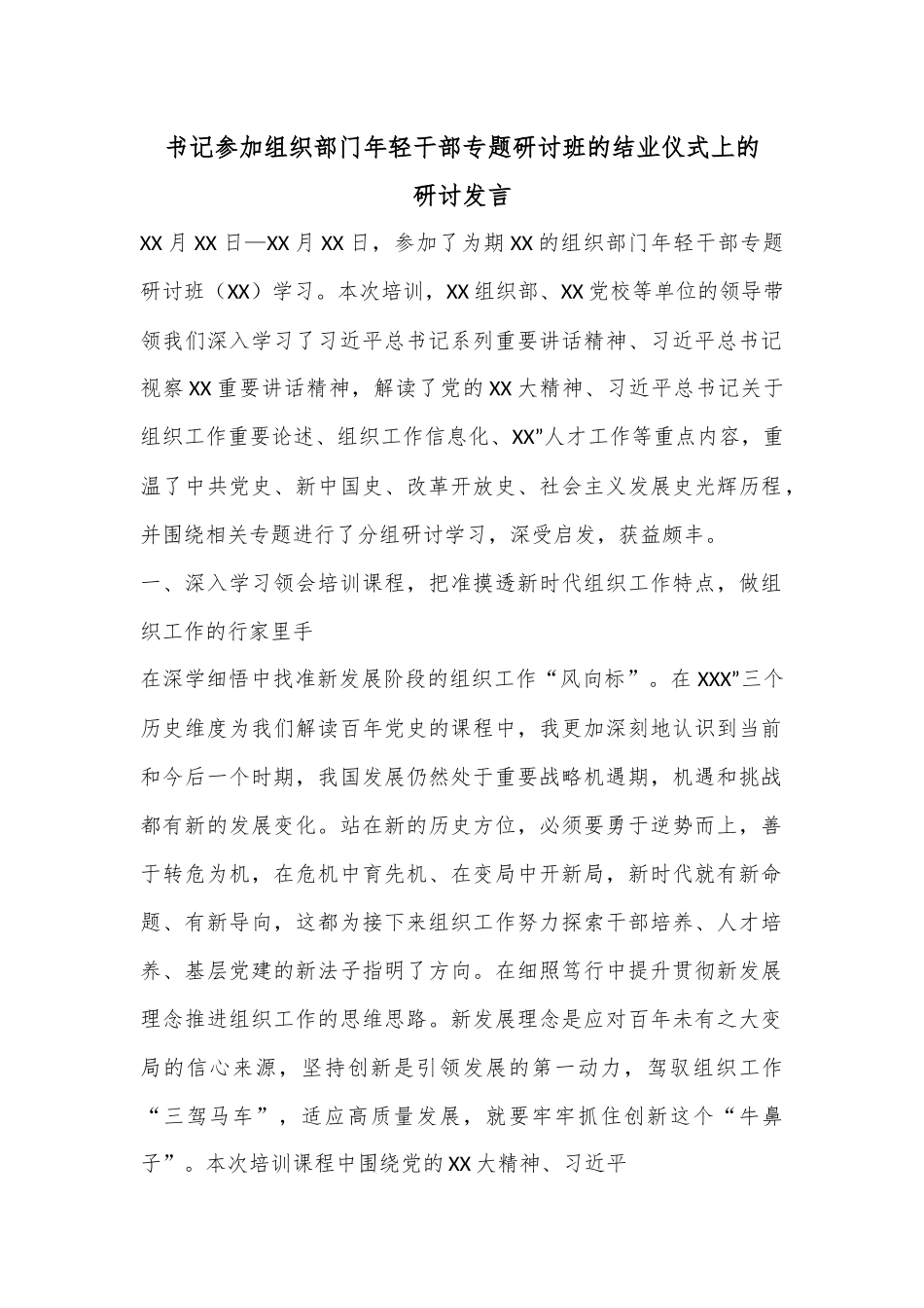 书记参加组织部门年轻干部专题研讨班的结业仪式上的研讨发言XX月XX日—XX月XX日,参加了为期XX的组织部门年轻干部专题研讨班(XX)学习。本次培训,XX组织部、XX党校等单位的领导带领我们深入学习了习近平总书记系列重要讲话精神、习近平总书记视察XX重要讲话精神,解读了党的XX大精神、习近平总书记关于组织工作重要论述、组织工作信息化、XX”人才工作等重点内容,重温了中共党史、新中国史、改革开放史、社会主义发展史光辉历程,并围绕相关专题进行了分组研讨学习,深受启发,获益颇丰。一、深入学习领会培训课程,把准摸透新时代组织工作特点,做组织工作的行家里手在深学细悟中找准新发展阶段的组织工作“风向标”。在XXX”三个历史维度为我们解读百年党史的课程中,我更加深刻地认识到当前和今后一个时期,我国发展仍然处于重要战略机遇期,机遇和挑战都有新的发展变化。站在新的历史方位,必须要勇于逆势而上,善于转危为机,在危机中育先机、在变局中开新局,新时代就有新命题、有新导向,这都为接下来组织工作努力探索干部培养、人才培养、基层党建的新法子指明了方向。在细照笃行中提升贯彻新发展理念推进组织工作的思维思路。新发展理念是应对百年未有之大变局的信心来源,坚持创新是引领发展的第一动力,驾驭组织工作“三驾马车”,适应高质量发展,就要牢牢抓住创新这个“牛鼻子”。本次培训课程中围绕党的XX大精神、习近平总书记在中央党校中青班开班仪式上的讲话、年轻干部“七种能力”、省委XX全会等主题设置了多次分组研讨交流,来自全XX各战线的近XXX名组工干部,集思广益、碰撞思维,创新提出了各自组织工作“战法”,就是要敢于打破固化思维,敢于闯新路,把五大新发展理念贯穿全过程各方面,切实增强组织工作高质量发展的能力需求。在弄通做实中主动担起推动组织工作高质量发展的时代使命。培训过程中,无论是XXX为我们深入讲解“XX”XX人才工作的规划,还是XXX为我们展示信息化组织工作取得的丰富成效,都是紧扣“围绕中心、服务大局”推动高质量发展的主题主线,这些课程都无疑使我们更加清晰认识到要从当前发展的阶段性特征出发、从组织工作的时代性特点出发,更加深刻把握高质量发展对组织工作提出的新要求,在选准用好干部上、在夯实基层基础上、在人才队伍建设上对标高质量,探索以高质量服务推动高质量发展、以高质量发展锻造高素质干部人才队伍的新实践。二、坚持把政治建设摆在首位,强化提升“两个维护”的坚定自觉,做政治上的明白人组工干部必须要强化政治意识,不断增强政治判断力、政治领悟力、政治执行力,必须把习近平总书记重要讲话精神作为一切工作的根本遵循,坚决做到“两个维护”。要坚持强化理论武装,始终把政治建设放在首位,深刻领悟“两个确立”的决定性意义,把学习宣传贯彻党的XX大精神和习近平总书记视察XX重要讲话精神作为首要政治任务和长期战略任务,牢记嘱托、感恩奋进,奋力谱写新时代高质量发展新篇章。要坚持强化学用结合,要主动掌握马克思主义立场观点方法、道理学理哲理,提高政治理论素养和解决实际问题的能力,自觉将习近平总书记重要讲话重要指示批示精神,作为谋划工作的依据、推动工作的指导、检验工作的标准,把学习成效转化为推动高质量发展要求的思路举措。三、聚焦高质量发展全局,紧扣组织工作主题主线,着力推动组织工作高质量走深走实组织工作要坚持高质量发展目标,下大力气,花细心思,不断为创新路、开新局、抢新机、出新绩提供坚强组织保证。要着力打造高素质干部队伍。干部队伍是事业发展的根本保障,推动实现高质量发展,建设高素质的干部队伍,是组织工作的重点任务。要对标对表“八种本领”和“七种能力”,加强政治历练,锤炼过硬政治品格,学习掌握斗争本领,围绕推动落实XXX思路,把基层一线、重要岗位作为培养锻炼干部的主阵地,有计划有步骤安排干部到一线蹲苗锻炼,增长本领。要进一步优化路径、拓宽渠道、健全机制,抓好培养选拔优秀年轻干部这个基础性工作,建立年轻干部“成长档案”,落实跟踪管理,对经过实践考验的优秀年轻干部,同步实现优秀年轻干部“量”与“质”的提升。要坚持...