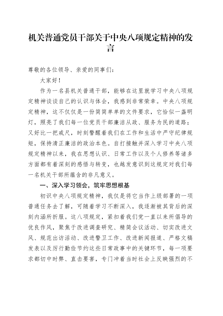 机关普通党员干部关于中央八项规定精神的发言尊敬的各位领导、亲爱的同事们:大家好!作为一名县机关普通干部,能够在这里就学习中央八项规定精神谈谈自己的认识与体会,我感到非常荣幸。中央八项规定精神,这不仅仅是一份简简单单的文件要求,它恰似一盏明灯,照亮了我们每一位党员干部廉洁从政、服务为民的道路;又好比一把戒尺,时刻警醒着我们在工作和生活中严守纪律规矩,保持清正廉洁的政治本色。自打接触并深入学习中央八项规定精神以来,我在思想认识、日常工作以及个人修养等诸多方面都有着深刻的感悟与转变,也越发意识到这规定对我们每一名机关干部所蕴含的非凡意义。一、深入学习领会,筑牢思想根基初识中央八项规定精神,我仅是将它当作上级部署的一项普通任务去了解,可随着学习不断深入,我逐渐被其背后的深刻内涵所折服。这八项规定,紧扣着我们党一直以来所倡导的优良作风,聚焦于改进调查研究、精简会议活动、切实改进文风、规范出访活动、改进警卫工作、改进新闻报道、严格文稿发表以及厉行勤俭节约这些日常政事中的关键环节,每一项要求都切中时弊、直击要害,专门冲着当时社会上反映强烈的不良作风问题而去,宛如一把把钥匙,精准地匹配上了阻碍党群干群关系亲近、影响政府服务效能提升的“锁孔”。我开始回顾过往的一些新闻报道与身边实例,像过去有些地方出现的领导调研走过场、会议冗长拖沓、公款吃喝之风盛行等乱象,这些不仅白白耗费了大量的人力物力财力,更让政府在百姓心目中的形象大打折扣。而中央八项规定精神的出台,恰似一场力度强劲、声势浩大的“作风整肃风暴”,为整个党政机关体系立下了严明的规矩,让我们每一位普通干部都明白,再也不能像以往那样按部就班、浑浑噩噩地混日子,必须要在工作与生活细节中时刻绷紧作风建设这根弦。为了让自己吃透这些规定精神,我不单研读文件原文,还查阅了诸多相关解读资料,关注着各类媒体对规定的宣传报道。通过这一番深入探究,我打心底里认可,这绝非短暂的“运动式”治理,而是党中央着眼于党和国家长治久安、人民幸福福祉作出的战略决策,旨在重塑党风政风,从而带动社风民风向善向好,这让我在思想上彻底完成了从被动接受任务到主动拥抱规定的转变,时刻准备着在今后的日子里,用这份精神来检视自身、规范行为。二、对标日常工作,践行规定要求在县机关日常办公里,以往偶尔也会出现一些如今想来与优良作风相悖的小状况。就拿会议举例,过去有时为了彰显工作重视程度,即便议题内容重叠、参会人员大多相同,不同部门牵头的会议也照开不误,这就导致基层同事常常得在多个相似会议间来回奔波,耗费不少精力不说,实际收获却有限。再说到文件撰写与转发,有段时间“红头文件满天飞”,部分文件质量欠佳,东拼西凑、内容空洞,基层收到后不是按需落实,而是疲于应对、反复琢磨领导意图,变相增添了基层负担。可中央八项规定精神落地后,咱们县机关在这些方面有了巨大改观。会议安排上,领导们牵头梳理整合,把那些形式主义的会议果断精简,参会人员也精准定位,大家能把更多时间腾出来干实事。文件方面,强调了提质增效,撰文要求直击重点、言之有物,能用简短篇幅说清的事绝不拖泥带水,转发文件也先得考量实用性。我还记得有一次协助准备材料,按照新要求去写,起初还担心会不会不够“高大上”,结果领导审阅后大加肯定,说这就应该用朴实文风传递务实态度。涉及勤俭节约这块,变化更是显而易见。从前个别办公室偶尔存在“长明灯”“长流水”现象,新购置办公用品时,大家也习惯挑价格高、品牌响的,觉得这样才显档次。如今,单位定期组织节能宣传,大家自觉养成了随手关灯、关水龙头的习惯,采购优先选性价比高的,而且打印纸张双面打印成为标配。外出办理公务,大家拼车出行成常态,既减少了财政开支,还降低了碳排放,践行绿色办公理念。这些点滴改变,汇聚起来就是县机关积极落实中央八项规定精神的一股洪流,让我深刻认识到,只要时刻拿规定来衡量日常,就能让工作在务实高效、勤俭节约的轨道上稳步前行。三、严守纪律红线,提升自身修养日常人情往来里,过去听闻过个别干部借着逢年过节、婚丧嫁...