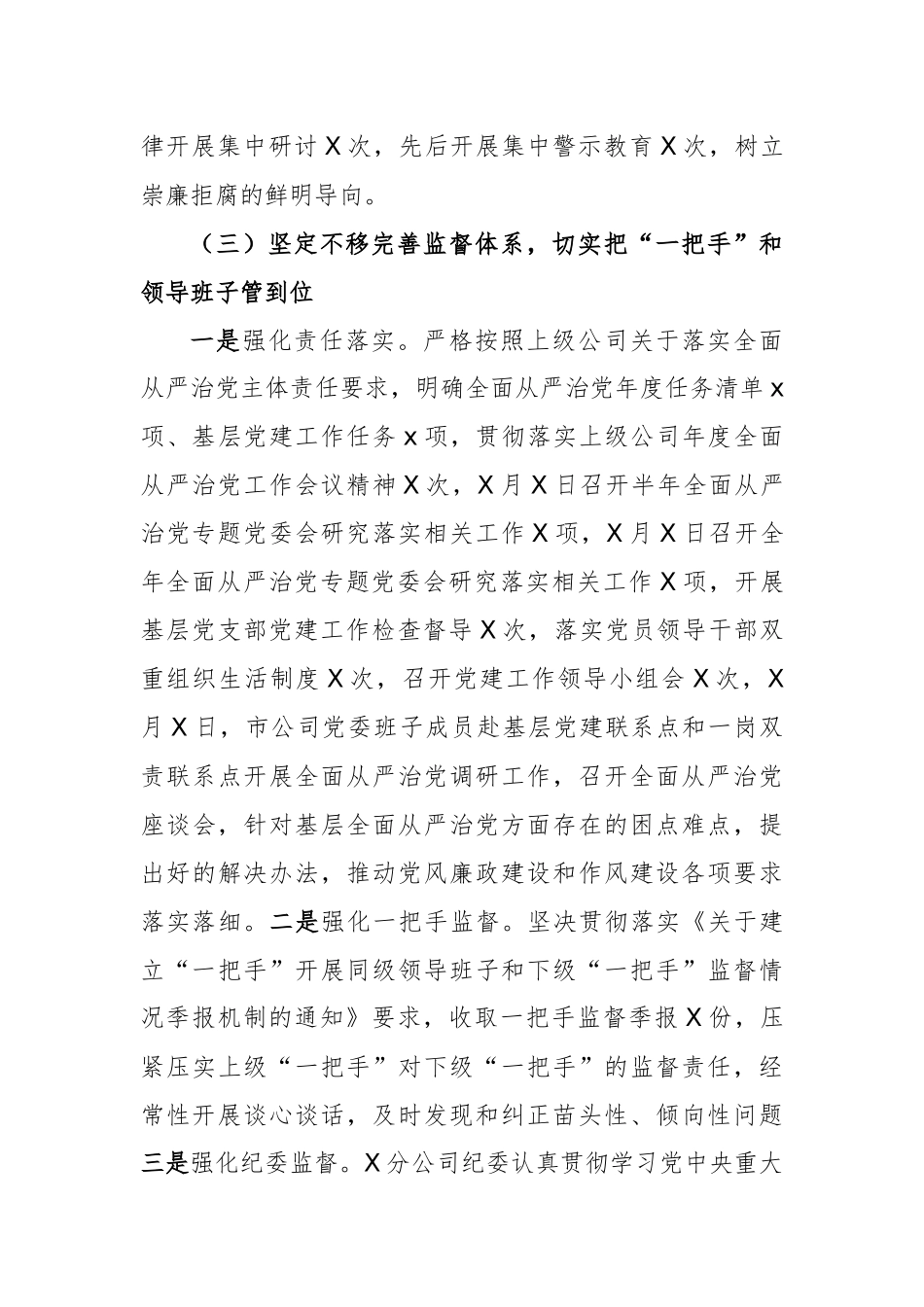 2024年度公司党委落实全面从严治党主体责任情况报告范文2024年,X分公司党委坚持以习近平新时代中国特色社会主义思想为指导,全面贯彻落实党的二十大和二十届中央纪委三次全会精神,坚决落实全面从严治党战略方针坚持金融工作的政治性、人民性,提升专业性,坚持发展第一要务,以深入开展党纪学习教育为契机,持续推动全体党员转变工作作风,全面推动公司高质量发展。现将2024年工作落实情况汇报如下:一、2024年全面从严治党工作落实情况(一)坚定不移加强党的全面领导,确保公司改革发展正确发展方向一是强化理论武装,持续巩固主题教育成果。以学习贯彻党的二十大精神、党的二十届三中全会精神、党纪学习教育、巩固主题教育成果、常态化党史学习教育为契机建立健全“第一议题”制度,全年共落实X次,健全理论学习制度、开展党委理论学习中心组学习X次,开展党的二十届三中全会学习X次,落实“三会一课”制度X余次,引导党员干部深刻领悟“两个确立”的决定性意义,增强“四个意识”,坚定“四个自信”,做到“两个维护”。二是提高政治站位,贯彻党中央决策部署。提高X覆盖面,积极对接X,沟通X需求,全年累计实现X万元。大力推广X,加大宣传X政策,提高对小微企业的X,累计为办理X项目X亿元。积极发展X业务,强化X经营模式,投入专项X费用,提高开拓成效,实现X万元。三是强化责任意识,深入推进中央巡视整改。制定整改“三项清单”,建立季度汇报机制,召开专项推进会议X次,截止2024年底,市公司制定X问题措施数65个,已完成X个,完成率X%。(二)坚定不移一体推进“三不腐”,坚决铲除腐败问题产生的土壤和条件一是深入开展警示教育。X月X日组织党员干部前往X廉政教育基地参观学习并现场接受廉政文化教育,X月X日召开全市党纪学习教育警示教育大会,组织开展合规风险教育,组织全市系统学习《X》X余人次,进一步筑牢思想防线。二是强化高压惩治。加强对业务经营各环节监督管理,办结X业务X笔,X月X日开展《X》培训,引导大家树牢底线思维意识,严格恪守职业良知和纪律规矩。三是强化思想教育,用廉洁文化滋养身心。X月组织开展清廉金融演讲比赛,教育全体党员、干部坚定信仰信念信心,提高党性修养,增强拒腐能力。以党纪学习教育为抓手,以中央金融工作会议精神为遵循,紧扣政治纪律、廉洁纪律开展集中研讨X次,先后开展集中警示教育X次,树立崇廉拒腐的鲜明导向。(三)坚定不移完善监督体系,切实把“一把手”和领导班子管到位一是强化责任落实。严格按照上级公司关于落实全面从严治党主体责任要求,明确全面从严治党年度任务清单x项、基层党建工作任务x项,贯彻落实上级公司年度全面从严治党工作会议精神X次,X月X日召开半年全面从严治党专题党委会研究落实相关工作X项,X月X日召开全年全面从严治党专题党委会研究落实相关工作X项,开展基层党支部党建工作检查督导X次,落实党员领导干部双重组织生活制度X次,召开党建工作领导小组会X次,X月X日,市公司党委班子成员赴基层党建联系点和一岗双责联系点开展全面从严治党调研工作,召开全面从严治党座谈会,针对基层全面从严治党方面存在的困点难点,提出好的解决办法,推动党风廉政建设和作风建设各项要求落实落细。二是强化一把手监督。坚决贯彻落实《关于建立“一把手”开展同级领导班子和下级“一把手”监督情况季报机制的通知》要求,收取一把手监督季报X份,压紧压实上级“一把手”对下级“一把手”的监督责任,经常性开展谈心谈话,及时发现和纠正苗头性、倾向性问题三是强化纪委监督。X分公司纪委认真贯彻学习党中央重大决策部署及上级公司有关指示精神,对公司“三重一大”“两个议事”规则、集中采购、选人用人、干部任免、近亲回避等方面进行监督,加强对市县两级“一把手”的监督,不断强化“一把手”履职担责能力和廉洁自律意识,同时建立X专员履职汇报制度,确保“三重一大”、合规宣导等落实落地。(四)坚定不移纠“四风”树新风,锲而不舍落实中央八项规定精神一是发挥巡察利剑作用。成立重点工作检查组,X月X日赴X、X对党纪学习教育、风险合规等重点工作推进情况开展“四不两直”,共发现问题X个,检...