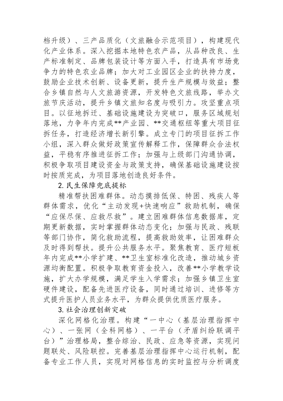 乡镇在社会工作会议上的表态发言一、政治引领,彰显担当作为1.坚定政治方向,服务发展大局坚决贯彻县委、县政府决策部署,立足乡镇实际,以“抢抓时间赶进度、集中力量攻难关”的紧迫意识,锚定“服务区域发展、保障民生福祉、维护社会稳定”三大核心任务,确保年度目标全面完成。紧密围绕上级政策导向结合本乡镇产业基础与资源禀赋,制定科学合理的发展规划,将政策红利转化为实实在在的发展动力,推动乡镇各项事业稳步前行。2.强化责任意识,凝聚奋进合力坚持“守土有责、守土尽责”的使命担当,以党建引领为抓手,压实党委主体责任,深化干部队伍作风建设,以“务学、务实、务廉”锤炼干部执行力,为高质量发展提供坚实组织保障。定期组织干部开展政治理论学习与业务培训,提升干部政治素养与专业能力;建立健全干部考核评价机制,将工作成效与干部奖惩、晋升挂钩,激发干部干事创业热情。3.加强思想建设,提升政治素养持续推进思想政治教育常态化,组织全体干部深入学习党的创新理论,通过专题讲座、交流研讨等形式,确保干部深刻领会精神实质,将先进思想转化为实际工作的行动指南。定期开展思想动态调研,及时掌握干部思想状况针对性地解决思想问题,保持干部队伍思想统一、信念坚定,以高度的政治自觉投入到乡镇社会工作中。二、聚焦重点,狠抓工作落实1.经济发展提质增效突出产业升级。立足中心城镇区位优势,推动一产特色化(如特色农业品牌培育)、二产规模化(工业园区提档升级)、三产品质化(文旅融合示范项目),构建现代化产业体系。深入挖掘本地特色农产品,从品种改良、生产标准制定、品牌包装设计等方面入手,打造具有市场竞争力的特色农业品牌;加大对工业园区企业的扶持力度,鼓励企业技术创新、设备更新,提升生产规模与效益;整合乡镇自然与人文旅游资源,开发特色文旅线路,举办文旅节庆活动,提升乡镇文旅知名度与吸引力。攻坚重点项目。以征地拆迁、基础设施建设为突破口,服务区域规划落地,力争年内完成**产业园、**交通枢纽等重大项目征拆任务,打造经济增长新引擎。成立专门的项目征拆工作小组,深入群众做好政策宣传解释工作,保障群众合法权益,平稳有序推进征拆工作;加强与上级部门沟通协调,积极争取项目建设资金与政策支持,确保基础设施建设按时按质完成,为项目落地创造良好条件。2.民生保障兜底提标精准帮扶困难群体。动态摸排低保、特困、残疾人等群体需求,优化“主动发现+快速响应”救助机制,确保“应保尽保、应救尽救”。建立困难群体信息数据库,定期更新数据,实时掌握群体动态变化;加强与民政、残联等部门协作,简化救助流程,提高救助效率,让困难群众及时得到帮扶。提升公共服务水平。聚焦教育、医疗短板年内完成**小学扩建、**卫生室标准化改造,推动城乡资源均衡配置。积极争取教育资金投入,改善**小学教学设施,扩大办学规模,满足学生入学需求;加强乡镇卫生室硬件建设,配备先进医疗设备,同时通过培训、进修等方式提升医护人员业务水平,为群众提供优质医疗服务。3.社会治理创新突破深化网格化治理。构建“一中心(基层治理指挥中心)、一张网(全科网格)、一平台(矛盾纠纷联调平台)”治理格局,整合综治、民政、应急等资源,实现问题联处、风险联控。完善基层治理指挥中心运行机制,配备专业工作人员,实现对网格信息的实时监控与分析调度明确网格员职责,加强网格员培训,提高网格员发现问题解决问题的能力;优化矛盾纠纷联调平台,建立多部门联动调解机制,提高矛盾纠纷化解效率。筑牢平安防线。落实信访包案责任制,常态化开展矛盾纠纷排查化解,确保“小事不出村、大事不出镇”,争创省级平安建设示范乡镇。建立领导干部信访包案台账,明确包案领导、责任部门与办理时限;定期组织开展矛盾纠纷大排查,对排查出的问题建立清单,逐一分析研判,制定化解方案,将矛盾纠纷化解在萌芽状态。4.党建引领强基固本锻造社工人才队伍。实施“社工人才培育计划”,年内培养持证社工**名,打造专业化、本土化服务团队。与专业社工机构合作,邀请专家开展社工知识培训与实务指导;鼓励干部职工参加社工职业资格考试,对通过考...