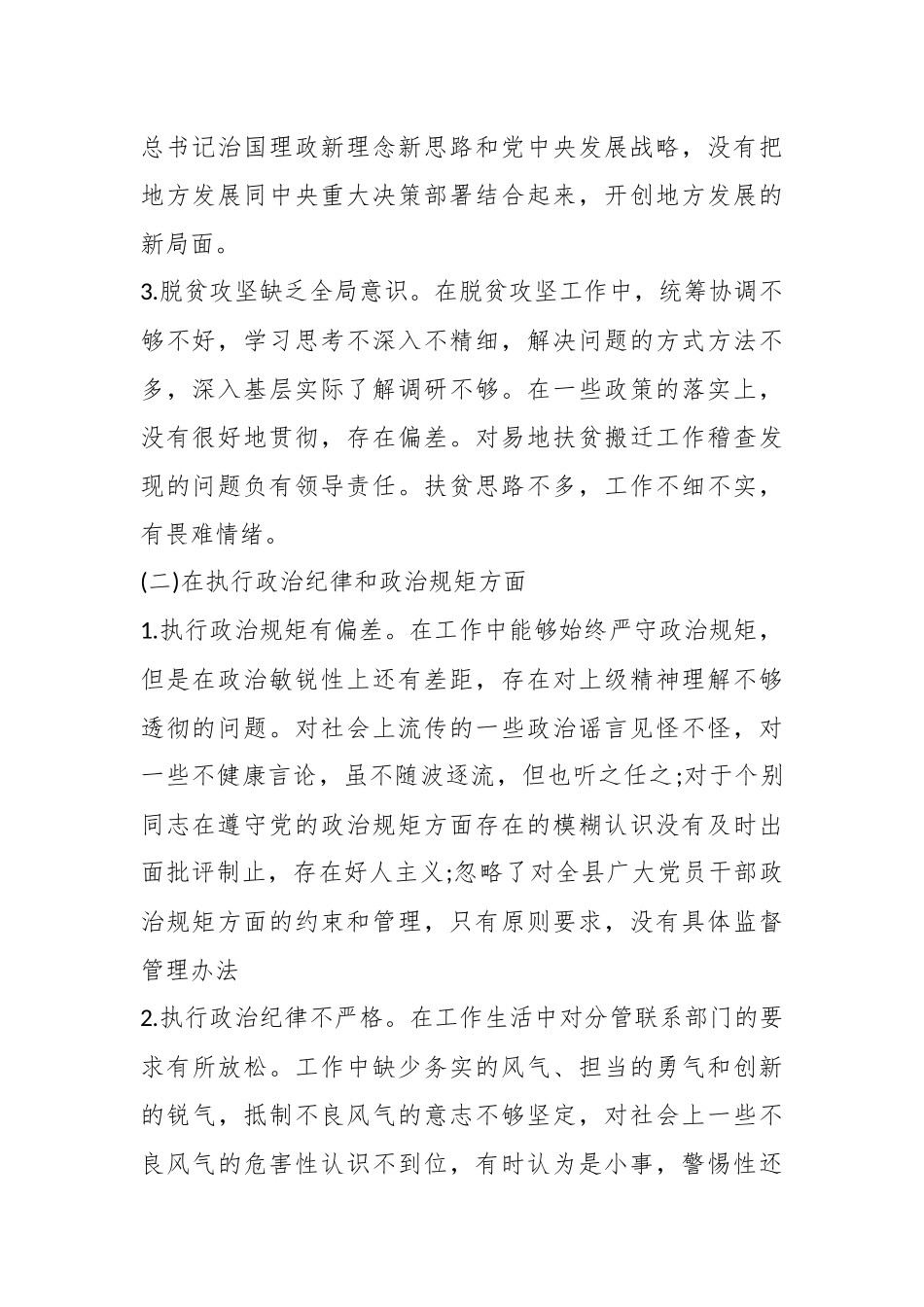 整改民主生活会对照材料(6篇)篇1一、存在的突出问题(一)在学习贯彻习近平总书记系列重要讲话精神和中央部署要求方面1.学习贯彻不到位,政治站位不高。在平时的工作学习中,存在重业务学习和党的方针政策学习,轻党的理论学习的情况。尤其是在学习贯彻习近平总书记系列重要讲话精神和治国理政新理念新思路新战略及考察云南重要讲话精神中,存在不够深入、系统、全面等问题,学习存在“应付式”“作业式”的学习心态,研究不深,理解不透,导致了政治上站位不高,没有真正用党的创新理论武装头脑、指导实践、推动工作。2.政治理论学习不深入。由于理论学习不到位,导致思想认识和工作方法存在一定的片面性,学习只是满足于会议文件,没有始终坚持以“四个意识”作为指导日常工作学习的政治标杆。工作中能够坚持正确的政治方向,但在具体的工作中,大局意识不强,没有深刻领会习近平总书记治国理政新理念新思路和党中央发展战略,没有把地方发展同中央重大决策部署结合起来,开创地方发展的新局面。3.脱贫攻坚缺乏全局意识。在脱贫攻坚工作中,统筹协调不够不好,学习思考不深入不精细,解决问题的方式方法不多,深入基层实际了解调研不够。在一些政策的落实上,没有很好地贯彻,存在偏差。对易地扶贫搬迁工作稽查发现的问题负有领导责任。扶贫思路不多,工作不细不实,有畏难情绪。(二)在执行政治纪律和政治规矩方面1.执行政治规矩有偏差。在工作中能够始终严守政治规矩,但是在政治敏锐性上还有差距,存在对上级精神理解不够透彻的问题。对社会上流传的一些政治谣言见怪不怪,对一些不健康言论,虽不随波逐流,但也听之任之;对于个别同志在遵守党的政治规矩方面存在的模糊认识没有及时出面批评制止,存在好人主义;忽略了对全县广大党员干部政治规矩方面的约束和管理,只有原则要求,没有具体监督管理办法2.执行政治纪律不严格。在工作生活中对分管联系部门的要求有所放松。工作中缺少务实的风气、担当的勇气和创新的锐气,抵制不良风气的意志不够坚定,对社会上一些不良风气的危害性认识不到位,有时认为是小事,警惕性还不够高,落实制度、执行政策监督管理不到位。(三)在组织生活方面1.贯彻党的组织生活制度不够严格。“三会一课”制度落实不彻底,满足于上级要求的“规定动作”,内容比较单一,缺乏创新性。比如,领导班子成员给所在支部上专题党课只局限于上传下达,以读报纸、学文件的政治学习为主,内容没有联系改革、发展的形势,没有联系政研工作实际特别是没有联系党员干部的思想工作实际。2.党内政治生活不严肃。平时忙于具体工作,总感觉时间紧,没有主动参加基层党组织会议,与班子成员、与分管部门主要负责人交流沟通不充分,平时只是通过集中学习或者开会时进行交流,没有主动利用其他方式与班子成员交换工作意见,导致与班子成员的沟通少。注重出勤而不重视效果,有时候发言没有经过仔细推敲,只是照本宣科走走过场。3.双重组织生活没有落实到位。有时因时间关系没有及时参加党组织的学习活动。比如,对一些文件的学习,看下标题,了解下大框架,一知半解,精深度没有把握;干部在线网络学习,自己没有实实在在的完成,时限临近,安排工作人员代学,满足于学够学分就行。(四)在作风建设方面1.工作作风有待改进。对一些分管联系工作,在具体环节和内容上花的时间和精力不多,统筹协调不足,解决问题少督促落实和跟踪问效少。在一些实际工作过程中,由于工作繁忙,未能深入基层、深入实际,未能及时了解新情况新问题。没有牢固树立从群众的智慧、群众的创造中寻找工作思路和新鲜经验的意识,只注重了解自己想要了解的问题,没有关心群众想什么、盼什么、急什么、要什么,全心全意为人民服务的宗旨意识不强。2.开拓进取精神不足。面对全县改革、发展、稳定以及脱贫攻坚中的焦点、难点问题,思考不多、研究不深,创新突破不够、办法措施不多。面对一些复杂矛盾和攻坚任务深层次的分析、思考不够,害怕工作失误、冒风险,担心踩到红线、触犯规则,把“不出事”作为最大原则,勇往直前的冲劲和进取上进的动力不足。3.教育分管部门和工作人员不严。对一些分管联系部门及工...