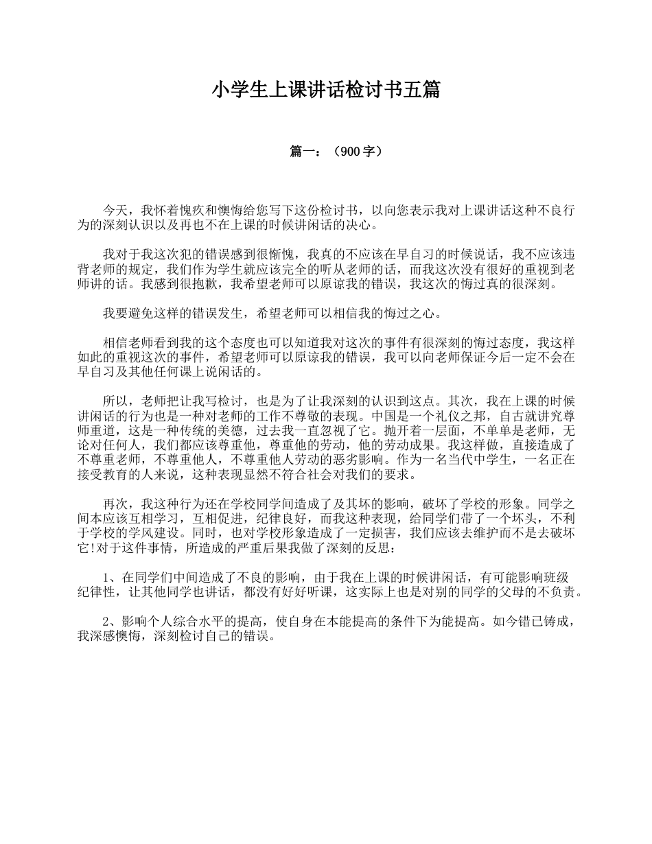 小学生上课讲话检讨书五篇篇一:(900字)今天,我怀着愧疚和懊悔给您写下这份检讨书,以向您表示我对上课讲话这种不良行为的深刻认识以及再也不在上课的时候讲闲话的决心。我对于我这次犯的错误感到很惭愧,我真的不应该在早自习的时候说话,我不应该违背老师的规定,我们作为学生就应该完全的听从老师的话,而我这次没有很好的重视到老师讲的话。我感到很抱歉,我希望老师可以原谅我的错误,我这次的悔过真的很深刻。我要避免这样的错误发生,希望老师可以相信我的悔过之心。相信老师看到我的这个态度也可以知道我对这次的事件有很深刻的悔过态度,我这样如此的重视这次的事件,希望老师可以原谅我的错误,我可以向老师保证今后一定不会在早自习及其他任何课上说闲话的。所以,老师把让我写检讨,也是为了让我深刻的认识到这点。其次,我在上课的时候讲闲话的行为也是一种对老师的工作不尊敬的表现。中国是一个礼仪之邦,自古就讲究尊师重道,这是一种传统的美德,过去我一直忽视了它。抛开着一层面,不单单是老师,无论对任何人,我们都应该尊重他,尊重他的劳动,他的劳动成果。我这样做,直接造成了不尊重老师,不尊重他人,不尊重他人劳动的恶劣影响。作为一名当代中学生,一名正在接受教育的人来说,这种表现显然不符合社会对我们的要求。再次,我这种行为还在学校同学间造成了及其坏的影响,破坏了学校的形象。同学之间本应该互相学习,互相促进,纪律良好,而我这种表现,给同学们带了一个坏头,不利于学校的学风建设。同时,也对学校形象造成了一定损害,我们应该去维护而不是去破坏它!对于这件事情,所造成的严重后果我做了深刻的反思:1、在同学们中间造成了不良的影响,由于我在上课的时候讲闲话,有可能影响班级纪律性,让其他同学也讲话,都没有好好听课,这实际上也是对别的同学的父母的不负责。2、影响个人综合水平的提高,使自身在本能提高的条件下为能提高。如今错已铸成,我深感懊悔,深刻检讨自己的错误。3、思想觉悟不高,对错误的认识不足,试想如果当时我就认识到此事的严重性,错误就不可能发生。之所有的问题都归咎于我还为能达到一个现代中学生应具有的认识问题水平,为能对老师的辛勤劳作作出回报,我越来越清晰的感觉到自己所犯的错误的严重性,为此,我一定会在以后的几年里更严格地要求自己,在认真完成作业,在上课的时候绝对不讲闲话地同时,使自己的言行都与一个现代中学生相符合。篇二:(400字)好好学习,遵守校纪校规是我们每个学生应该做的,也是中华民族的优良传统美德,但我却没有做到。首先,造成音乐课讲话最直接的原因是自我约束力差,上课思想开小差,觉得没事可做;不免相互交流,说话声音无所顾忌之时,就影响了上课。鲁迅先生说过……歌德也说……我们只有认真反思,寻找错误后面的深刻根源,认清问题的本质,才能给集体和自己一个交待,从而得以进步。这次讲话违反了课堂纪律,影响了老师的工作,又辜负了父母对我殷切希望。更让老师您为此事殚精竭虑,伤心失望……,在写此检讨之时,我深感自己的无知,后悔之极。上课不遵守纪律,决不是一件可忽略的小事!说明我没有很好的约束能力、自主学习能力!我们只有认认真真思考人生有那么多事要做,那么多的担子要挑,就没有理由在课堂上不遵守纪律了。虽然怀着沉重复杂的心情写这篇检讨,但还是写得不好,只怪自己才疏学浅,不能更好的运用我们深厚的汉语言文化,敬请老师谅解。为了感谢老师的淳淳教导,我一定会吸取这次教训,绝不让老师失望。请老师谅解我这一次的错误。篇三:(600字)这个星期是开学的第一个星期,所以我个人的整体感觉还是处于过年的兴奋当中,刚开学,和同学们见面难免会聊一些过年的事情,所以我上晚自习的时候和旁别的人说话,聊一些关于我们过年的事和比谁今天得到的压岁钱多,事情是这样地,昨天晚上上晚自习,由于老师布置作业都写完了,所以我就感到有些无聊,便想和旁别的人聊一下,虽然我知道这样是不对的,但我依然犯罪了,我说了一句,这年的年真难过啊,没有多少压岁钱,我只领到1500多,真是太少了,谁知旁边的人说了一句1500?这么多,你都嫌少,我才8...