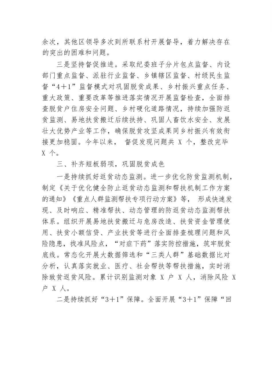 某县巩固拓展脱贫攻坚成果同乡村振兴有效衔接工作总结近年来,在市委、市政府的坚强领导下,县坚持以习近平新时代中国特色社会主义思想和党的二十大精神为指导,深入贯彻落实习近平总书记视察四川重要讲话,抢抓国家重点支持“X”和省上倾力支持“X”建设的重大机遇,全力推进脱贫攻坚成果同乡村振兴有效衔接,预计今年全县农村年人均纯收入达到X元,同比增长X,脱贫群众年人均纯收入达到X元,同比增长X,夯实了乡村振兴基础。一、持续压实责任,狠抓工作落实一是夯实工作体系。夯实“县领导—帮村书记一乡镇(街道)包村领导—第一书记—驻村工作队—村‘两委’成员”的“六位一体”抓乡村振兴的梯队体系。对X个脱贫村、乡村振兴示范村、易地扶贫搬迁社区精准选派村驻村干部X人,保持脱贫户帮扶责任稳定,实现接续帮扶力量不减弱,为巩固拓展脱贫攻坚同乡村振兴有效衔接提供硬核支撑。二是压实党政责任。严格落实“党政一把手”负责制,按照“五级书记”抓乡村振兴要求,继续保持主要领导亲自抓,乡村振兴工作领导小组牵头抓,分管领导具体抓,各部门分工明确、责任到位、任务具体的责任体系。共召开县委常委会、县委农村工作暨乡村振兴领导小组会、专题会、调度会等X次。县委、县政府主要领导到乡镇(街道)督导X余次,其他区领导多次到所联系村开展督导,着力解决存在的突出的困难和问题。三是坚持督促推进。采取纪委班子分片包点监督、内设部门重点监督、派驻行业监督、乡镇辖区监督、村级民生监督“4+1”监督模式对巩固脱贫成果、乡村振兴重点任务、重大政策、重要改革等推进落实情况开展监督检查,全面排查脱贫户住房安全问题、乡村硬化道路情况,持续加强防返贫监测、易地扶贫搬迁后续扶持、巩固人畜饮水安全、发展壮大优势产业等工作,确保脱贫攻坚成果同乡村振兴有效衔接更加稳固。今年以来,督促发现问题共X个,整改完毕X个。三、补齐短板弱项,巩固脱贫成色一是持续抓好返贫动态监测。进一步优化防贫监测机制,制定《关于优化健全防止返贫动态监测和帮扶机制工作方案的通知》《重点人群监测帮扶专项行动方案》等,形成快速发现、及时响应、精准帮扶、动态管理的防返贫动态监测帮扶体系。组织开展易地扶贫搬迁与危房改造、扶贫资金管理使用、扶贫小额信贷、产业扶贫等进行全面排查梳理问题和风险隐患,找准风险点,“对症下药”落实防控措施,筑牢脱贫底线。常态化开展大数据筛选和“三类人群”基础数据比对分析,认真落实就业、医疗、社会帮扶等帮扶措施,实时消除致贫返贫风险。累计识别监测对象X户X人,消除风险X户X人。二是持续抓好“3+1”保障。全面开展“3+1”保障“回头看”专项行动,排查农户X户X人,其中脱贫户X户,监测对象X户。教育保障方面:严格执行“双线”责任制和“七长”负责制,确保控辍保学动态清零;持续抓好送教上门,保障三残儿童少年入学;全面落实学前教育、义务教育、普通高中(中职)、普通高校等国家资助政策。医疗保障方面:全县X万脱贫人口全部纳入“三重制度”保障范围。强化参保征缴,落实特殊人群的动态参保、应保尽保。落实脱贫户大病家庭医生签约应签尽签X人,慢病签约X人。住房保障方面:开展农村自建房安全隐患排查X万栋,建立管理台账,对农户住房保障情况实施常态化监测,发现问题立行立改。饮水安全保障方面:定期对全县x个农村饮用水源开展水质取样监测,确保群众用上安全水、放心水。三是持续抓好易地搬迁后续扶持。围绕易地扶贫搬迁“五个体系”,出台《x易地扶贫搬迁新增人口住房保障实施方案》等政策文件。投入X万元实施安置点基础设施项目X个,投入X万元开展就业培训,培训劳动力X人,实现就业X人,“零就业”家庭动态清零;整合东西部协作资金X万元新建帮扶车间X个,解决就业X人,真正让搬迁群众稳得住、有就业、逐步能致富。四、培育壮大产业,夯实振兴基础一是做好“加”法。按照“X”的目标定位,突出抓好绿色蔬菜、优质稻米、生态畜牧、茶叶、中药材、经果林六大优势产业,全面建设现代农业样板区。深入打造农村一二三产融合发展,着力推进全区农业全产业链、全供应链、全价值链建设,将十里五万亩高标准蔬菜基地成功创...