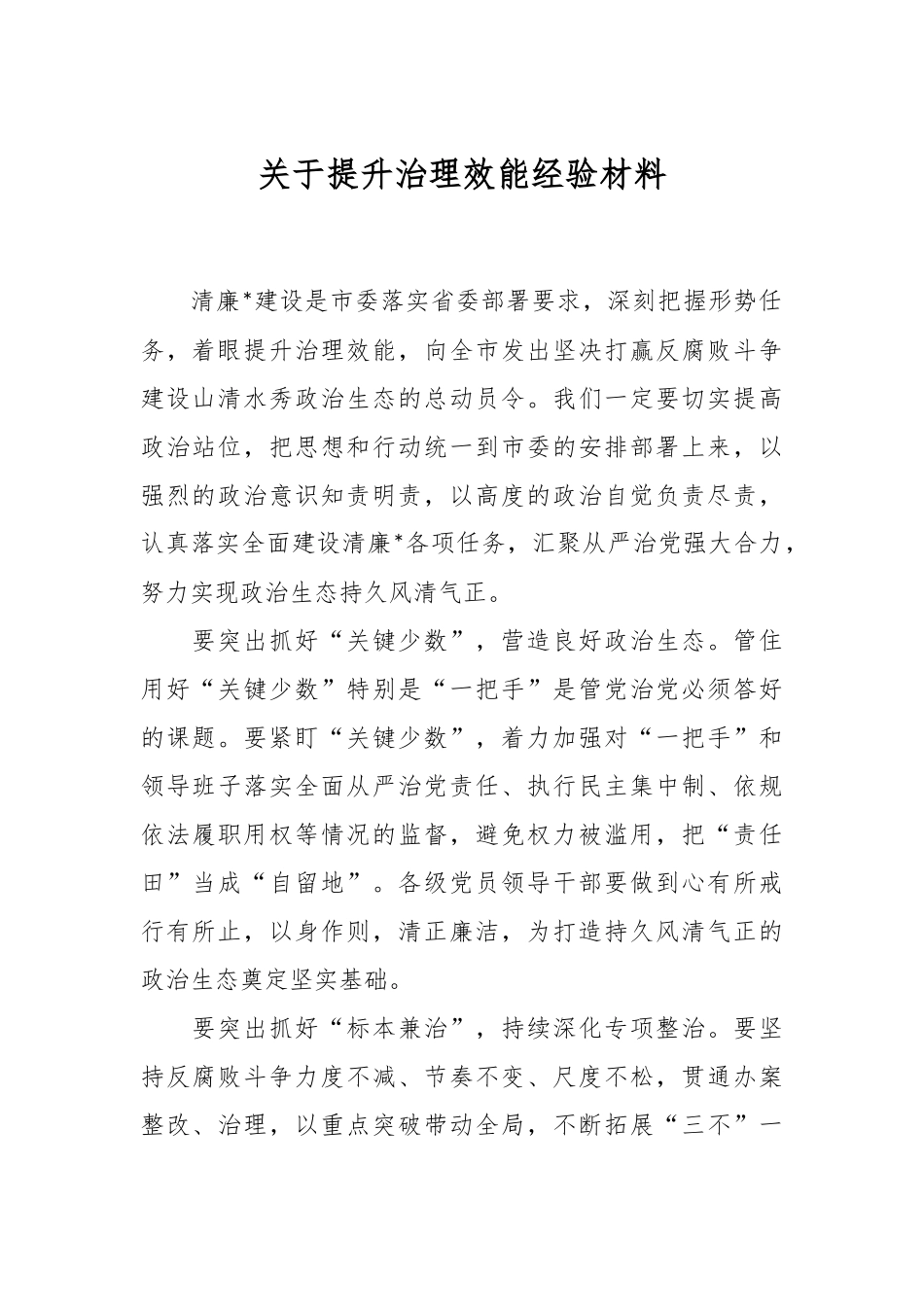关于提升治理效能经验材料清廉*建设是市委落实省委部署要求,深刻把握形势任务,着眼提升治理效能,向全市发出坚决打赢反腐败斗争建设山清水秀政治生态的总动员令。我们一定要切实提高政治站位,把思想和行动统一到市委的安排部署上来,以强烈的政治意识知责明责,以高度的政治自觉负责尽责,认真落实全面建设清廉*各项任务,汇聚从严治党强大合力,努力实现政治生态持久风清气正。要突出抓好“关键少数”,营造良好政治生态。管住用好“关键少数”特别是“一把手”是管党治党必须答好的课题。要紧盯“关键少数”,着力加强对“一把手”和领导班子落实全面从严治党责任、执行民主集中制、依规依法履职用权等情况的监督,避免权力被滥用,把“责任田”当成“自留地”。各级党员领导干部要做到心有所戒行有所止,以身作则,清正廉洁,为打造持久风清气正的政治生态奠定坚实基础。要突出抓好“标本兼治”,持续深化专项整治。要坚持反腐败斗争力度不减、节奏不变、尺度不松,贯通办案整改、治理,以重点突破带动全局,不断拓展“三不”一体推进广度深度。要持续深化专项整治,研究透具体问题,精准识别,找准关键点,打在要害处,增强针对性,突出效果导向,尤其对群众深恶痛绝、反映强烈的问题出重拳,力求立竿见影。尤其要将专项行动中形成的好思路、好措施、好办法固化为常态化好机制,推动清廉*建设取得实效。要突出抓好“细胞工程”,夯实清廉*根基。要根据省委的部署,全面推进清廉机关、清廉企业、清廉学校、清廉医院、清廉村居创建,各级党组织要高站位谋划、高标准推进,努力形成上下贯通、左右联动、齐抓共管的工作格局,让清廉理念措施覆盖各行各业。要融通党的优良传统、中华优秀传统文化、社会主义先进文化和*独有的优秀历史文化、红色文化、廉政文化,以文化人、以廉润心、成风成俗,夯实全面建设清廉*根基。全面建设清廉*,事关全局、事关长远。让我们进一步增强全面建设清廉*的思想自觉和行动自觉,从严从实抓好清廉*建设,努力实现全市政治生态风清气正,以全面建设清廉*引领高质量发展。