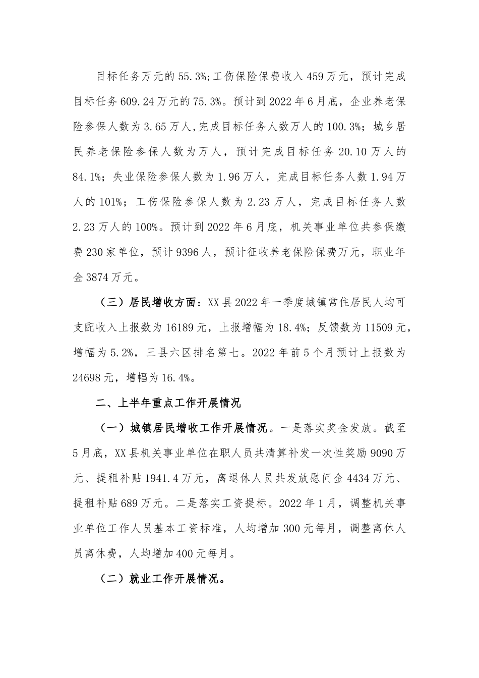 县人社局2022年上半年工作总结及下半年工作计划2022年上半年,XX县人社局按照县委、县政府工作要求,以习新时代中国特色社会主义思想为指导,全面贯彻党的十九大和十九届二中、三中、四中、五中、六中全会精神,坚持以人民为中心的发展思想,为扎实推动人社事业实现高质量发展积极谋划、加强调度,保证了各项工作有序高效推进。现将有关情况汇报如下:一、主要指标完成情况(一)就业创业方面:城镇新增就业3190人,完成人目标任务的70.89%;失业人员再就业1240人,完成人目标任务的55.11%;失业人员再就业率65.58%,目标任务60%;就业困难人员就业158人,完成375人目标任务的;就业困难人员就业帮扶就业率96%,目标任务70%;高校毕业生就业见习岗位开发201个,完成350个目标任务的47.43%;高校毕业生就业见习18人,完成140人目标任务的12.86%;创业担保贷款1081万元,完成2800万元目标任务的38.61%;新增技能人才527人,完成1500人目标任务的35.13%;开展补贴性职业技能培训2068人,完成人目标任务的41.36%;企业新录用人员岗前技能培训人,完成目标任务2300人的53.52%;农民工参加技能培训人,完成目标任务3000人的63.1%。(二)社会保险方面:预计到2022年6月底,企业职工基本养老保险保费收入15358万元,预计完成目标任务万元的66.7%;城乡居民养老保险保费收入万元;失业保险保费收入578万元,预计完成目标任务万元的55.3%;工伤保险保费收入459万元,预计完成目标任务609.24万元的75.3%。预计到2022年6月底,企业养老保险参保人数为3.65万人,完成目标任务人数万人的100.3%;城乡居民养老保险参保人数为万人,预计完成目标任务20.10万人的84.1%;失业保险参保人数为1.96万人,完成目标任务人数1.94万人的101%;工伤保险参保人数为2.23万人,完成目标任务人数2.23万人的100%。预计到2022年6月底,机关事业单位共参保缴费230家单位,预计9396人,预计征收养老保险保费万元,职业年金3874万元。(三)居民增收方面:XX县2022年一季度城镇常住居民人均可支配收入上报数为16189元,上报增幅为18.4%;反馈数为11509元,增幅为5.2%,三县六区排名第七。2022年前5个月预计上报数为24698元,增幅为16.4%。二、上半年重点工作开展情况(一)城镇居民增收工作开展情况。一是落实奖金发放。截至5月底,XX县机关事业单位在职人员共清算补发一次性奖励9090万元、提租补贴1941.4万元,离退休人员共发放慰问金4434万元、提租补贴689万元。二是落实工资提标。2022年1月,调整机关事业单位工作人员基本工资标准,人均增加300元每月,调整离休人员离休费,人均增加400元每月。(二)就业工作开展情况。一是服务企业用工,促进劳动力就业。推进“春季攻坚”行动:“三单三送三激励”工作法被省、市、县采用。建立“三单”。建立125家企业用工需求清单近2000个岗位;建立就业意向人员清单5000余人;建立就业人员清单2000余人。开展“三送”。“送岗到人”,通过多种方式将就业岗位推送至劳动者;“送人到岗”,组建7个工作专班,根据企业用工需求和劳动者本地就业意愿,开通“就业直通车”,分批观摩重点企业,实现“点对点”对接,已开展送人到岗5000余人次;“送策到企”,出台惠企稳定就业政策并开展送策到企,为企业开展政策解读。实行“三激励”。激励返乡务工,进入我县重点工业企业且连续新参加社保满12个月的员工,按照个人12个月社保缴费部分的50%进行一次性补贴;激励企业留工,重点工业企业吸纳新员工且购买12个月社保的,按照企业12个月社保缴费部分的50%进行一次性补贴;激励平台招工,乡镇基层平台、人力资源机构和中间介绍人组织介绍员工进入我县重点工业企业就业且连续新参加社保满6个月享受800元补贴,满12个月享受1500元补贴。开展常态化招聘:采取政府购买服务方式,强化人力资源市场建设,面向社会公开招标,委托第三方人力资源机构(XX市彩虹桥人力资源管理公司)在我县常态化开展各项招聘活动及人力资源市场的日常管理。在固定办公区域内承接“2+N”招聘活动,宣传企业用工信息,使广大劳动者能够方便快捷地了解就业岗位,促进劳动者前往企业实现就业。开展招聘会场次36场,现...