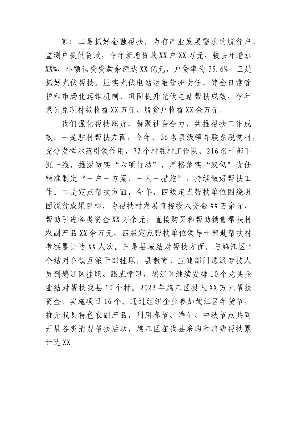 县乡村振兴局2023年工作总结一、政府工作报告重点任务完成情况防返贫监测帮扶方面,我们县乡联动、部门协同,真抓实干坚守不发生规模性返贫的底线。一是突出联动预警围绕“三保障一安全”等方面突出问题和关键信息,组织教育、医保、民政、住建等14家行业部门筛选比对预警信息2.48万条,反馈至乡镇、村研判核实;二是突出集中排查。组织驻村工作队、村干部、网格员采取“全面排查+重点突出”的方式,对全县XX万户农户进行全面排查,对新识别整户低保、突发严重困难户等对象重点核查,2023年已新增监测对象XX户XX人,制定并落实措施XX条,有效化解了各类返贫风险;三是突出重点帮扶。紧盯人均纯收入“低于1万元”和“较上年下降”的脱贫人口两类重点群体,实行一户一策帮扶。“三保障一安全”上,今年实施农村危房改造XX户,资助困难学生XX万人次、XX万元,脱贫户、监测户基本医保参保率100%,实施农村安全饮水工程227处改善提升XX万人饮水质量。衔接资金项目管理方面,我们紧盯目标、求变创新,强化工作指导力促项目提质增效。一是立足优势资源抓好项目谋划。围绕县委、县政府提出的重点支持“两茶一虾”基地建设,培育创建产业园、田园综合体等乡村振兴示范的要求,坚持“集中力量办大事”原则,牵头组织开展2024年衔接资金项目库建设,会同财政、农业等行业主管部门开展项目论证评审,共组织项目入库160个、资金XX亿元;二是加强过程监管推进项目实施。按照“6月底50%、9月底75%、11月底100%”的进度要求,加强督导和调度,确保项目资金尽快发挥效益。今年共批复衔接资金项目301个,下达中央、省市县四级衔接资金XX亿元,其中产业项目241个、资金XX亿元,项目实施进度和资金支出进度均达到省市考核的时序进度;三是健全联农带农机制规范资产管理。按照“巩固一批、提升一批、盘活一批另起炉灶一批”的要求,健全完善项目资产运营监管和联农带农机制,开展项目资产清查、问题排查整改,进一步优化资产运营处置工作方案。有序开展了2022年项目资产确权登记,纳入资产台账管理的项目资产822个、项目资金金额XX亿元。二、重点工作开展情况我们紧盯脱贫人口稳定增收,强化产业和就业帮扶,兜牢防贫基础。一是抓好务工就业。全县共有XX万人脱贫劳动力(含监测对象XX万人)外出务工就业,超省定年度目标XX个百分点。按照每人100元标准兑现发放跨省务工交通补贴XX万元。全县开发公益性岗位XX个,在运营就业帮扶车间53个,共计带动脱贫劳动者XX人就近就业。制定出台《XX县创建乡村振兴“宜业工坊”实施方案》,组织认定第一批“宜业工坊”51家;二是抓好金融帮扶。为有产业发展需求的脱贫户、监测户提供贷款,今年新增贷款XX户XX万元,较去年增加XX%,小额信贷贷款余额达XX亿元,户贷率为35.6%。三是抓好光伏帮扶。压实光伏电站运维管护责任,健全日常管护和市场化运维机制,巩固提升光伏电站帮扶成效,今年累计兑现村级收益XX万元、脱贫户收益XX余万元。我们强化帮扶职责,凝聚社会合力,共推帮扶工作成效。一是驻村帮扶方面,今年,36名县级领导联系脱贫村,充分发挥示范引领作用,72个村驻村工作队、216名干部下沉一线,推深做实“六项行动”,严格落实“双包”责任精准制定“一户一方案、一人一措施”,持续做好帮扶工作。二是定点帮扶方面,今年,四级定点帮扶单位围绕巩固脱贫成果目标,为帮扶村发展直接投入资金XX万余元,帮助引进各类资金XX万余元,直接购买和帮助销售帮扶村农副产品XX余万元,四级定点帮扶单位领导干部赴帮扶村考察累计达XX人次。三是县域结对帮扶方面,与鸠江区5个结对乡镇互派干部挂职,县教育、卫健部门选派专技人员到鸠江区挂职、跟班学习,鸠江区继续安排10个龙头企业结对帮扶我县10个村。2023年鸠江区投入XX万元帮扶资金,实施项目16个。通过组织企业参加鸠江区年货节,推介我县特色农副产品,利用春节、端午、中秋节点共同开展各类消费帮扶活动,鸠江区在我县采购和消费帮扶累计达XX余万元。四是社会帮扶方面,广泛引导多方主体参与,抓实“万企兴万村”行动,凝聚民政、工商联、妇联、共青团等部门合力,参与助力乡村振兴。